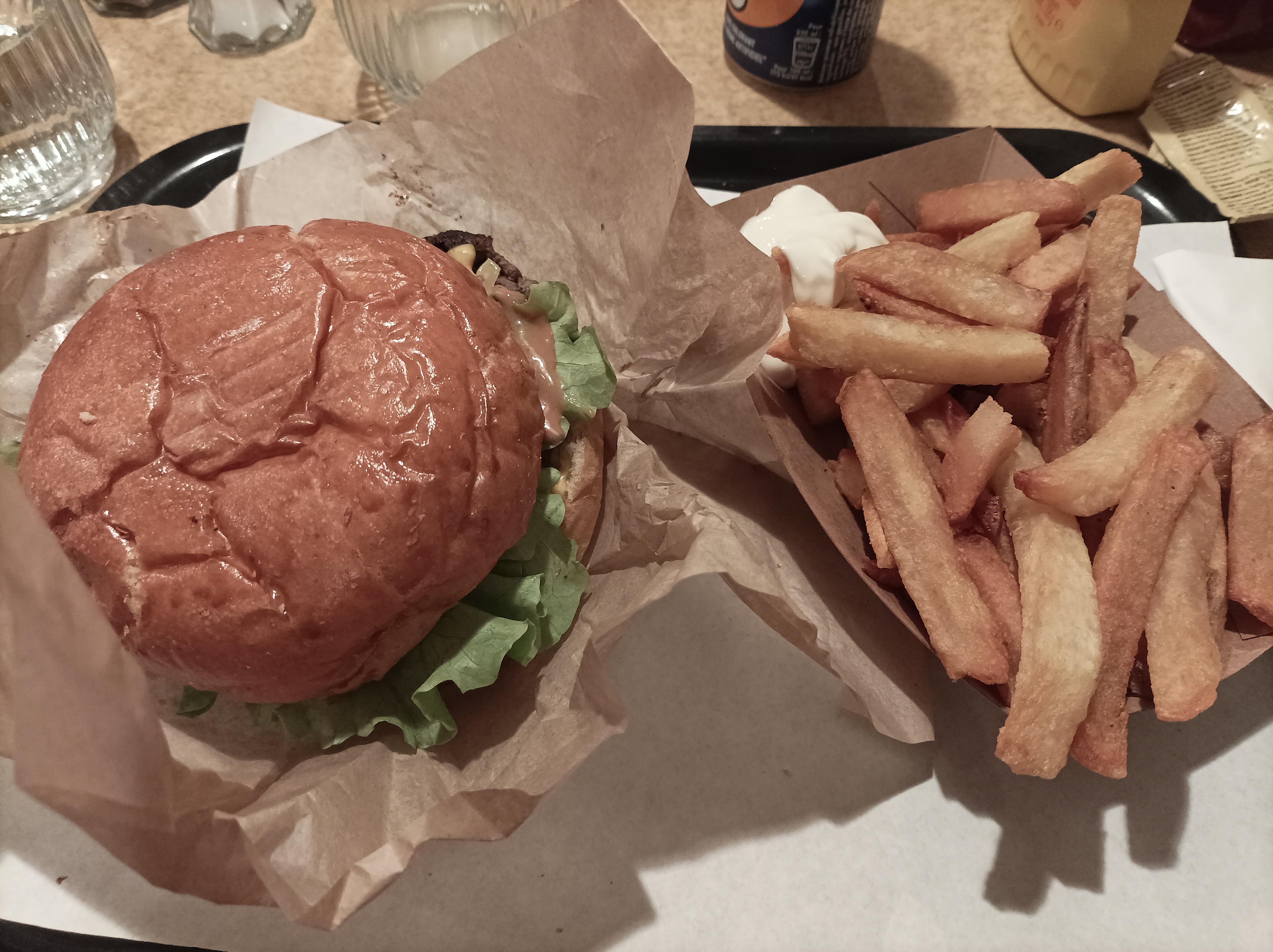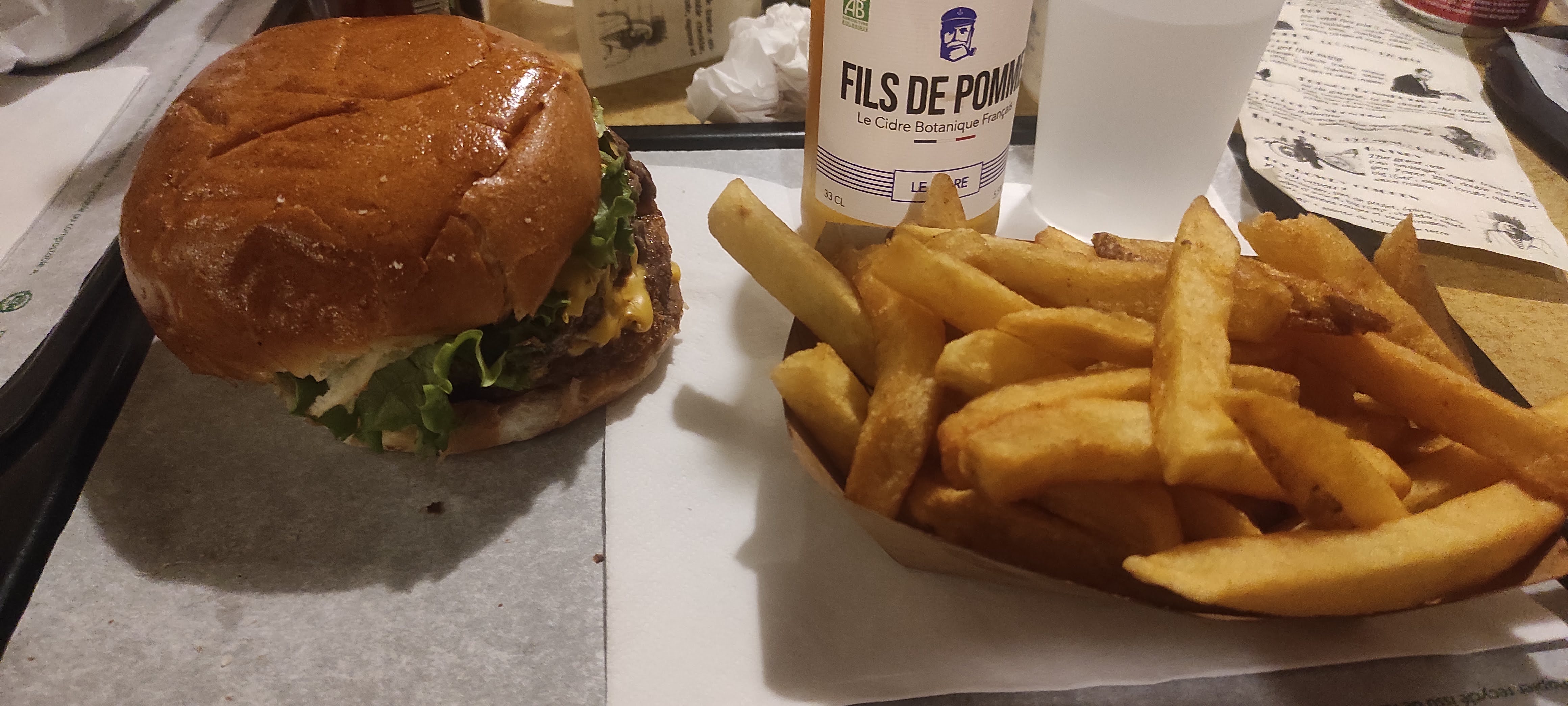 Hamburger très bon, seul bémol ont boit dans des verres en plastique comme pour pique-niquer, c'est dommage pour le prix j'aurais aimer manger au minimum dans une assiette et avoir un vrai verre mais ce qui n'enlève rien à la qualité du burger et les frites qui sont vraiment parfaite cuisson parfait... Je recommande fortement cette endroit pour manger entre amis et avoir de la qualité.