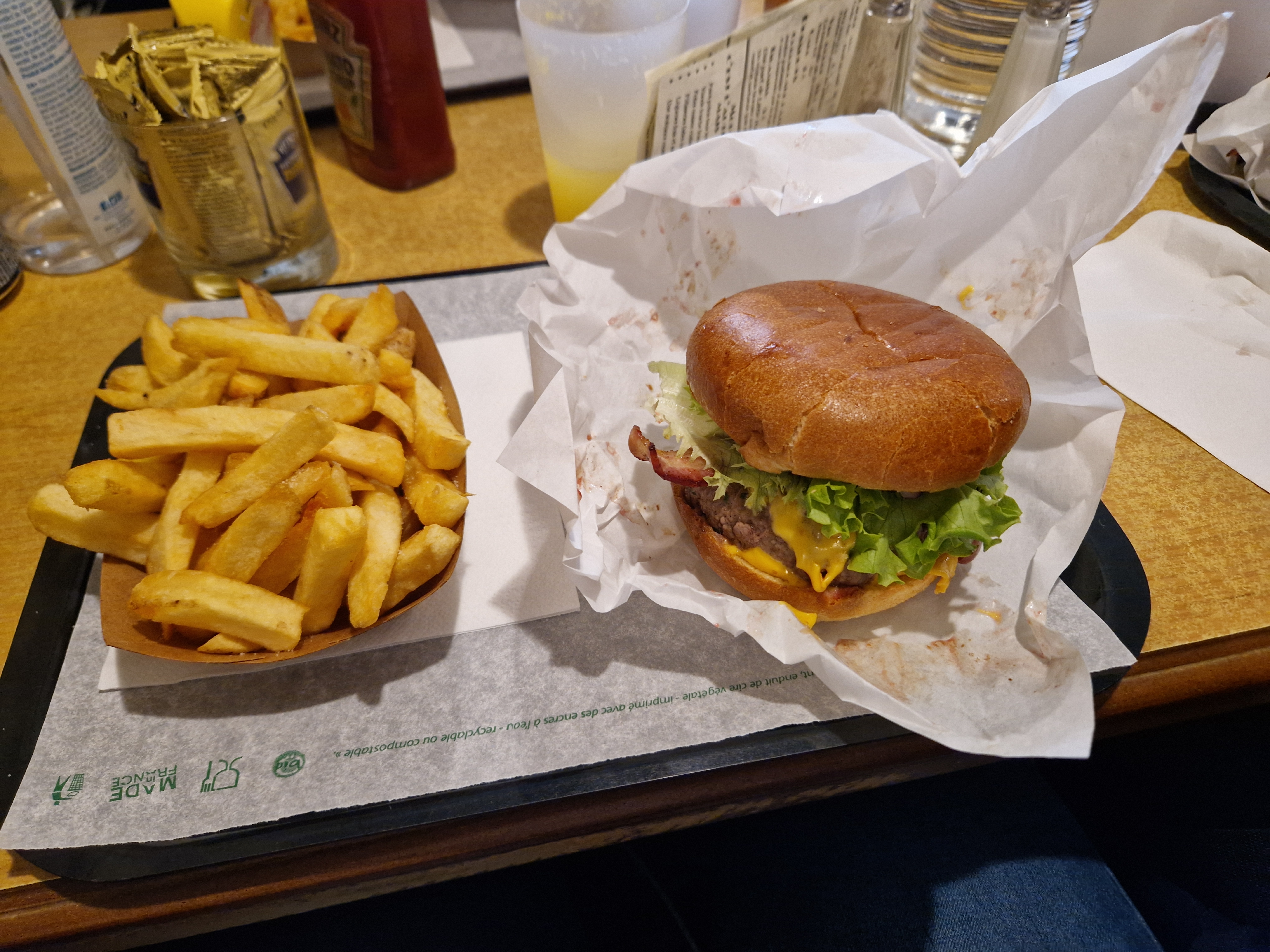 Hamburger et frites maisons, très bons ! Les quantités sont très raisonnables, on a pas faim en sortant ! Le principe fastfood est de mise : les plats sont apportés sur une feuille sur un plateau (sans assiette). Attention il faut demander les couverts (si vous en avez besoin) et les verres sont en plastiques. Mais ça se fond bien dans l'ambiance. Vous pouvez y aller 👍🏻