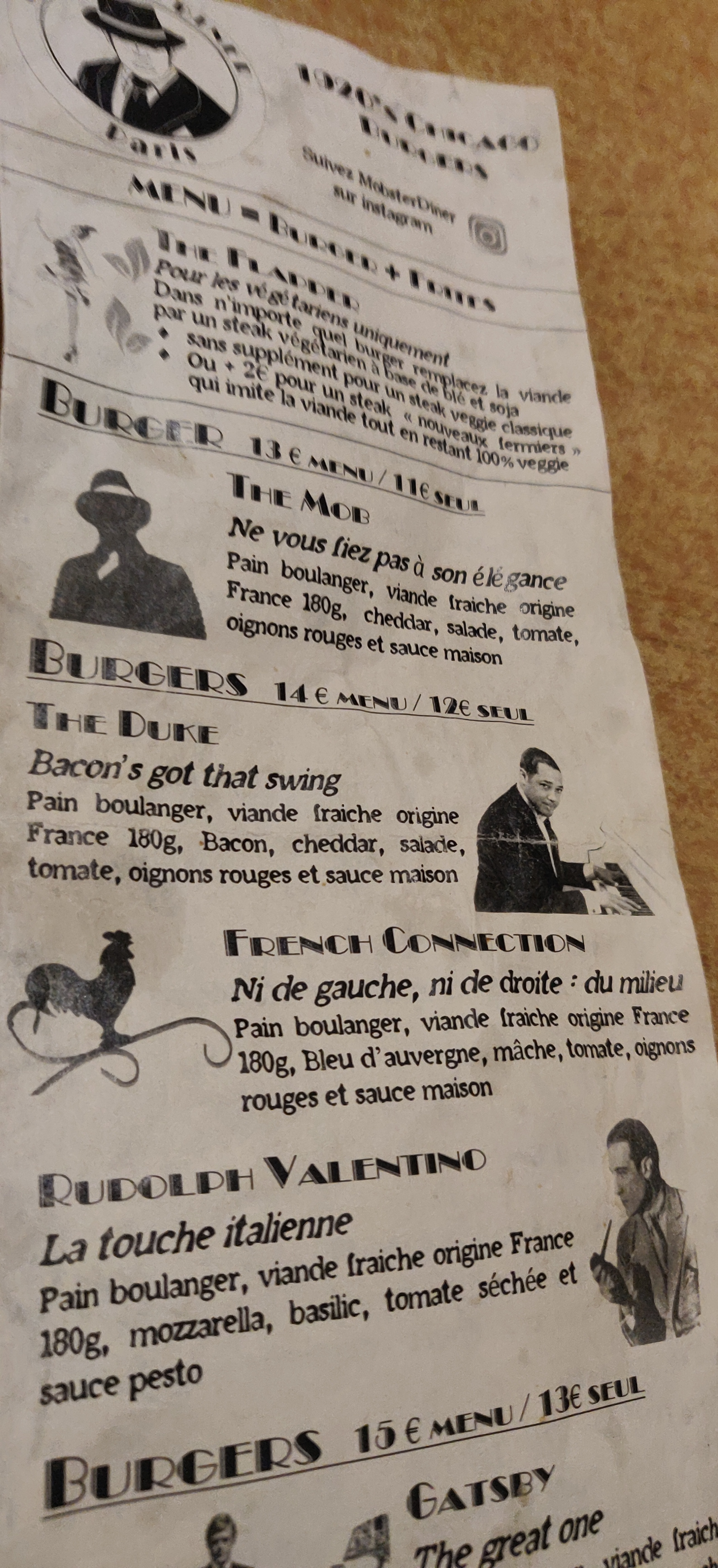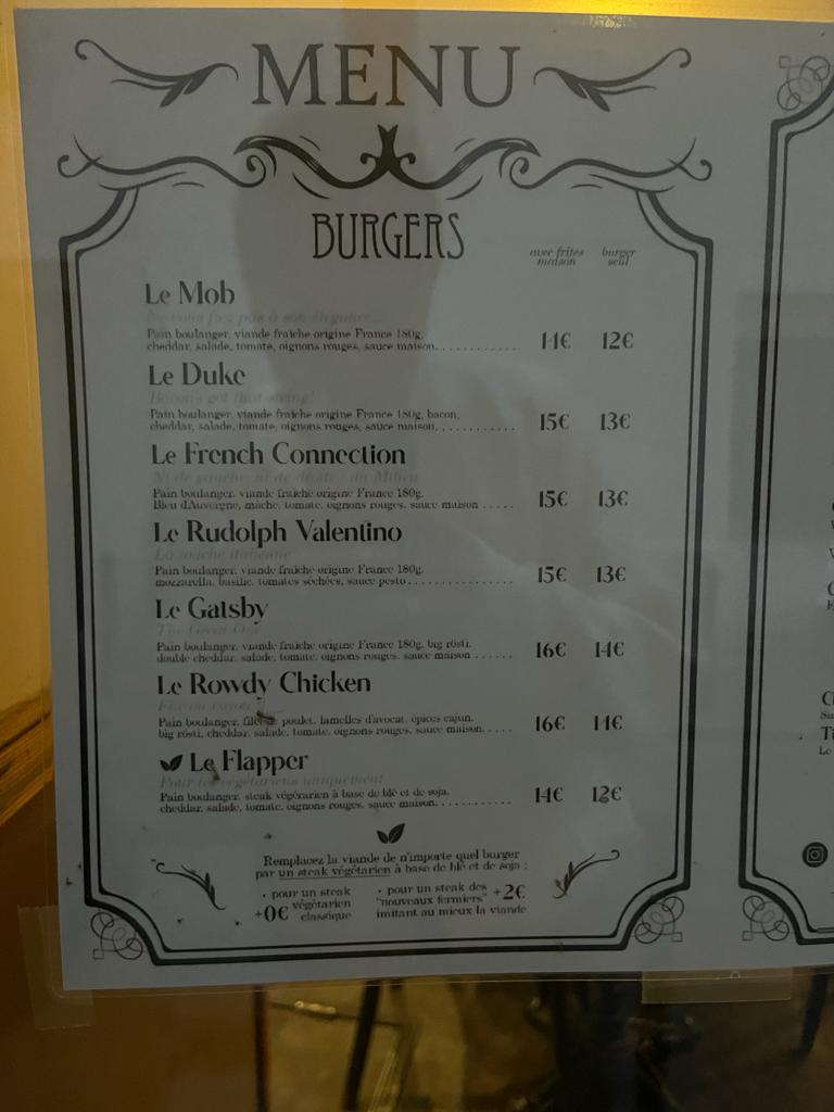 Honnetement c'était super top ! Le burger est très bon, original, j'aime l'ambiance années folles. Non vraiment les gars le concept est bon. Un gangster burger mais pas 2pac 🤷🏼♂️ je recommande, ils prennent même les tickets resto !