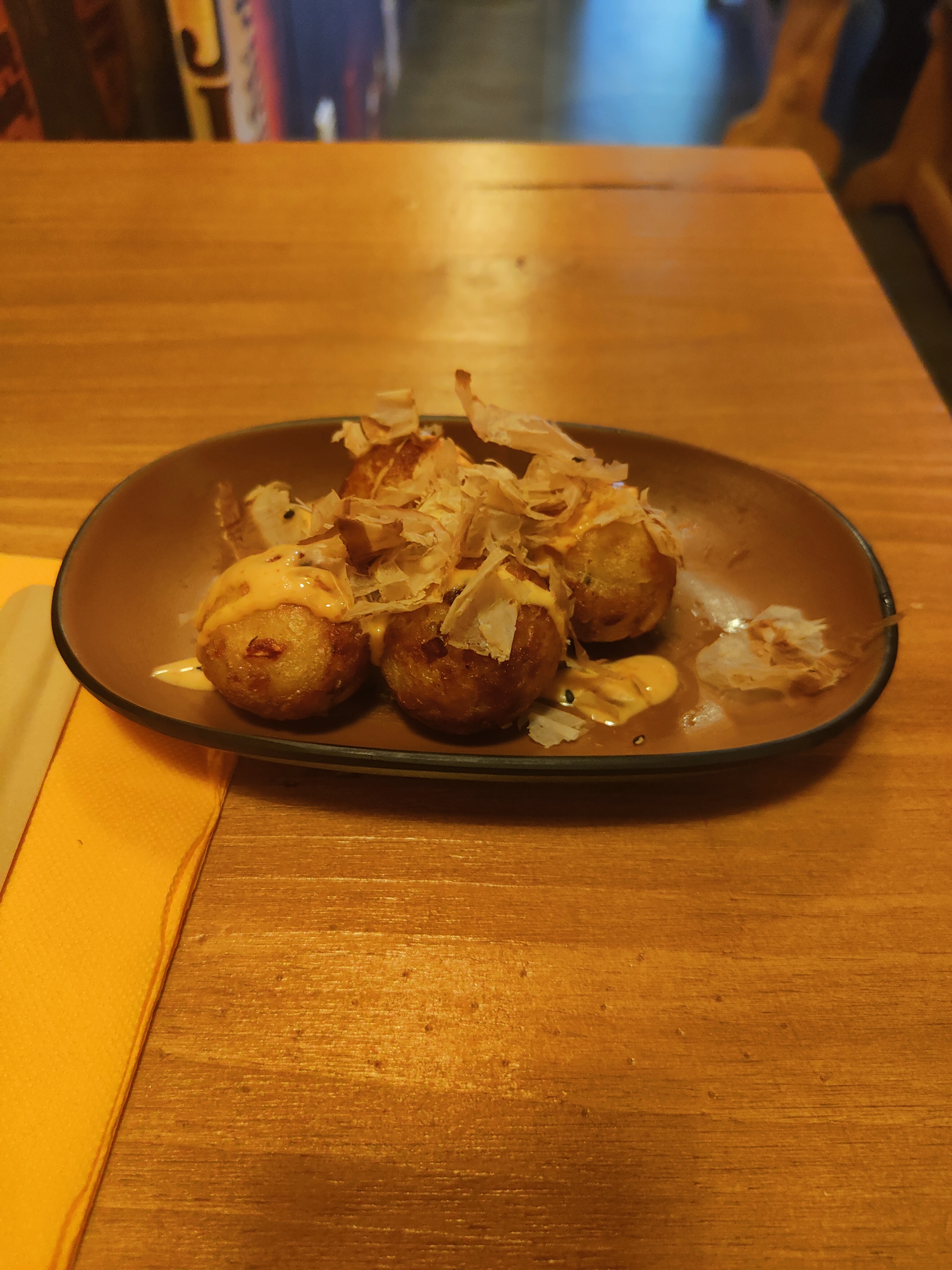 Assez déçue. Arrivés à 21h, nous avons dû attendre jusqu'à 23h pour recevoir notre commande. Nous avons observé les serveurs offrir les commandes à emporter alors qu'ils semblaient nous avoir oublié. Les takoyaki sont corrects, mais nous sommes agacés d'avoir payé aussi cher pour un morceau quasi-inexistant de poulpe et un service aussi lent.