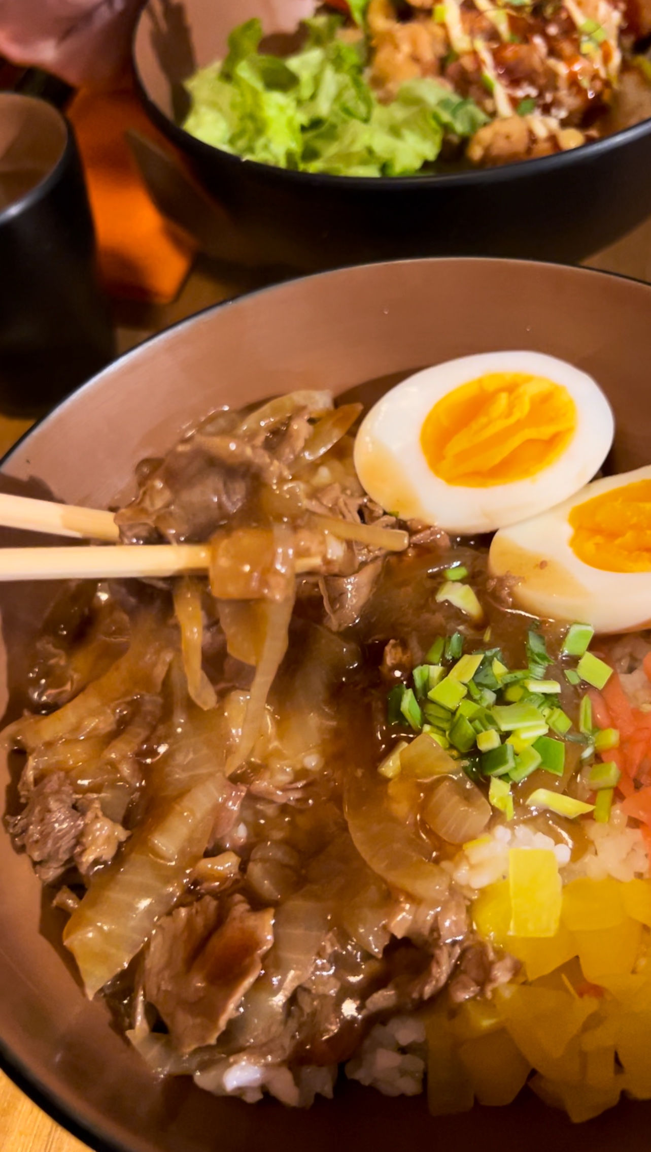 On a commandé avec mon copain les balles takiyaki (ça avait l'air d'être bon...mais pas de saveur. On commandé un ramen au porc (saveur soupe du lait et saveur medium)🫠 On a commandé un Guydon et 3 pièces de bœuf avec plein du riz 😵💫 Il pourrait être mieux.