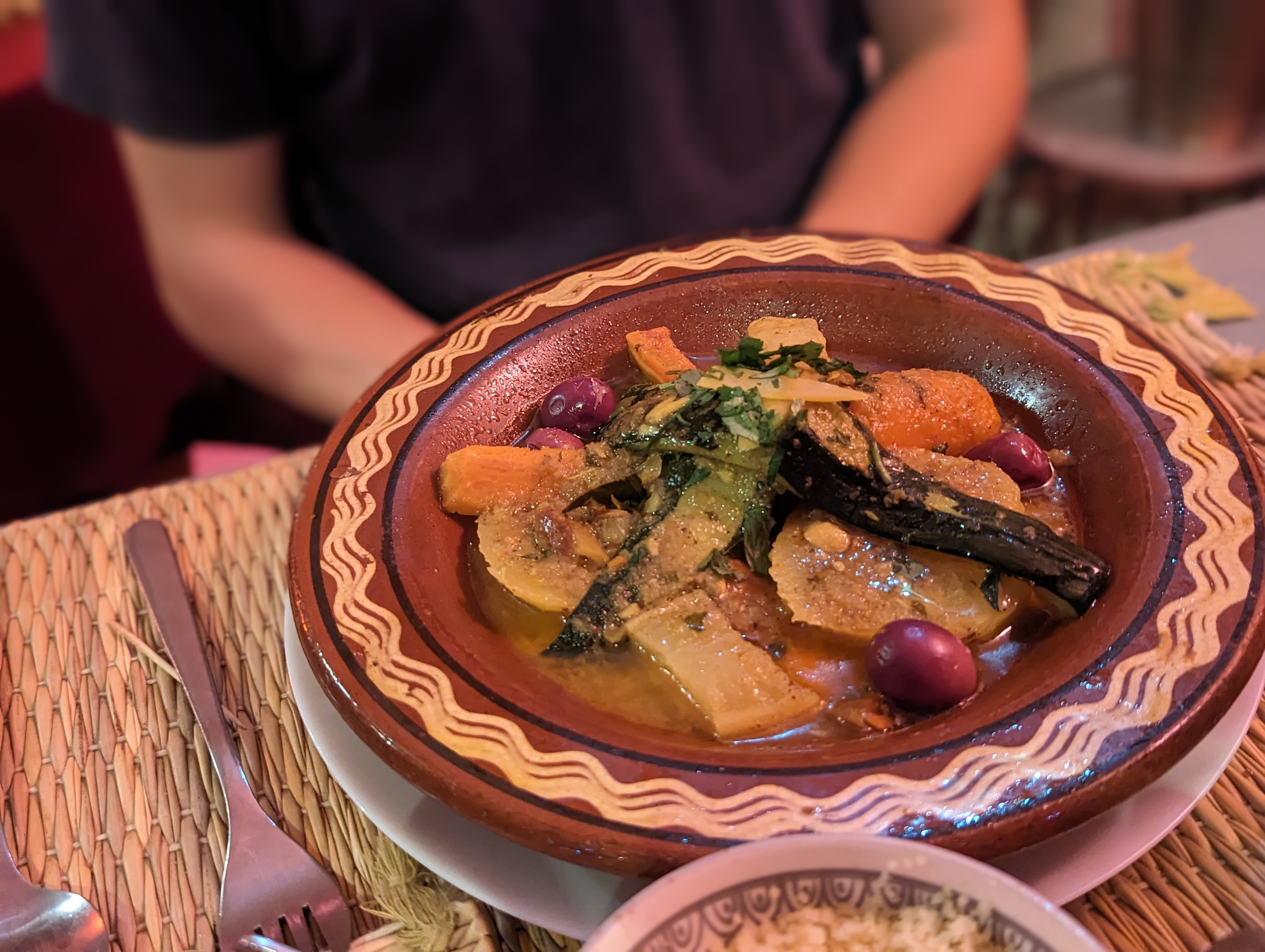 Cusine Marocaine pleinne de saveurs dans un lieux joliment décoré. Option végétarienne de Tajine avec des portions raisonnable accompagné de semoule et de pain complet.