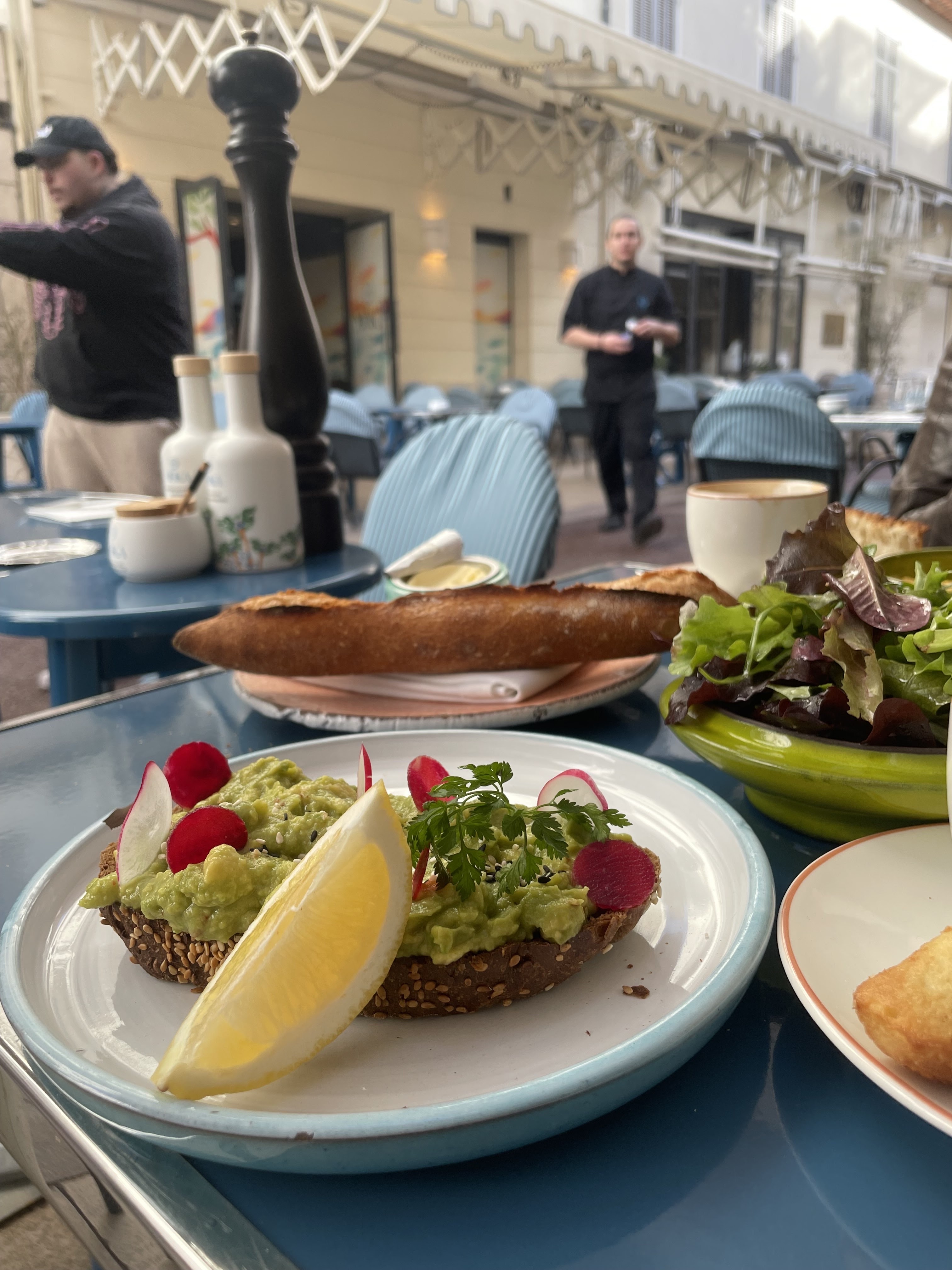 Ma femme et moi étions en promenade tôt lorsque nous avons remarqué que ce restaurant servait le petit-déjeuner. Nous étions assis tout de suite avec notre poussette. J'ai été agréablement surpris de trouver des toasts à l'avocat et du yaourt granola au menu du petit-déjeuner. Nous nous sommes assis et avons apprécié. Le service était très bon, plus rapide que les restaurants français typiques. Le prix est plus élevé mais pas mal étant donné l'emplacement à un pâté de maisons entre la plage et la rue d'Antibes.