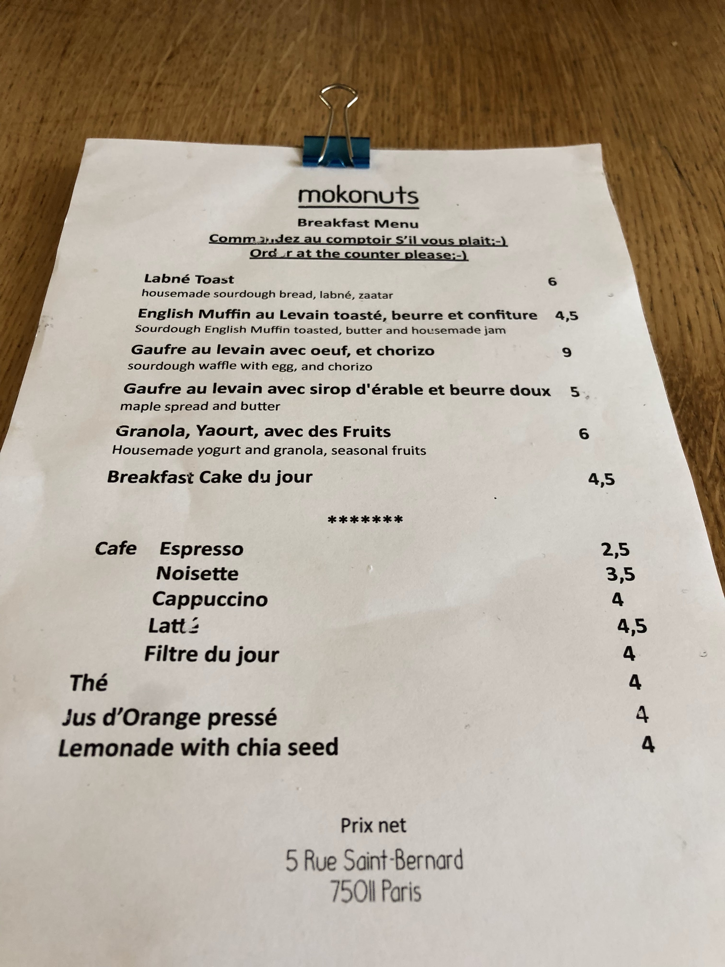 Nous avons eu la chance d'obtenir une réservation dans un délai très court lors de notre visite à Paris au printemps dernier. Leur menu en constante évolution, en fonction de ce qui est frais et savoureux sur les marchés de produits locaux, nous a séduit, et notre expérience culinaire l'a certainement validé. Des ingrédients frais et sains combinés à une spontanéité créative dans une convivialité intime et sans prétention font de Mokonuts un joyau délicieux même pour Paris ! Nous n'avons jamais goûté de cheesecake au labneh sauf ici ; rafraîchissant, léger, savoureux et fruité ! Ma femme et moi avons hâte de revenir à Mokonuts pour la troisième fois ! Gene et Grace de Los Angeles