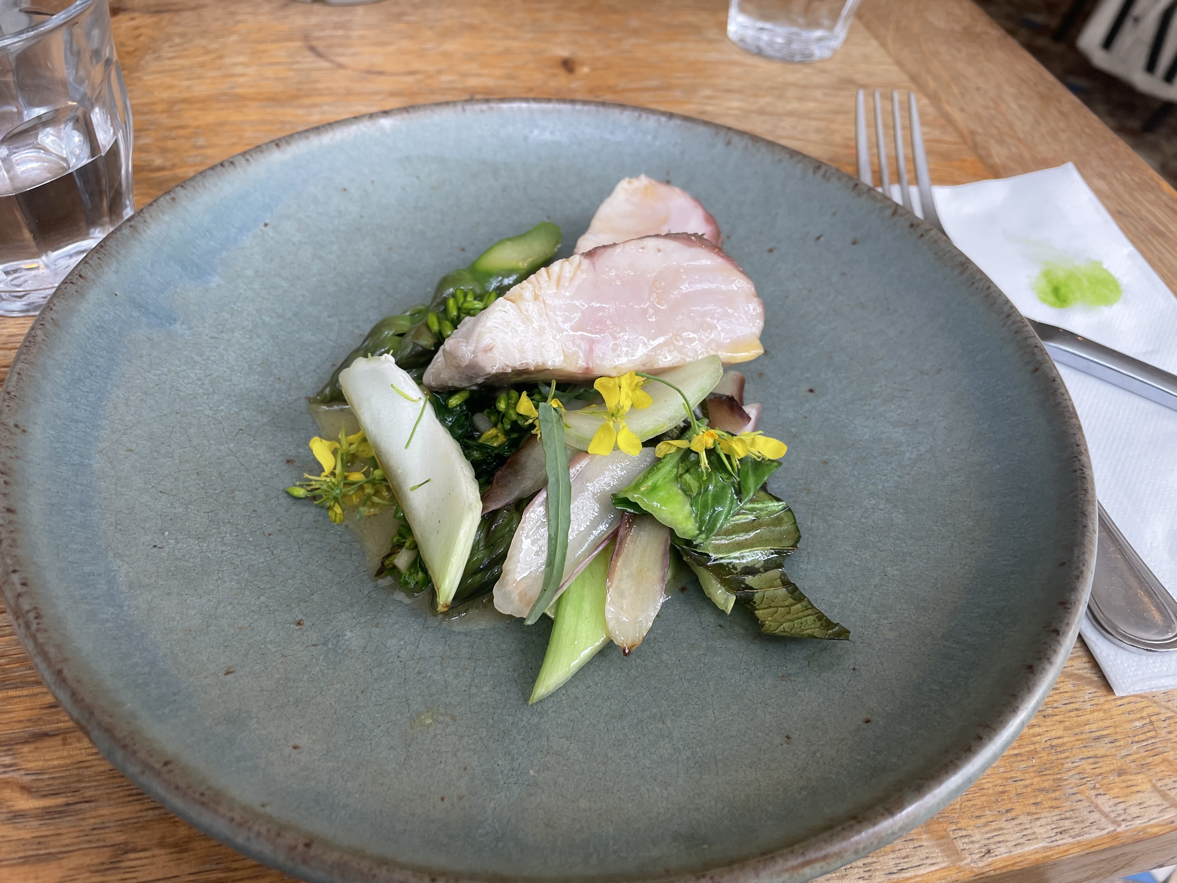 Une nouvelle visite à Mokonuts, mon restaurant préféré à Paris. Les plats toujours délicieux (incroyable hamachi, à la fois cuit et cru, tendre et soyeux avec un jus hyper concentré qui le rend addictif) et qui mettent absolument en valeur les produits de saison (de dodues asperges vertes, croquantes sur une sauce tahini enveloppante et un côté encore plus vert avec les aigrettes). Service attentionné par Moko qui est aussi aux fourneaux. Et un grand merci pour avoir fait un délicieux plat sans poisson (pas à la carte!) malgré les problèmes d’appro. Clientèle principalement étrangère (et américaine) dans un quartier pourtant très parisien et pas touristique. Les prix sont plus élevés qu’ailleurs pour un déjeuner mais ils ne sont ouverts qu’en semaine, matin et midi, et les produits vraiment parfaits. Une pépite, courez-y mais il faut réserver.
