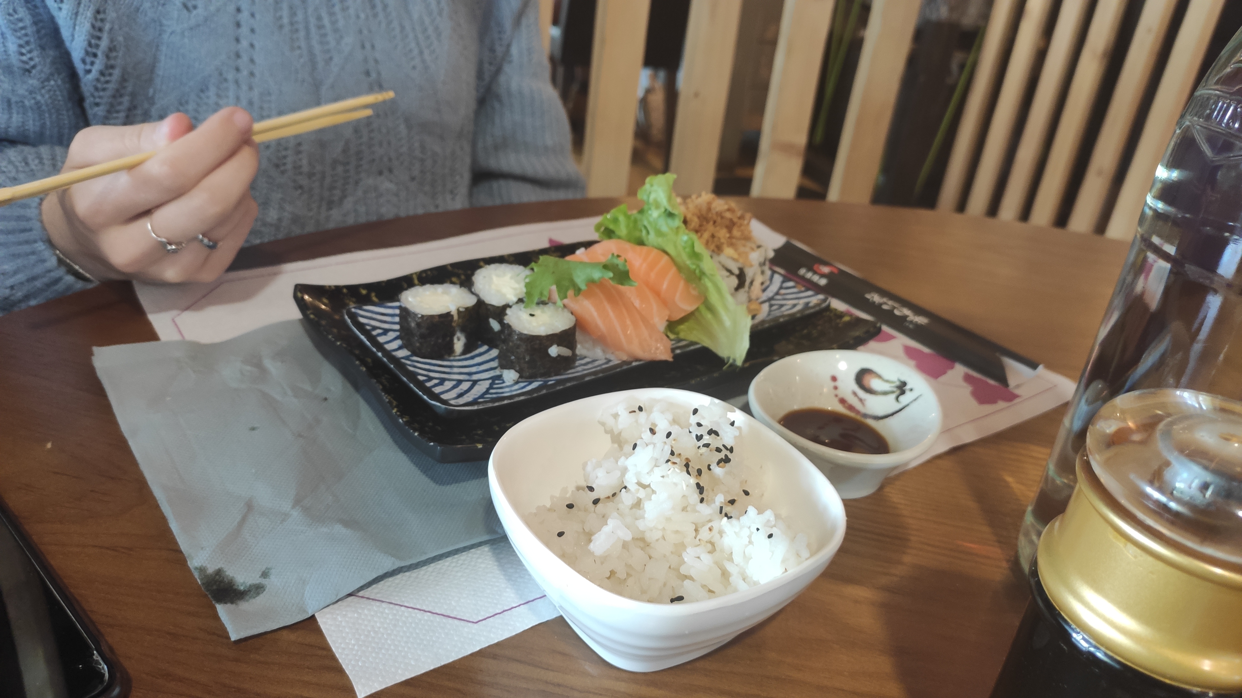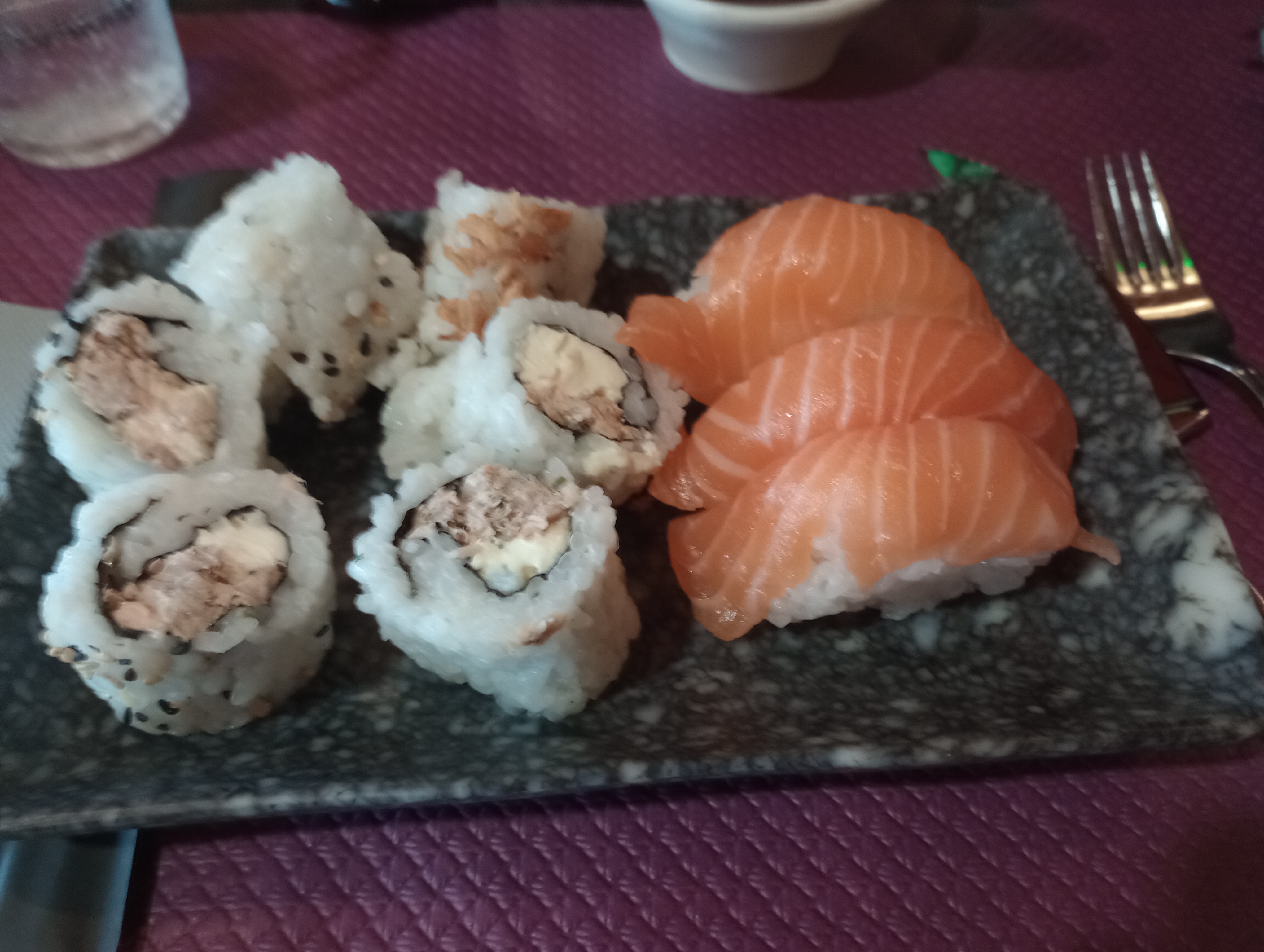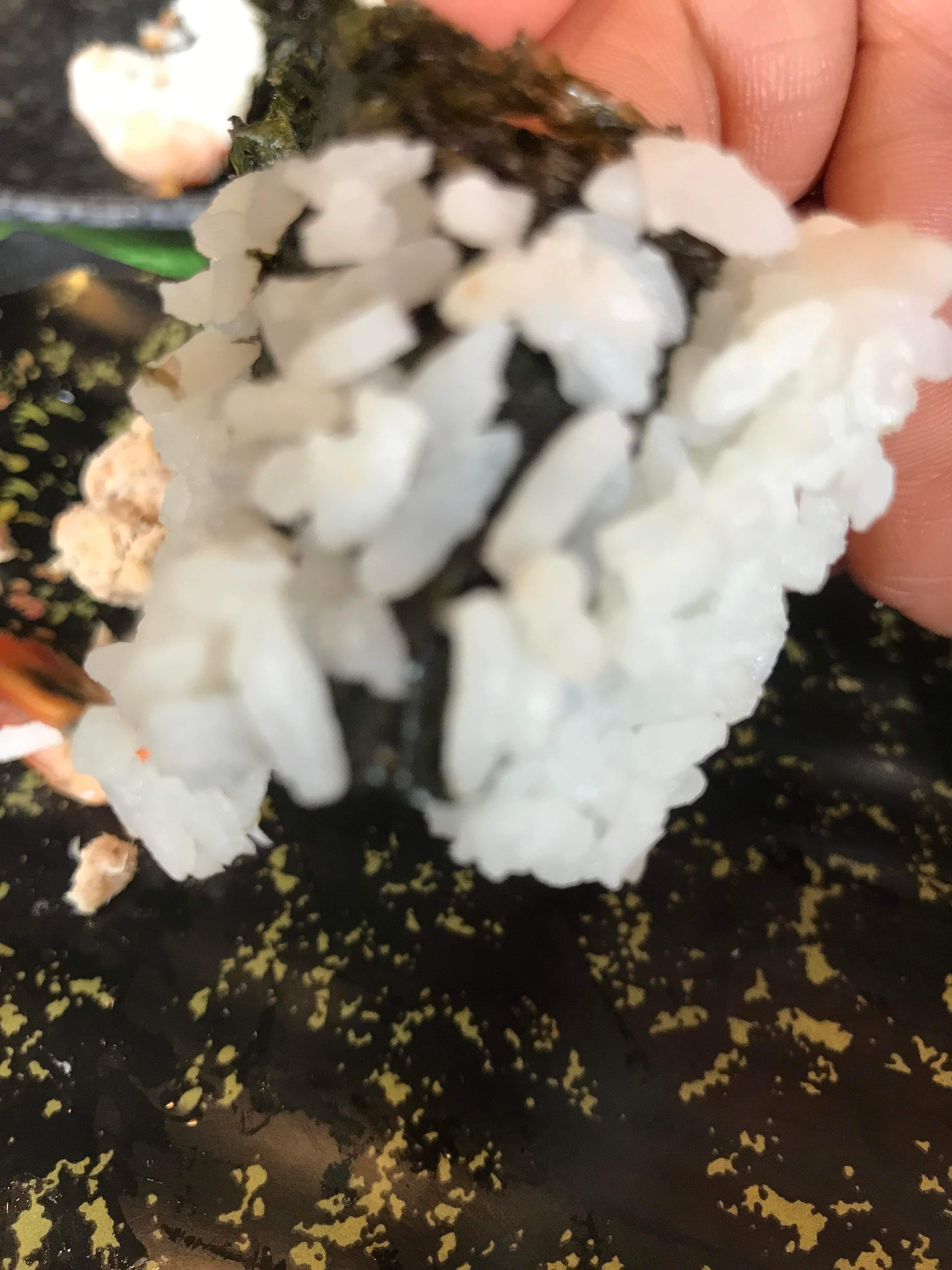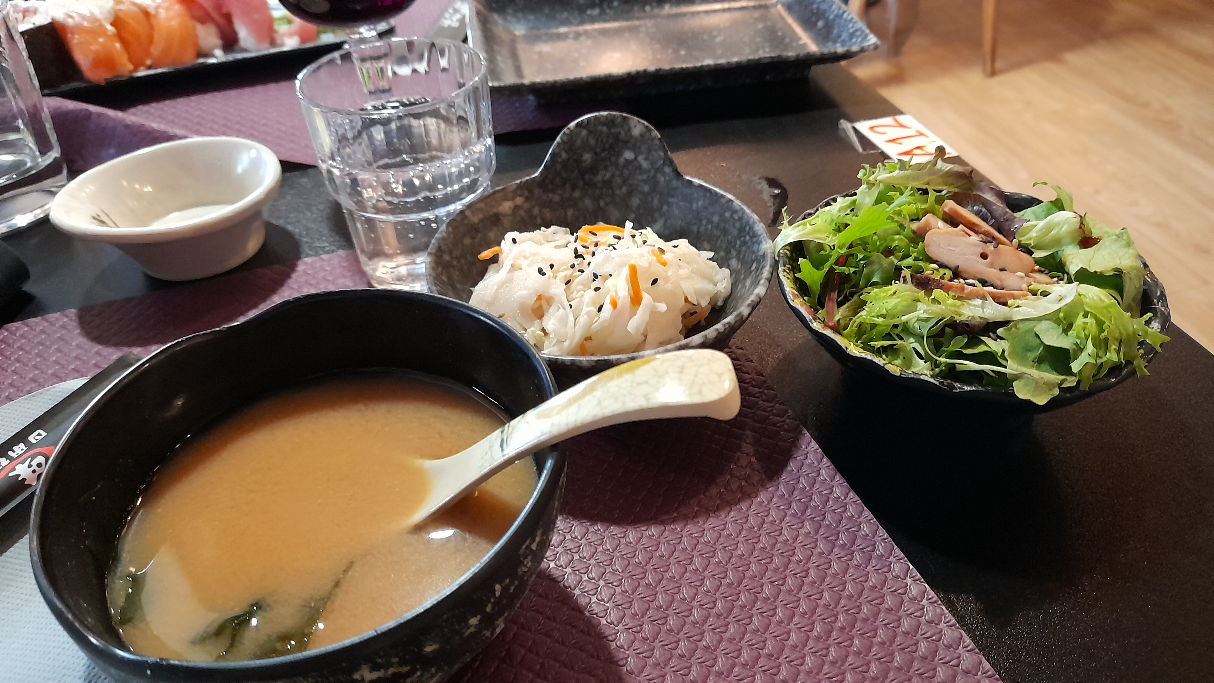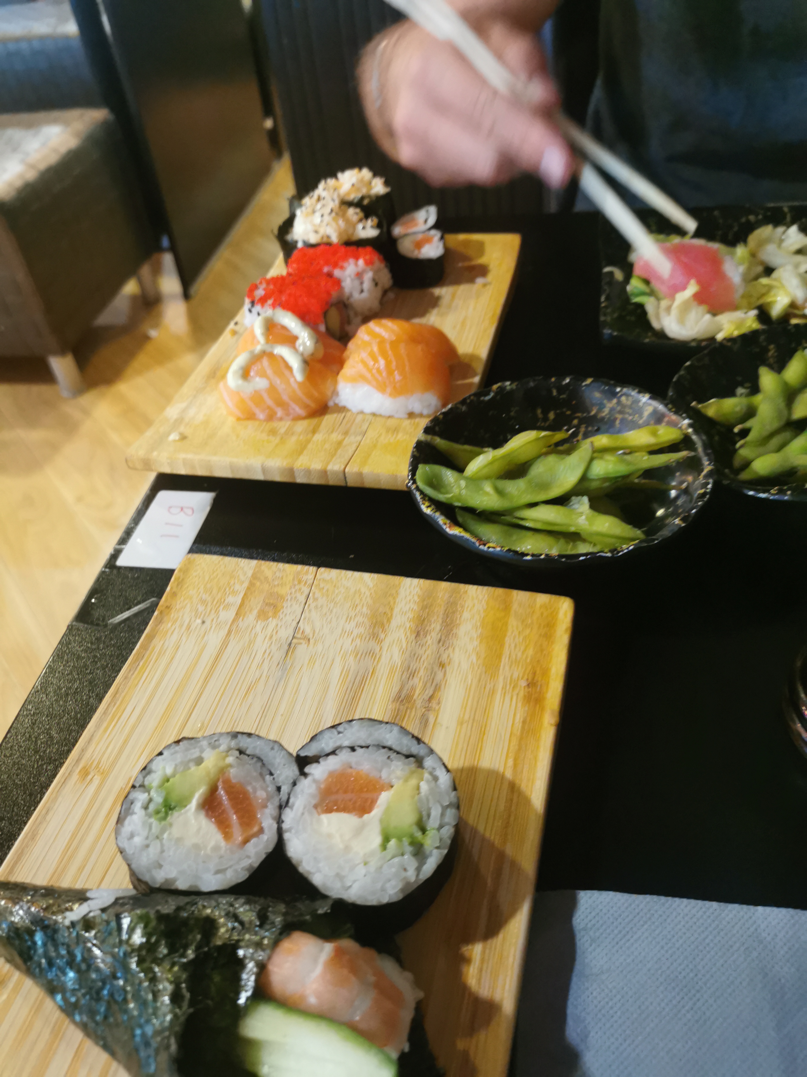 La soupe est froide et aigre, les edamames ne sont pas bien cuits. Tout donne l’impression d’avoir été préparé la veille et abandonné dans l’arrière-cuisine. Les sushis sont réalisés de manière bâclée, se désagrégeant. À l’intérieur, il fait étouffant, sans aucune aération.