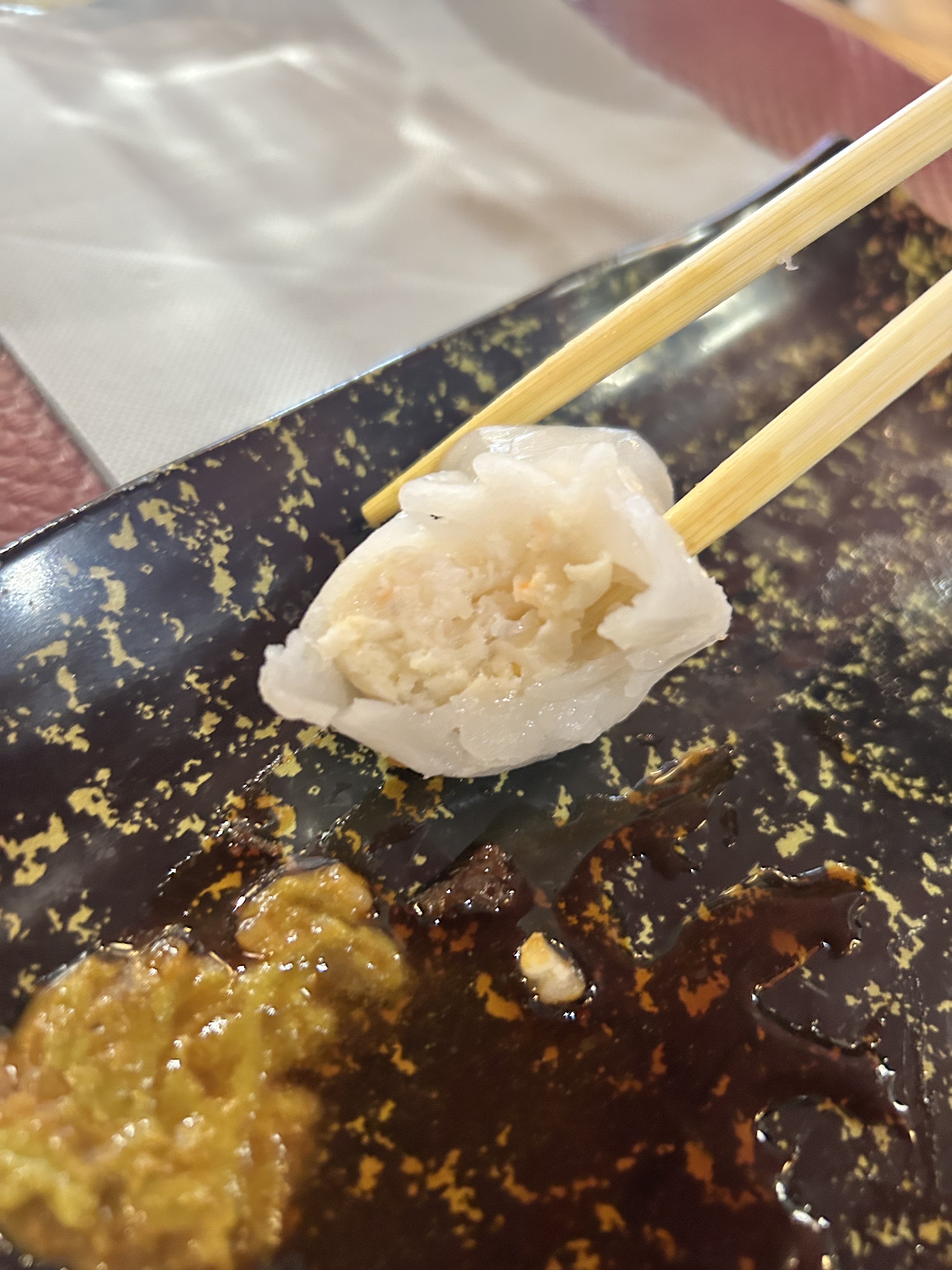 Décevant Déjà de l extérieur ce n' est pas engageant. Déco très chargée pour rappeler thématique vu que quand on rentre si on ne connait pas rien n indique que l on va manger asiatique. Installés dans le passage malgré bon nombre de tables libres ça débute mal. On commande sur des tablettes, attention ultra sensible vérifier bien votre commande avant de l envoyer. Peu de choix pour tout ce qui est beignets mais énorme pour les sushis Cuisine très mauvaise,nems secs,riz gluant sauce épaisse et miettes de boeuf. Pas de dessert sauf glace industrielle et litchi en boîte Bref c était la première et dernière fois