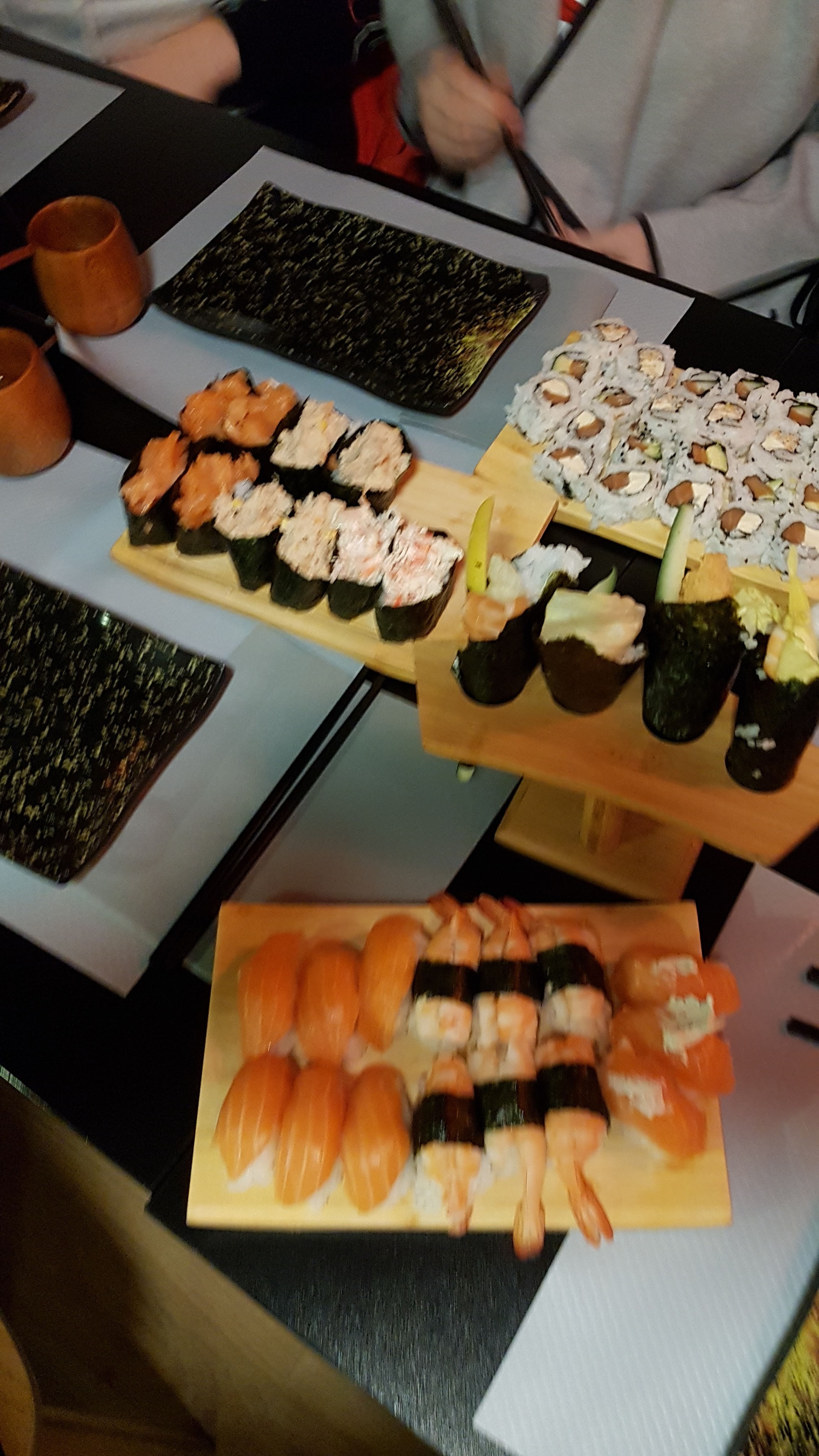 Arrivés contents ,repartis déçus. En effet l’endroit est agréable , cependant : -Les sushis sont pas bons du tout , ou gluants. -Les desserts sont très mal présentés avec peu de choix - Les plats ne sont pas bons mais le meilleur de la carte Passez votre chemin , ce resto au n’en vaut pas du tout la peine Le service est moyen et le personnel de caisse est très mauvais.