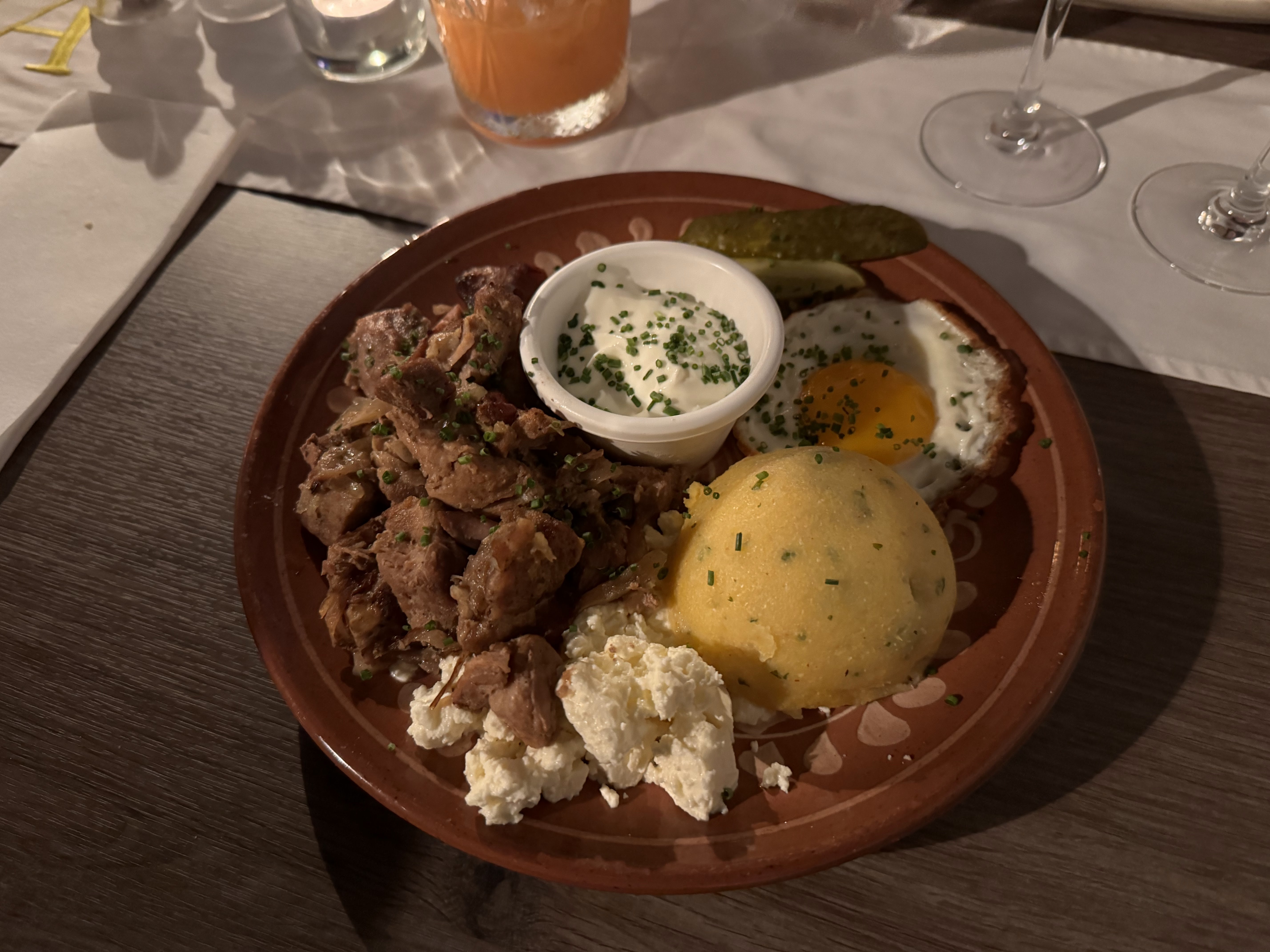 Malgré un accueil assez sympathique, la nourriture servie est très grasse et pas vraiment typique de Moldavie : poulet mariné lambda servi avec frites de polenta huileuses et sans goût, de la crème fraîche et des morceaux de fêta et aussi des cornichons. Le tout servi dans une écuelle en bambou avec compartiments. Bref cela casse pas 3 pattes et un canard, on dirait de l''assortiment avec des restes du frigo et en plus c'est mal assorti ! Nous nous sommes arrêtés là car 20€ juste pour ce plat c'est très très cher. En dessert on nous a dit nougat glacé ou mangue ou tarte. Bizarre quand même comme pays ?