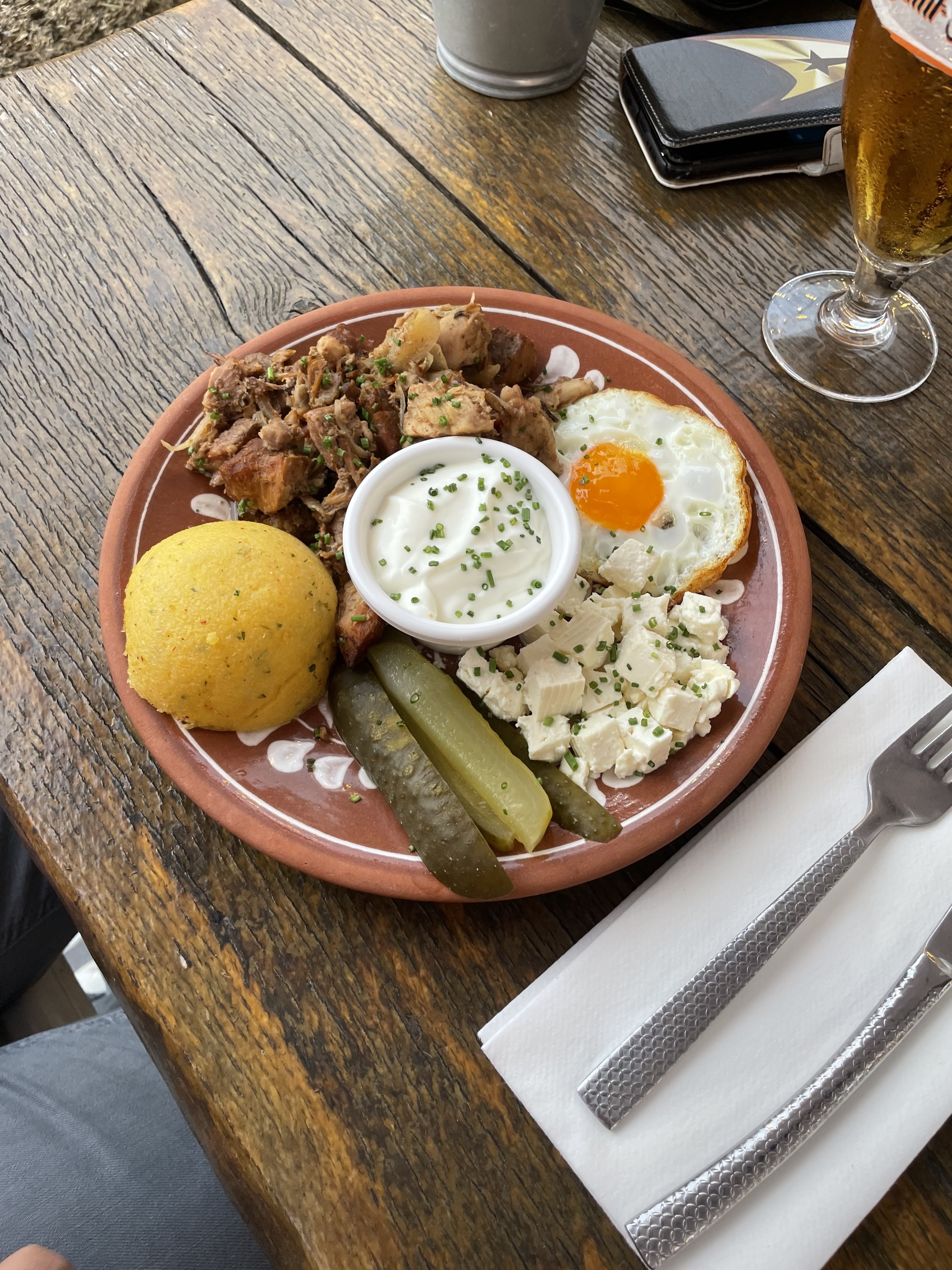 Rien à voir avec la cuisine roumaine mais nous avons très bien mangé ! L'endroit est sympa, petites cabanes en bois pour manger en toute intimité avec ses amis. 2 plats au choix pour le menu du midi