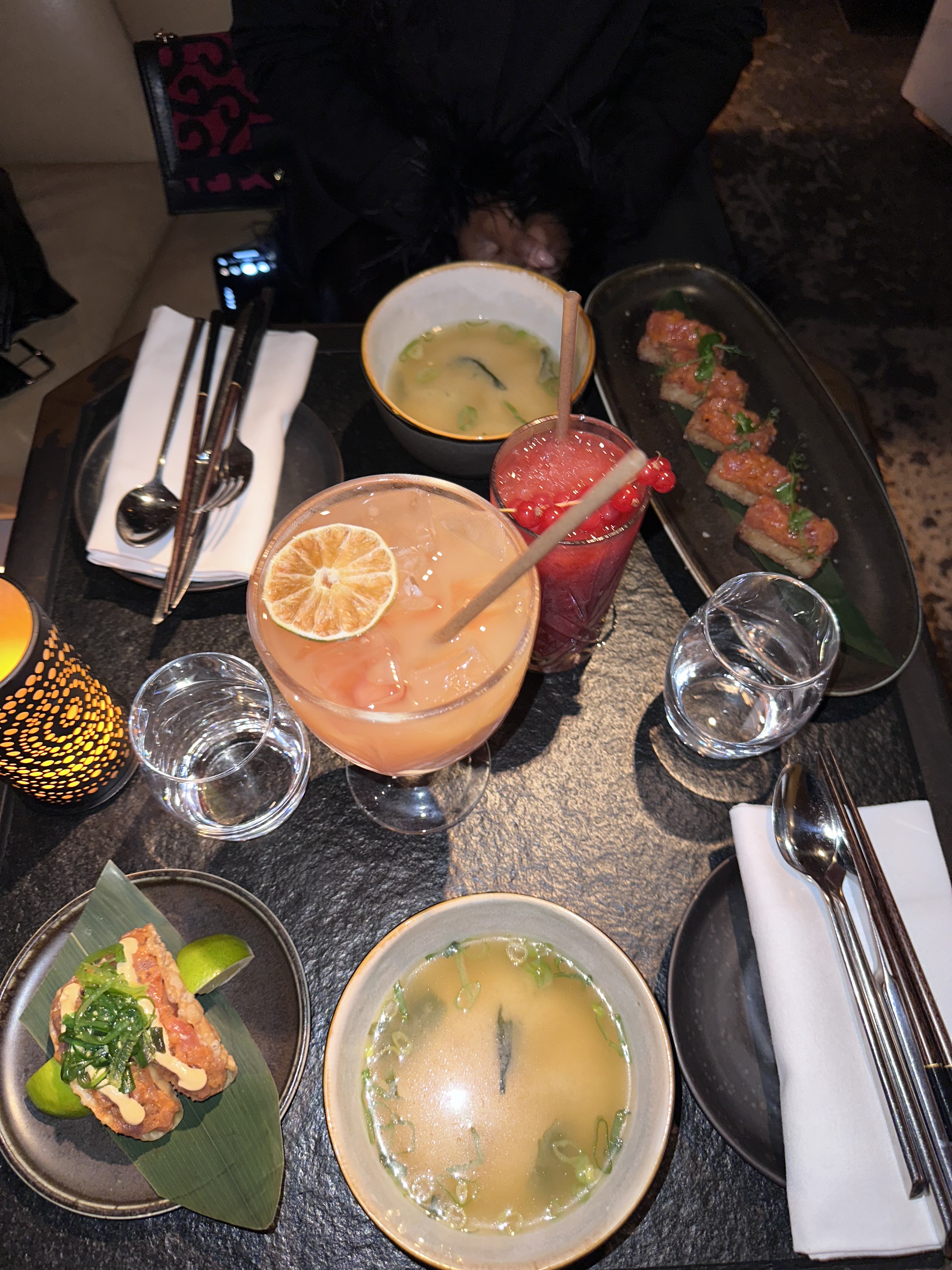 De la poudre aux yeux. Réservation pour 2 personnes vendredi soir à 22h45, on nous installe puis on nous donne les cartes. Jusque là rien d'anormal, le restaurant est très joli quoiqu'un peu sombre, bonne musique, bref on est hypé par l'ambiance. Au bout d'une trentaine de minutes nous appelons la serveuse pour prendre notre commande des boissons + plats. Un plat que nous avions choisi n'était pas dispo mais elle nous assure que nous pouvons prendre le temps de regarder et de commander plus tard. Les plats mettent une vie à arriver (il était presque minuit et nous n'avions toujours rien sur notre table) et personne ne nous calcule entre temps. Je tiens à préciser que dans notre rang nous étions seulement 3 tables. Lorsqu'on nous apporte enfin les plats nous demandons à commander du poulet japonais mais la cuisine est fermée. À aucun moment nous n'avons été avertis de l'heure de la fermeture des cuisines. Que les cuisines ferment c'est totalement ok, mais au moins avertissez les clients qu'ils ont jusqu'à une certaine heure pour commander. En plus d'avoir seulement 3 pauvres plats avec des quantités minuscules, nous n'avions toujours pas nos cocktails. Cocktails que nous avons réclamé avec difficulté parce que là-bas personne ne vous calcule malgré les j'arrive tout de suite. En bref je ne recommande en aucun cas ce restaurant qui est clairement vendu pour instagram. Le rapport qualité/quantité/prix est médiocre (c'est bon mais un tartare de saumon aux truffes sans truffes à 22e pour 6 pauvres tranches ?). On est sorti du resto en ayant super faim, on s'est clairement senti volé. La seule justification que nous avons eu est que la serveuse n'était pas une habituée et qu'elle était venue en renfort spécialement pour la soirée. Note à l'établissement : la honte de proposer une prestation pareille. Je ne suis pas du genre à me plaindre habituellement mais la situation dans le resto était lunaire.