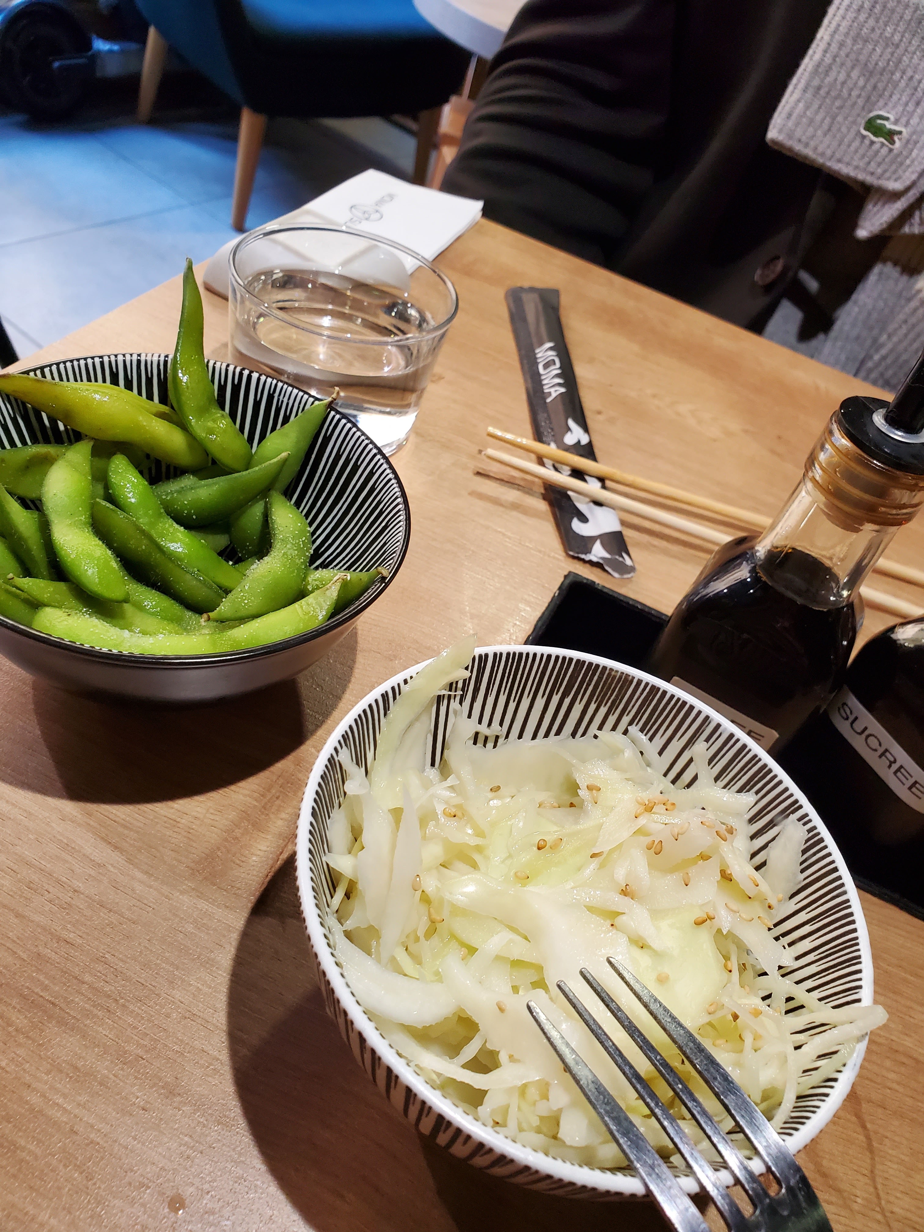 Commande salade d'algues + plat sushis. La salade m'est servie après 10 min. mais il faut attendre plus de 45 min pour le plat de sushis alors que tous les couples autour de moi ont été servi depuis longtemps ! Voir défiler les livreurs (les commandes passent-elles avant les clients du restaurant ?) et attendre seule à ma table en ayant l'impression d'être oubliée n'est pas une bonne expérience. Merci d'être particulièrement attentifs avec les clients solo pour qui le temps est bien long... Question sushis, rien à dire, ils étaient frais et délicieux.