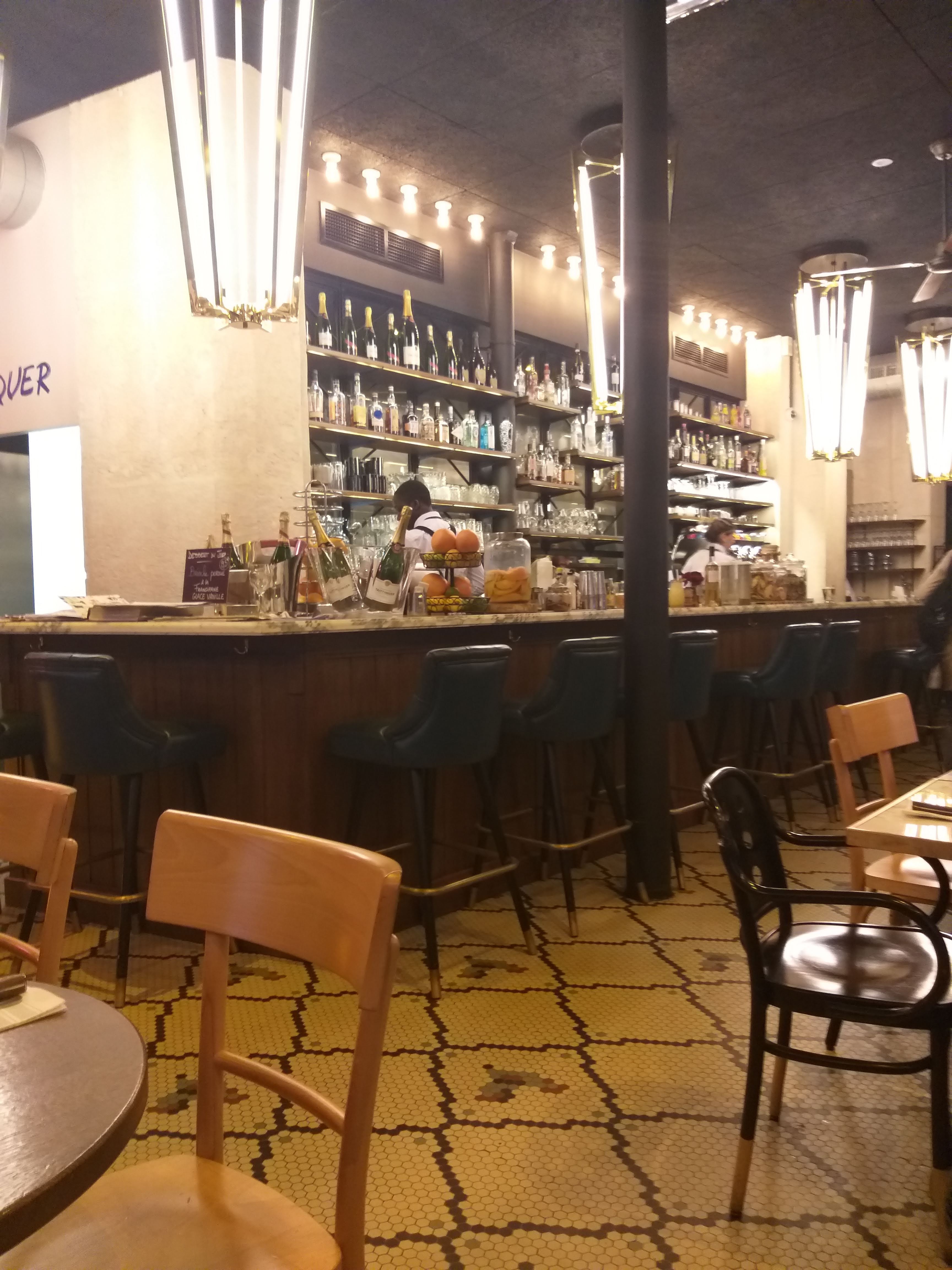 Un restaurant sympathique niveau déco, ça, c’est sûr. Mais pour le reste… serveurs un poil pressés et antipathiques sur les bords, nourriture insipide, sans intérêt, et surtout CHÈRE. 28,50€ une entrecôte dure comme de la semelle, avec 10 frites qui se battent en duel, et 12€ une tartine de pain de campagne acide avec une tranche de jambon bas de gamme et du gruyère fondu au dessus… Non mais vraiment… je ne sais que dire. Mais nous sommes à Paris, qui plus est à République, quartier bobo par excellence. Rien n’était très bon dans ce restaurant, tout était très très moyen, ok la déco est jolie, mais est-ce le plus important ? Je ne crois pas. Pour un repas à deux avec 1 entrée, 2 plats, 1 café, 1 verre de rosé et 1 verre de bière : 76€ Ah Paris et ses restaurants attrape touristes !