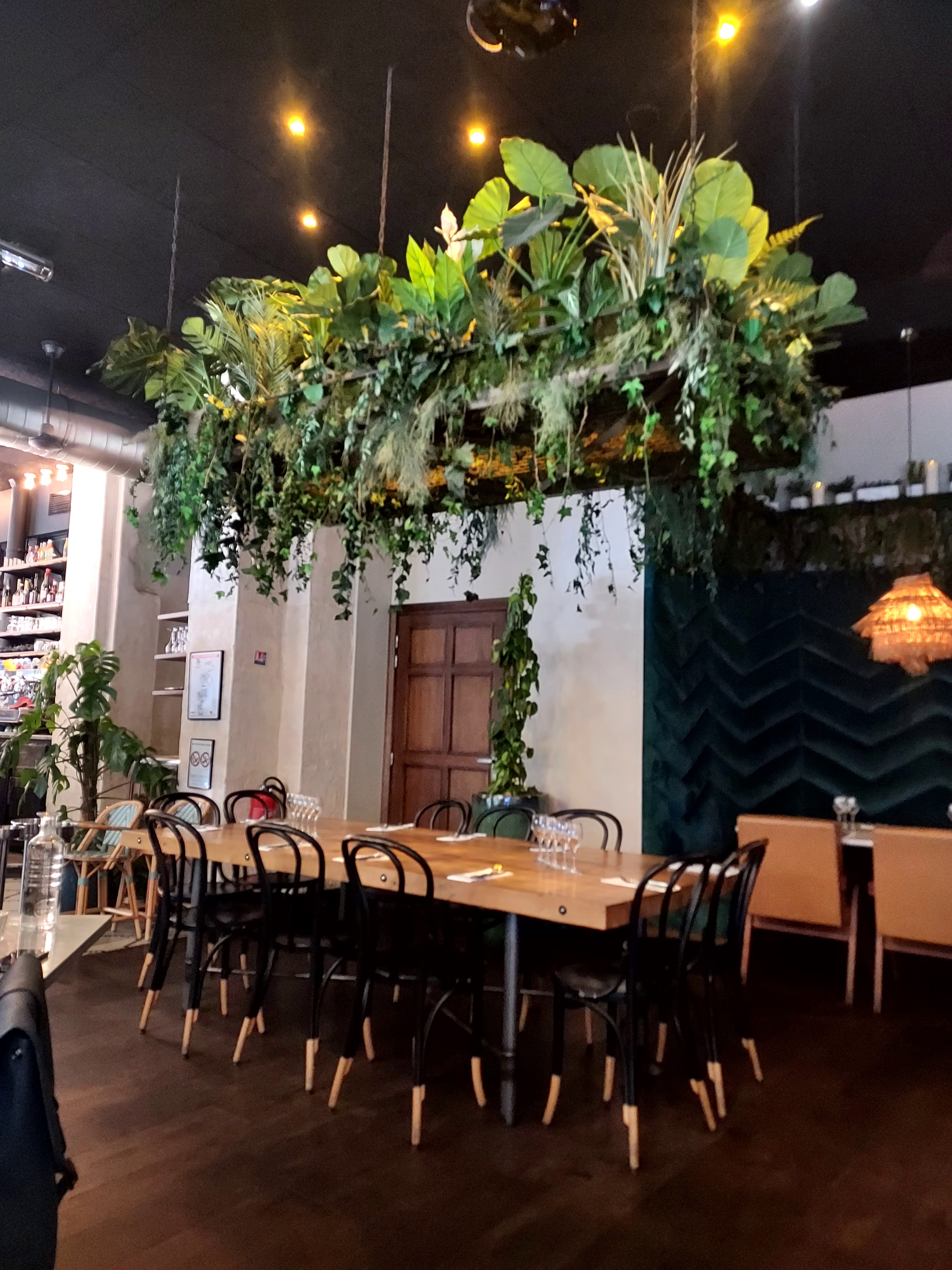 Plats intéressants et design très atypique. Le placement des clients est à revoir, nous sommes venu pour manger en terrasse et le serveur nous a proposé de manger côte à côte face à la rue comme si on buvais un café.. obligé d’entrer à l’intérieur pour être face à face.