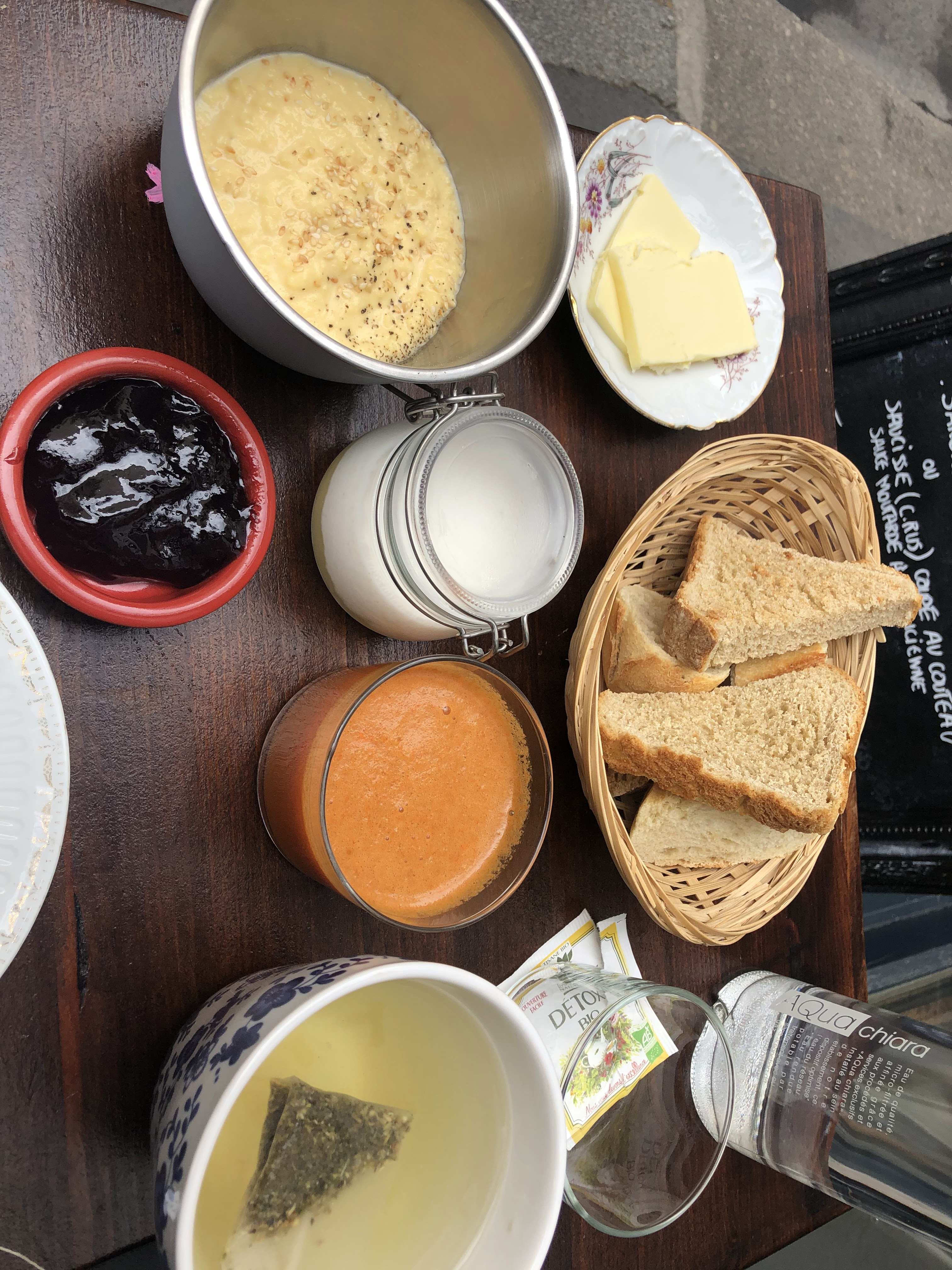 Nous avons brunché.. c’etait moyen… je suis mitigée sur la qualité. Je n’ai pas vu de baguettes, ni beurre et ni confitures. Les œufs brouillés sont bons.. les trois fromages proposés n’ont pas de goût. Le fromage blanc est simple avec une lichette de caramel..le jus de fruit frais tout petit… les sachets de thé sont présentés dans une assiette où tout le monde a trifouillé les sachets… Il a fallu réclamer à plusieurs reprises plus de pain. Toujours sans beure ni confiture ? Lorsque j’ai réservé le prix était à 27 euros, en une semaine il est passé à 29. Je pense qu’il y a d’autres adresses à Paris pour le même prix et bien meilleur. Service sympathique car la jeune femme est tout seule pour toute la salle…. Malheureusement les prix augmentent mais pas la qualité.