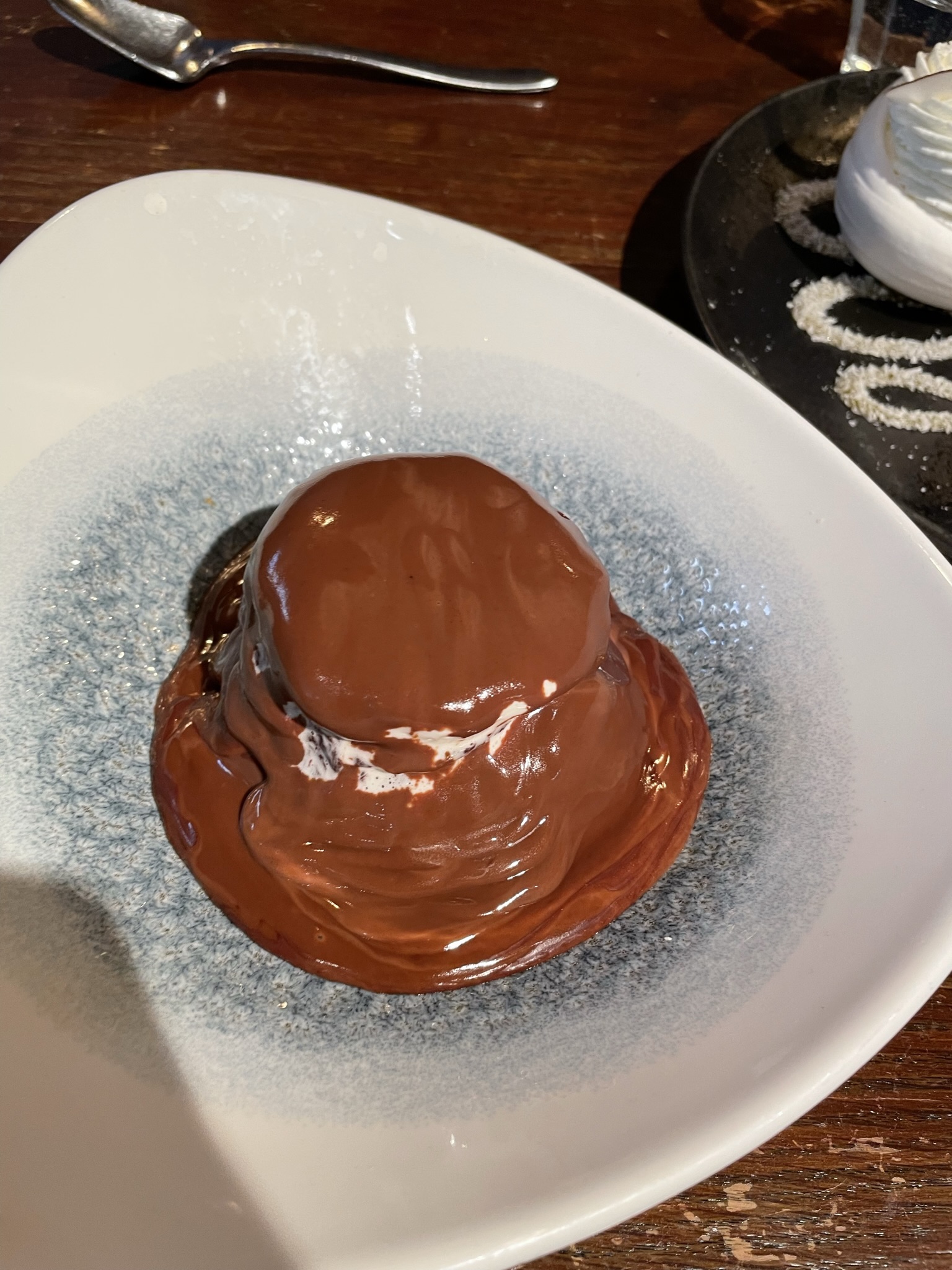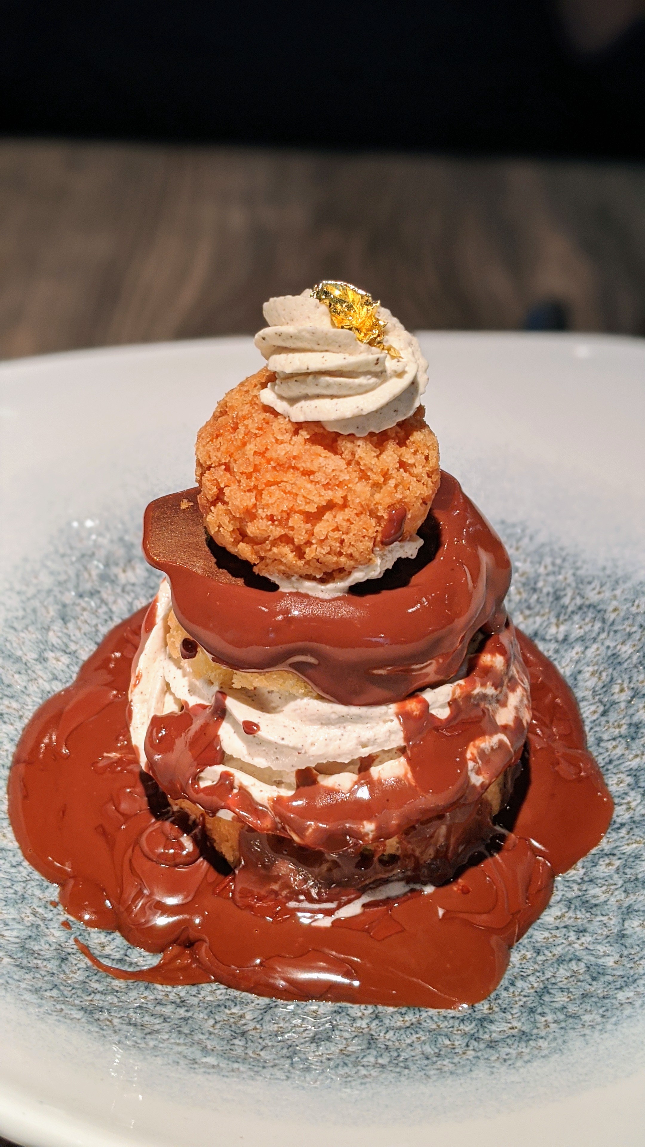 Bien mangé, bon service. Cuisine française sans être trop classique. La volaille (noire?) avait une cuisson et une texture exquise, incluant la peau qui n'était pas croustillante mais tendre sans être grasse... On m'a servi la profiterole de façon amusante: le serveur installe un anneau de chocolat autour et verse le coulis chaud dessus... l'anneau fini par céder à la chaleur, une petite démolition contrôlée 😜