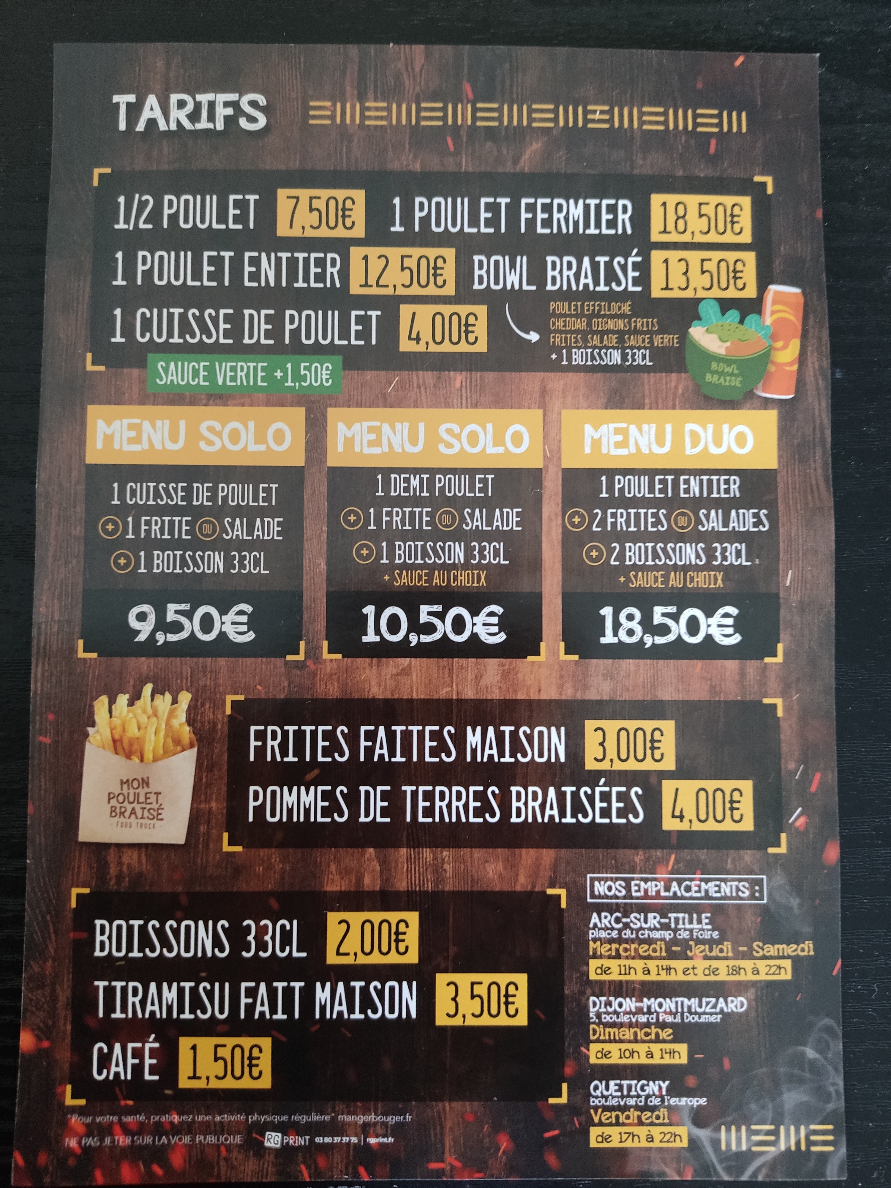 Meilleur poulet de tout Dijon..surtout quand c'est le chef du camion qui gère les poulets c'est encore meilleur !. Chaque semaine c'est devenu une tradition 🥰 notre poulet du jeudi soir !! Les frites aussi sont incroyable ! Seul petit bémol je trouve que la carte fidélité est trop gourmande.. 10 passages c'est bien 14 ça fait vraiment beaucoup ! on a la carte depuis plus de deux mois et même en venant chaque semaine c'est long car les tampons comptent seulement pour les poulets entiers et pas les autres passages avec que des demis poulets par exemple! dommage ☺️