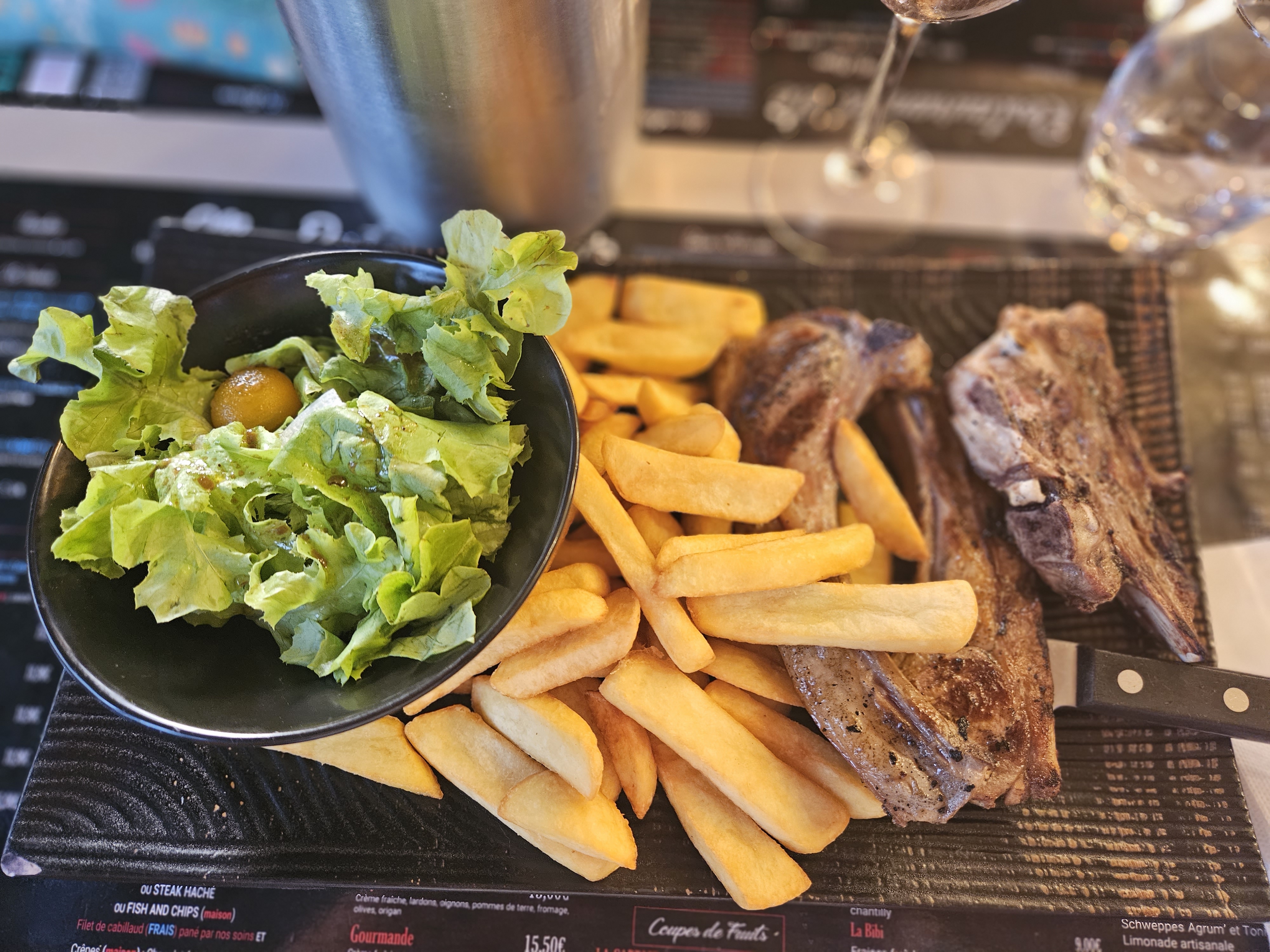 Une voir deux étoiles pour la gentillesse de la serveuse pour le restaurant zéro passez votre route Nous avons pris les côtes d'agneau à 22,90 € par personne trois côtes d'agneau deux premières et une non sans assaisonnement sans sel ni poivre ni herbe bref aucun parfum accompagné de frites pas cuite Et d'une petite salade sans aucun assaisonnement Ceci avec une bière un quart de rosé et un pichet d'eau total 53€10 Je vous le répète passer votre chemin