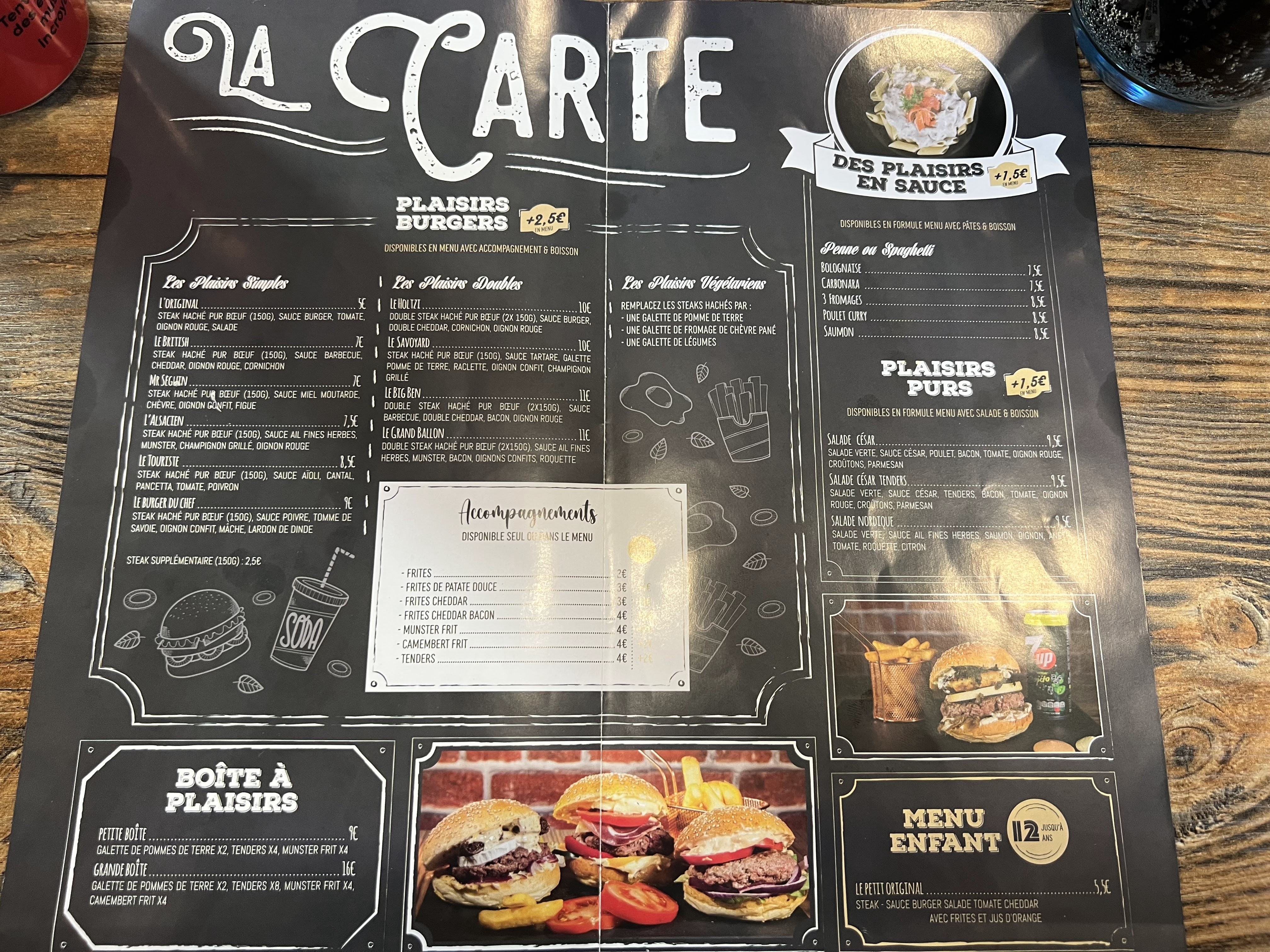 De la qualité fait maison dans l’assiette (ou sur l’ardoise).. un très bon choix de burger, sous différentes déclinaisons (1, 2 ou 3 steaks comme bon vous semble), équipe jeune et dynamique! Je suis très satisfait de mon repas, je reviendrai mais cette fois avec du monde. Je recommande, n’hésitez pas!