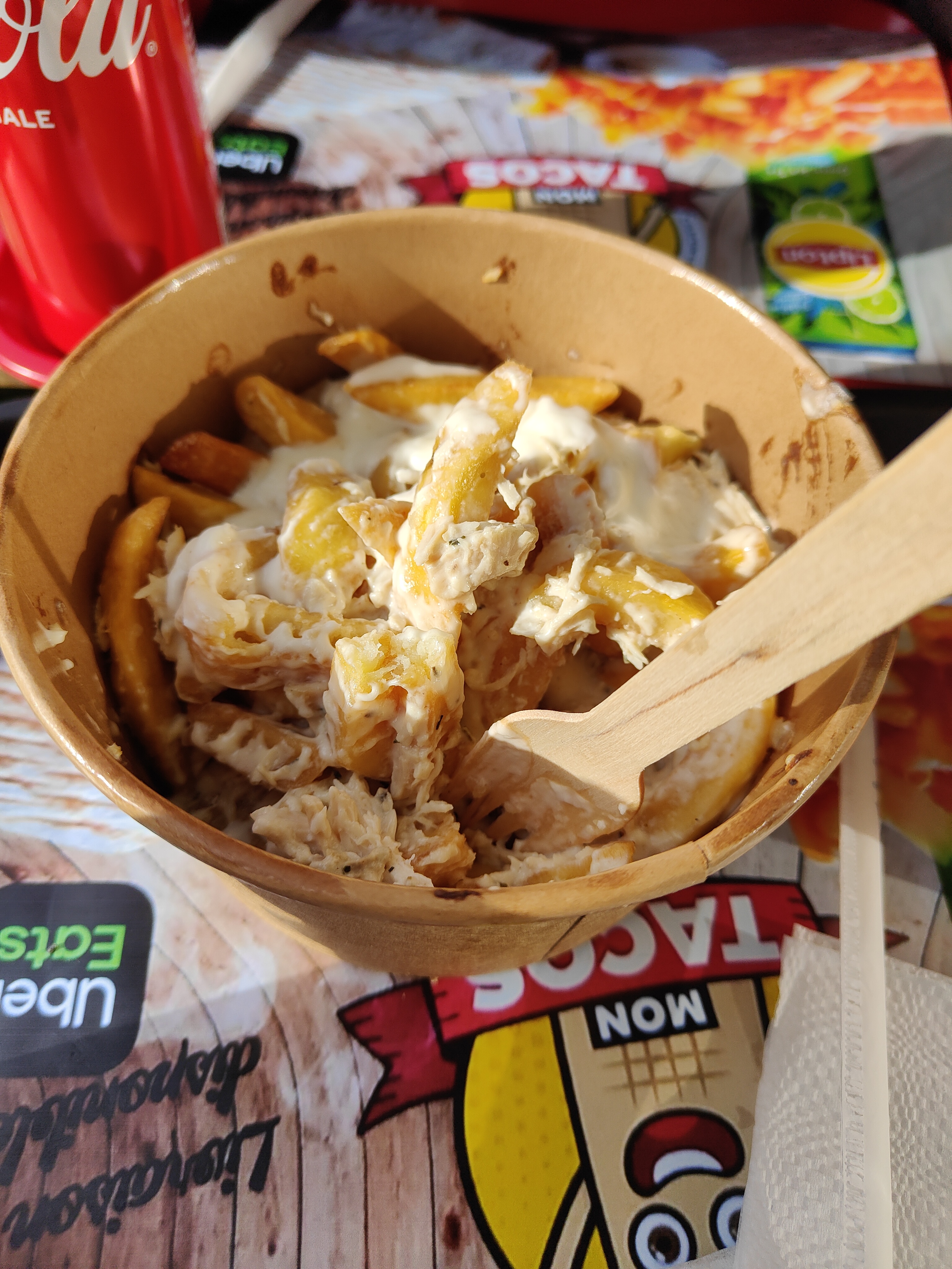 Frite cheddar vaux le coup Mais le tacos pas du tout très huileux poulet très cuits (goût désagréable) et sauce fromagère inexistante le tout pas top Mal de ventre assurée !! Dommage