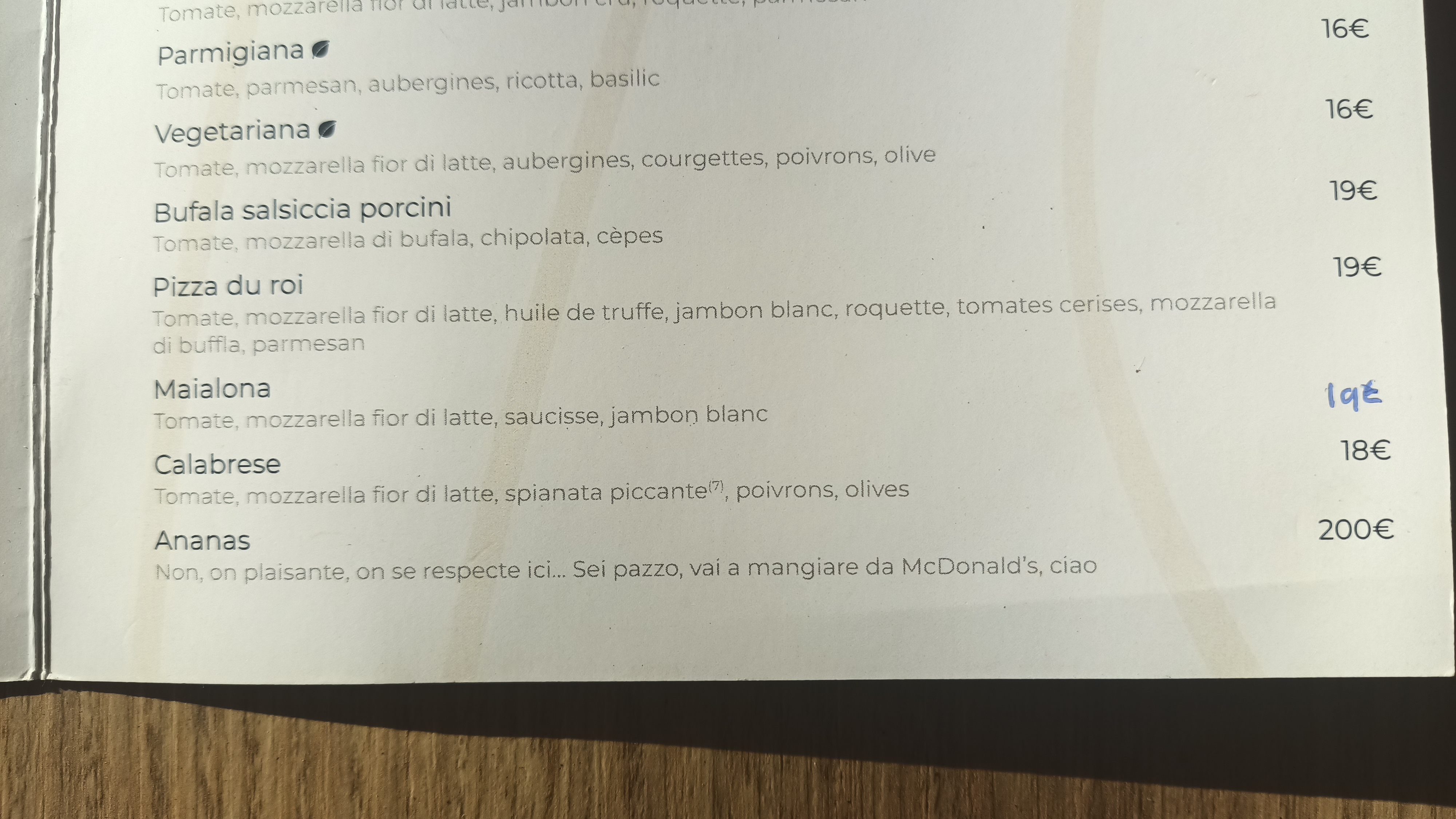 Chez Mona le plaisir gustatif n’a dégal que la qualité du service. Je vous recommande des pizzas à l’ananas. Les 200 € ne sont pas perdus.