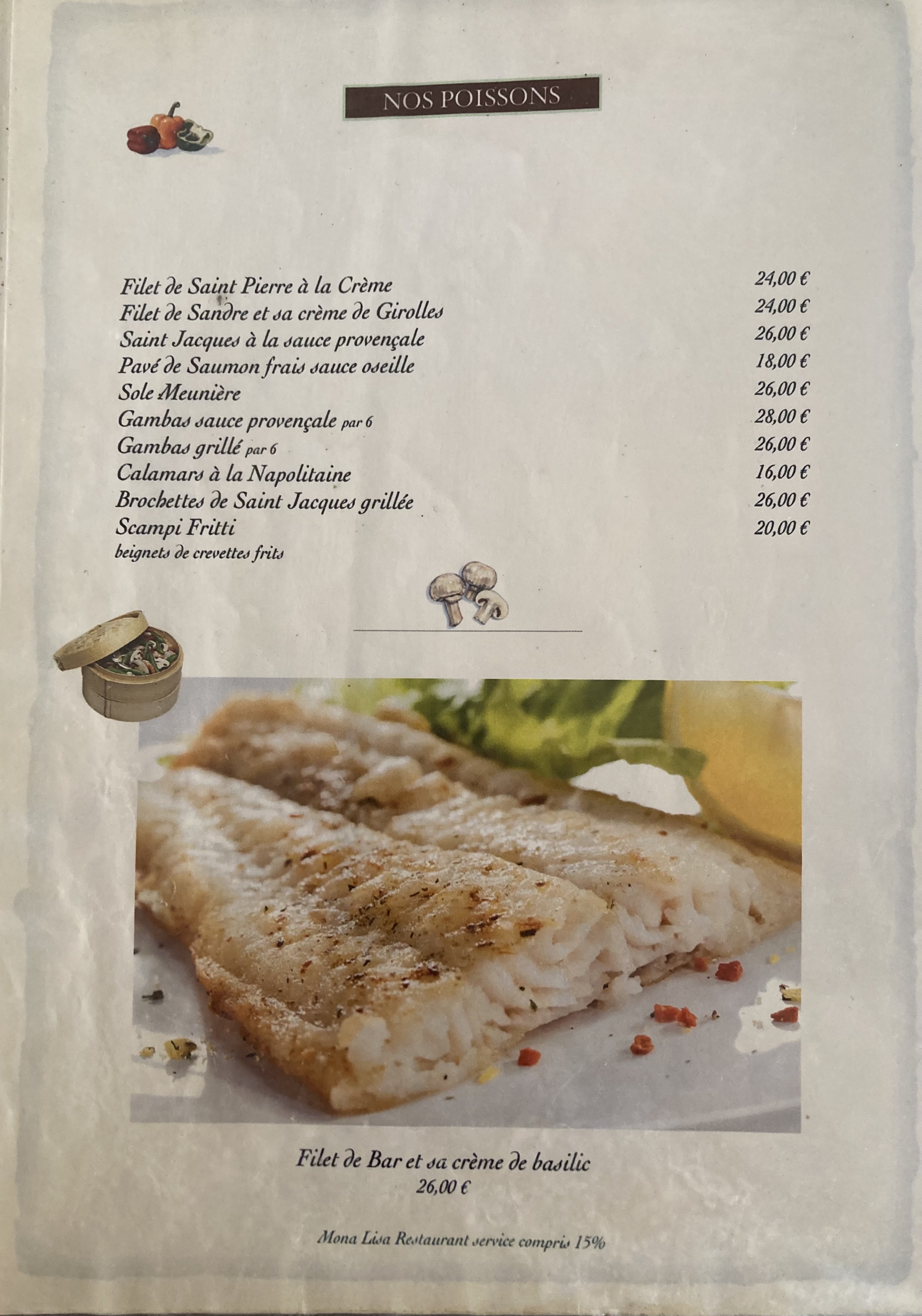 C était un peu ma cantine jusqu'à ce soir ! Cette semaine 3 visites mercredi midi avec Julia. Vendredi soir j y ai accompagné 3 convives. Ce soir dîner habituel quand nous avons un frigo vide en prévision d un départ. Il apparaît que pour le repas du mercredi nous avons fait une erreur de 6 euros en oubliant la TVA. La somme nous est réclamée. OK. C était mon dernier repas au Mona Lisa.