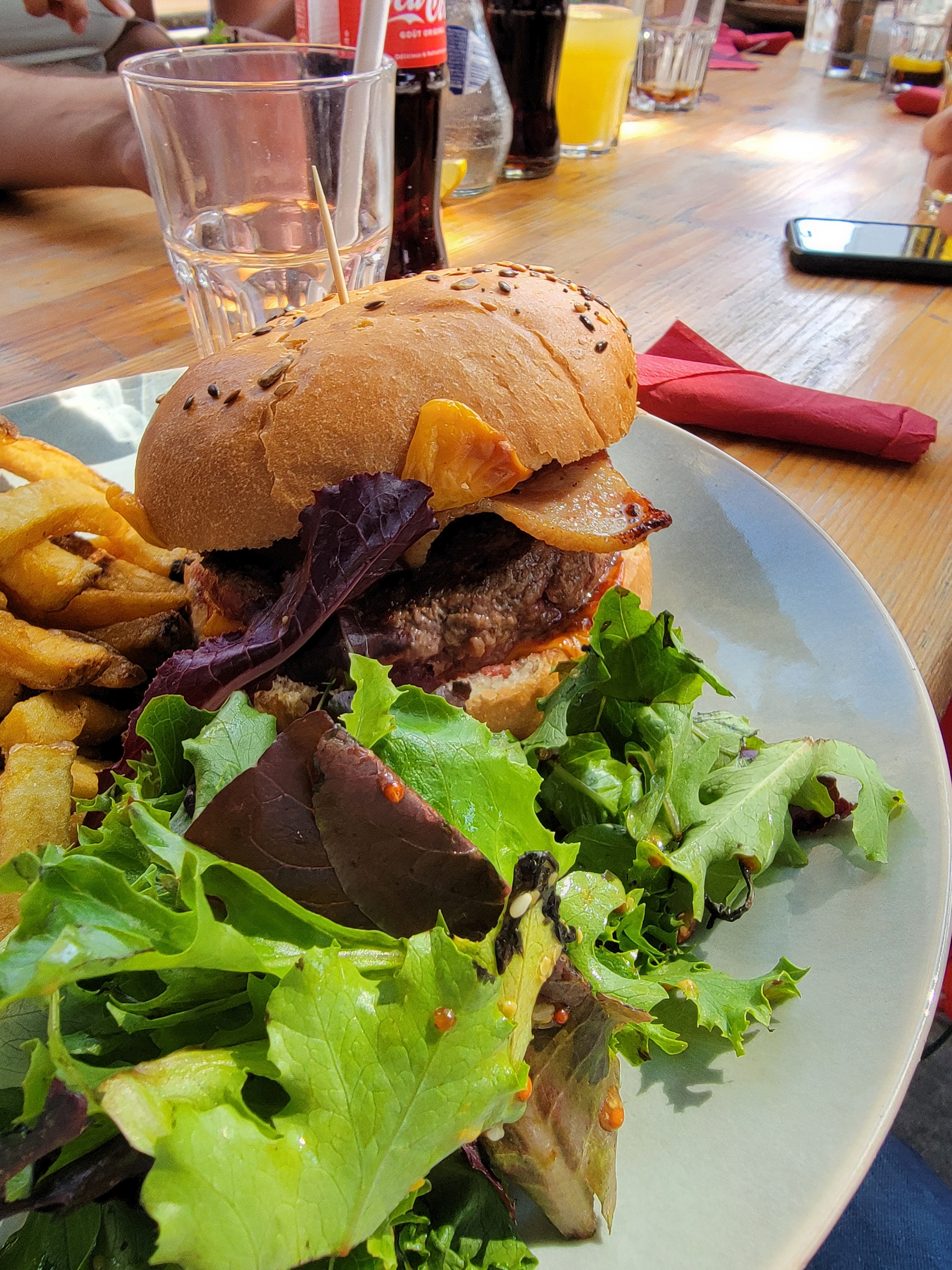 La serveuse qui s'est occupée de nous était juste la meilleure serveuse du monde : hyoer dispo, très efficace, et ça alors que le restau était blindé ! Le burger était délicieux, servi avec des pommes grenaille délicieuses et un côté du Rhône délicieux. Le tout pour 60€ à deux... Que demande le peuple ?
