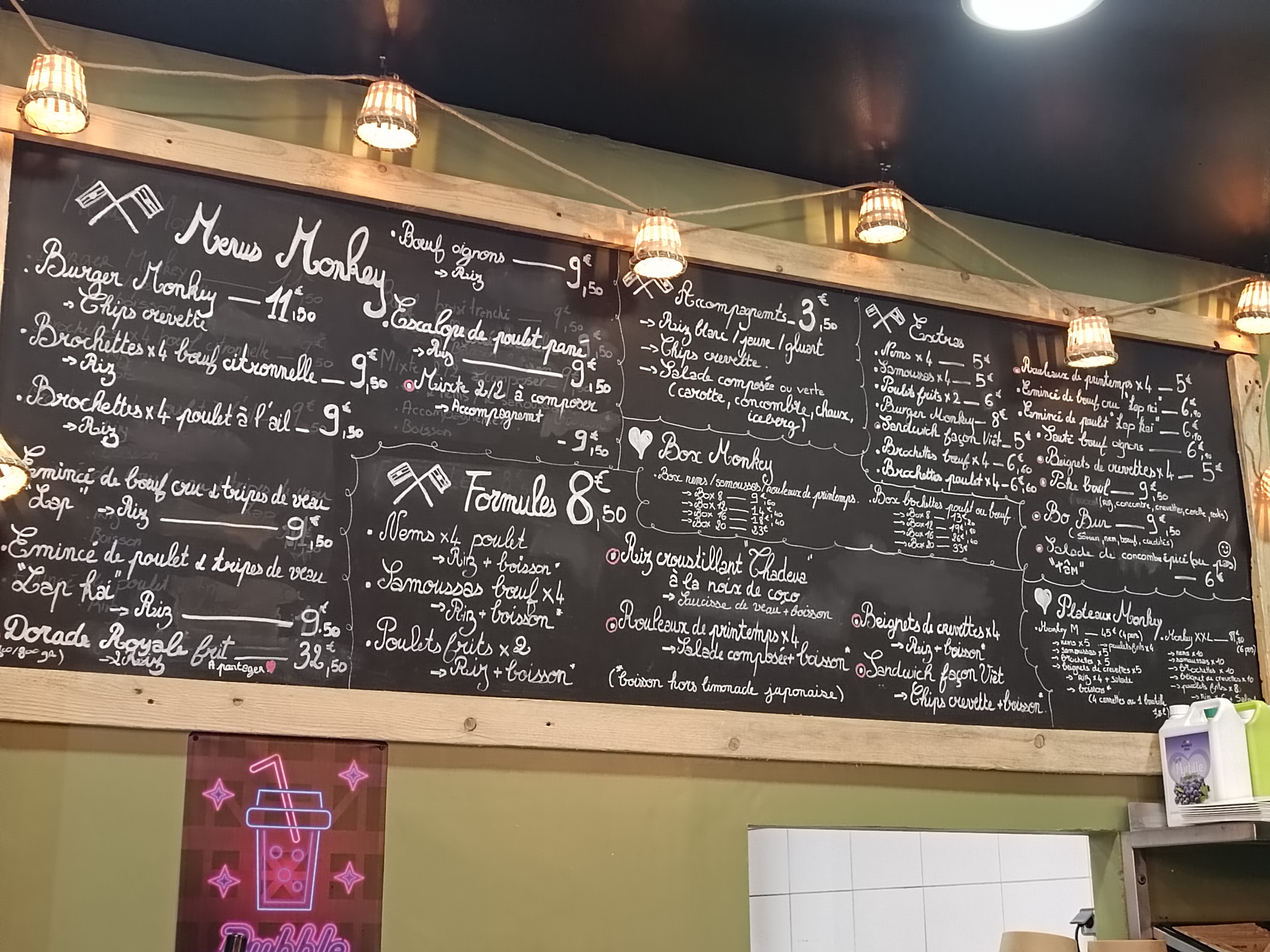 Monkey Lao, situé à Châteauroux dans l’Indre, vous invite à découvrir quelques spécialités asiatiques version street food. L’ambiance vous y plonge déjà. On y trouve aussi une étale d’épicerie. L’accueil est agréable et souriant. Vous devez régler votre commande avant qu’elle soit lancée (sur place ou à emporter). Il y a peu de places assises. J’ai pris un bo bun (mon péché mignon) avec une boisson exotique dont mon choix a été hésitant tellement que les propositions sont nombreuses (boissons du Japon entre autre). Et vous avez droit aussi au fameux biscuit chinois avec sa prédiction. Pour ce bo bun les nouilles sont froides (ailleurs certains les font chaudes). Comme d’habitude on y retrouve de la carotte, du concombre et d’habitude du soja, mais ici cela a été remplacé par du chou rouge et il n’y a pas de cacahuètes (c’est peut être pour éviter les allergies). La viande de bœuf est soigneusement préparée dans une marinade et les morceaux de nems sont presque fondants. Habituellement on sent le croquant de la friture mais là non, c’est très appréciable. Juste un petit bémol sur les nouilles, elles ne sont pas assez égouttées. J’ai eu du mal à sentir la sauce dans laquelle baignent les nouilles. Pour ceux qui cherchent de l’exotisme dans leurs assiettes, je vous invite à y aller. J’ai hésité à prendre le burger servi avec des chips aux crevettes. Si je repasse dans la région, je pense que je l’essaierai. Bon appétit !