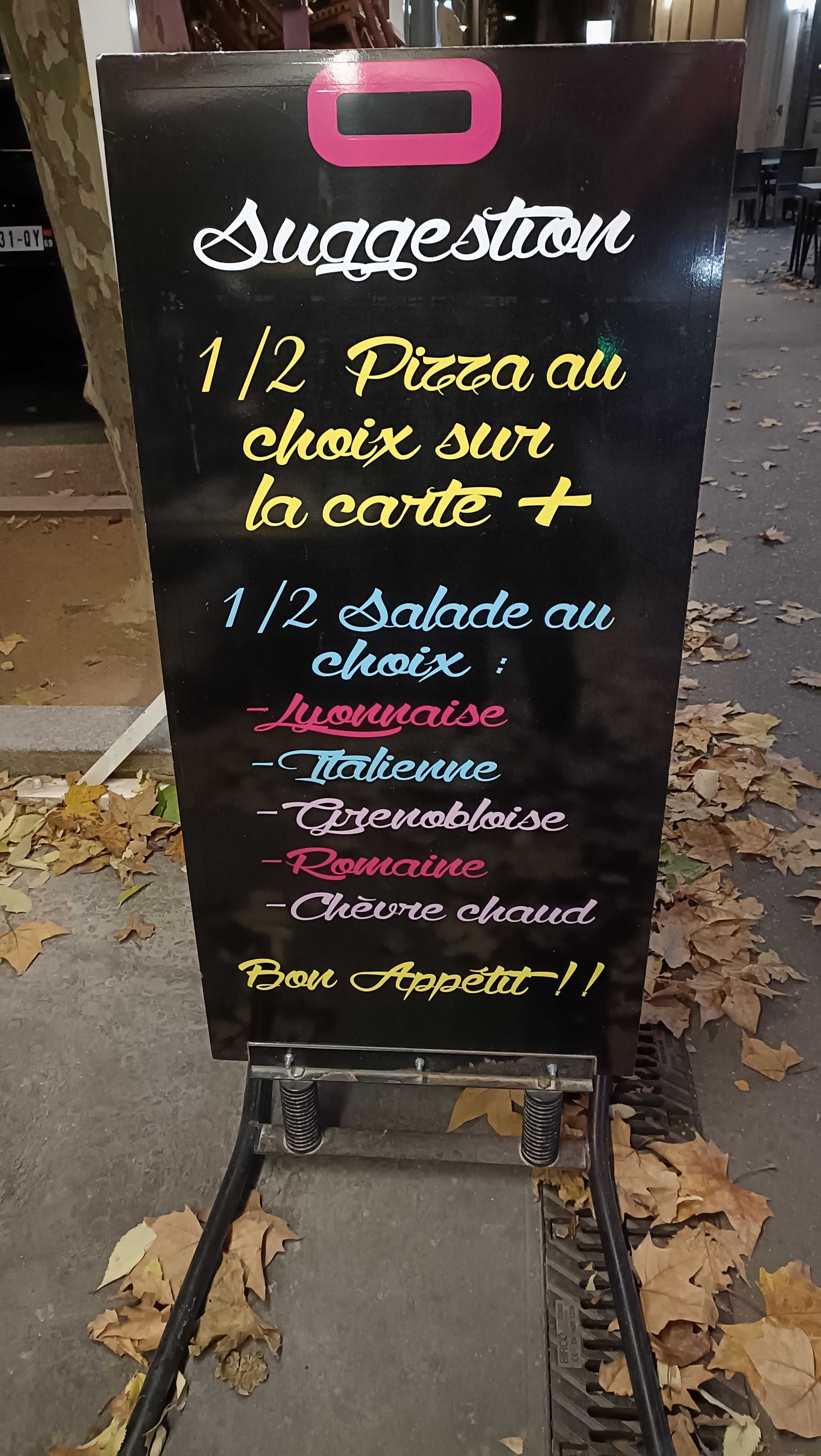 Menu suggestion avec 1/2 salade + 1/2 pizza. Ça suffit largement tout finis très bon. Bon service je recommande