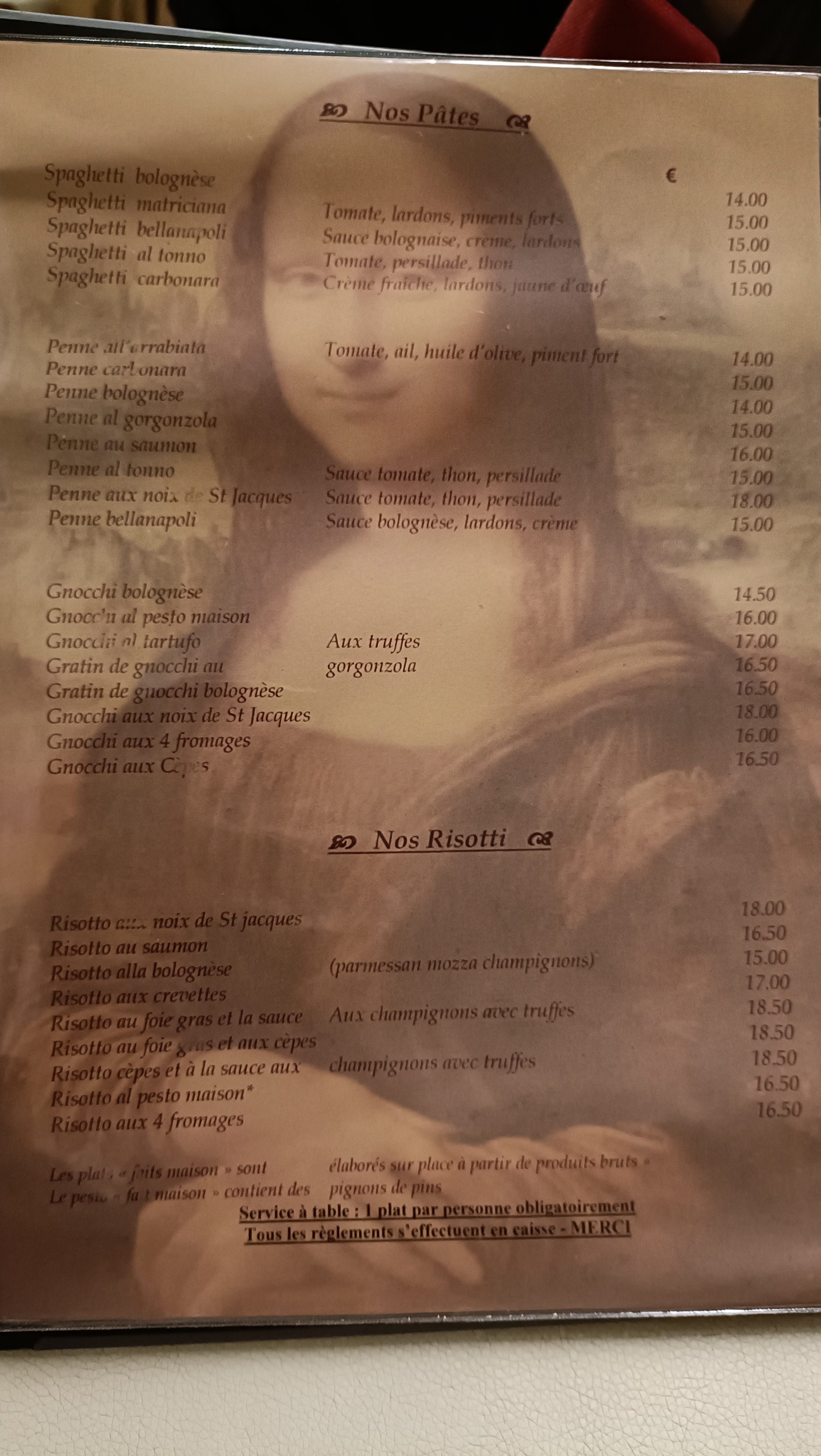 Le Monna Lisa nous a fait voyager en Italie avec ses plats délicieux et généreux, sa décoration authentique, et avec un service au top. Merci pour cet accueil chaleureux accompagné de votre accent Italien que nous aimons écouter sans modération. Tout était parfait! Vous pouvez y aller les yeux fermés en tout cas nous, on a trouvé notre restaurant Italien.