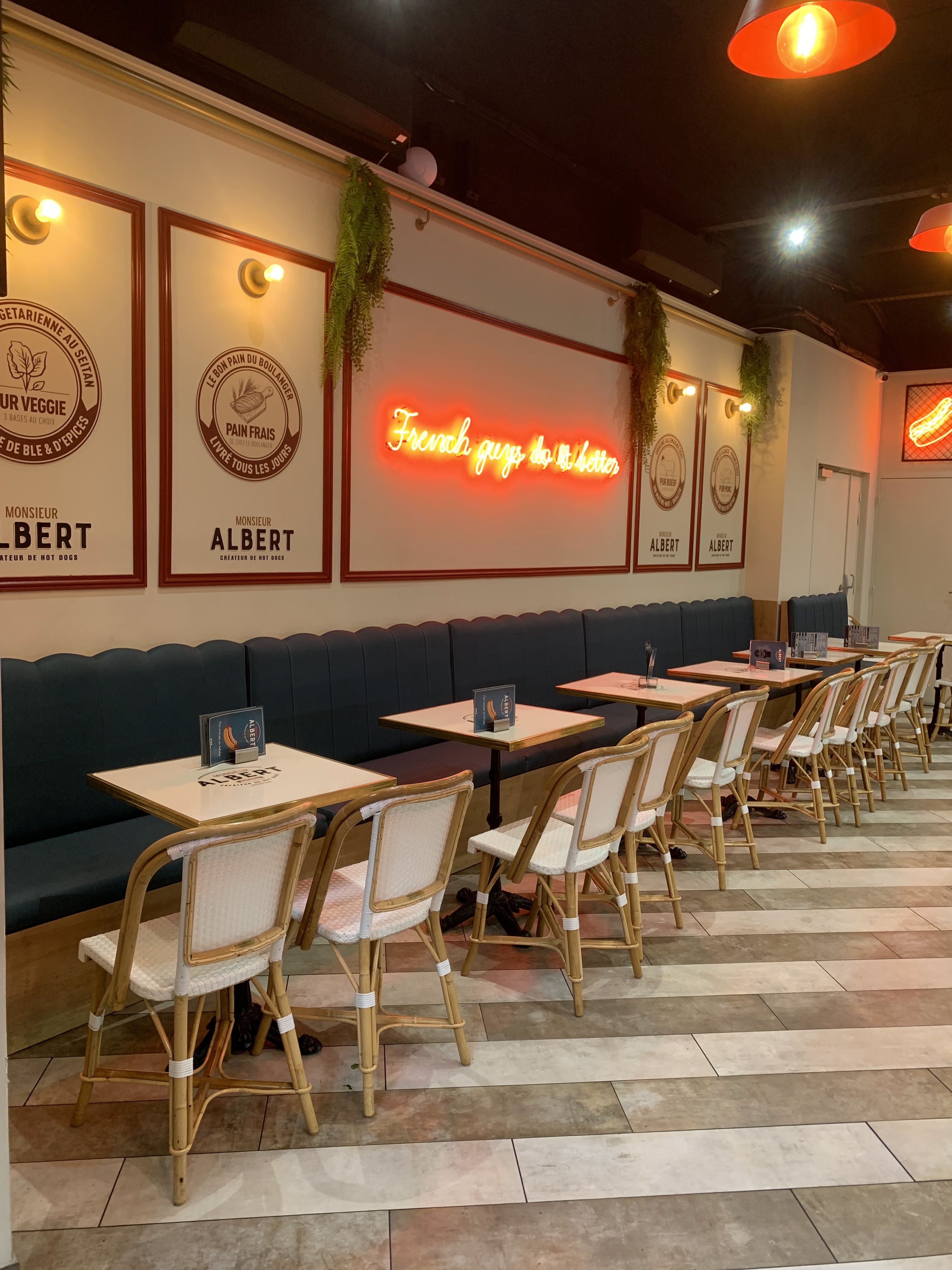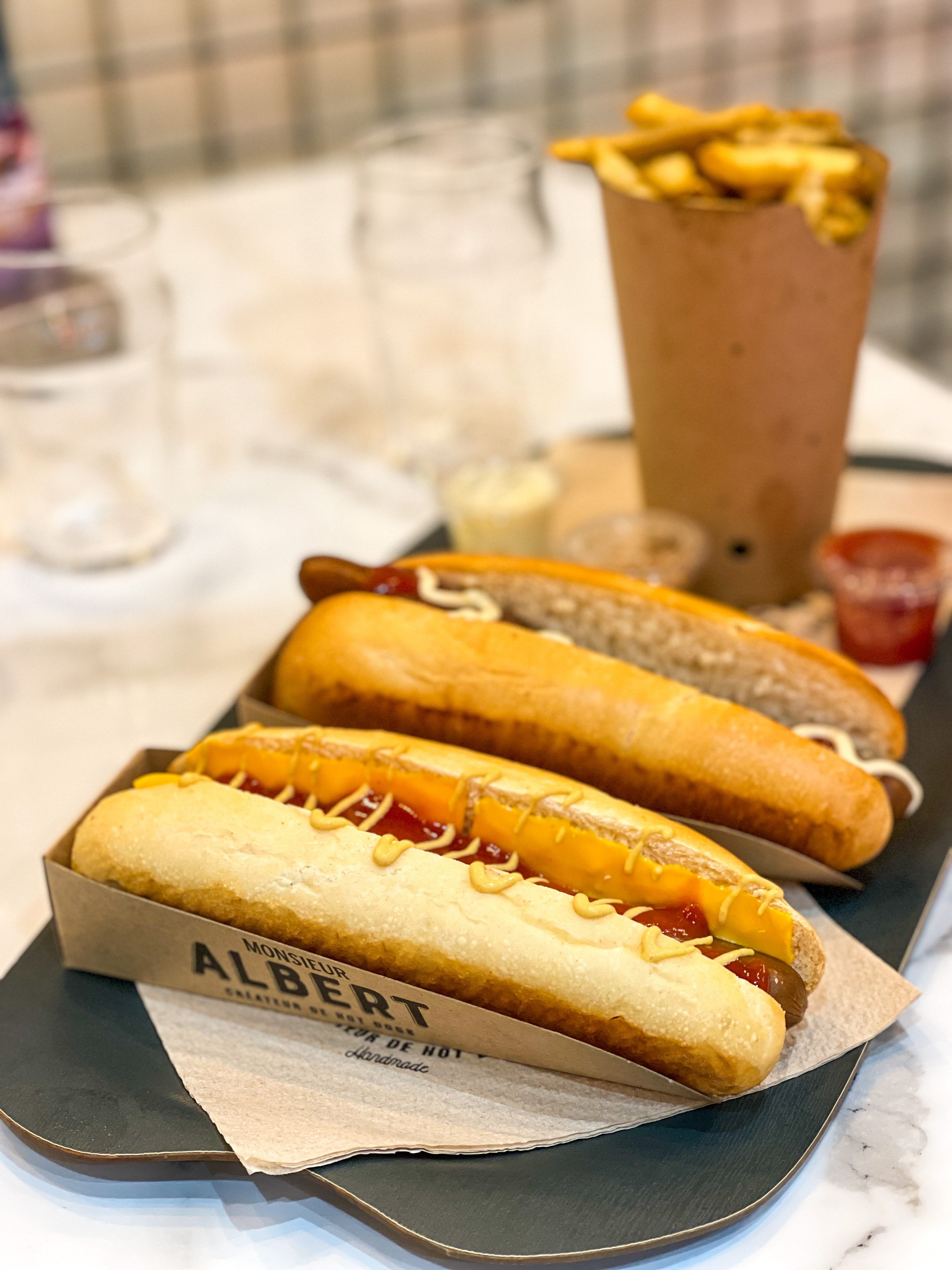 Très bonne ambiance, accueil chaleureux et toujours souriant. J'ai beaucoup apprécié le hot-dog monsieur Albert et les frites maison sont incroyables. Pour le dessert ou même le goûter, les hots gaufres sont une belles découvertes. Possibilité de manger sur places ou as emporter et même présent sur uber eats. Je viens assez souvent et je recommande vivement !