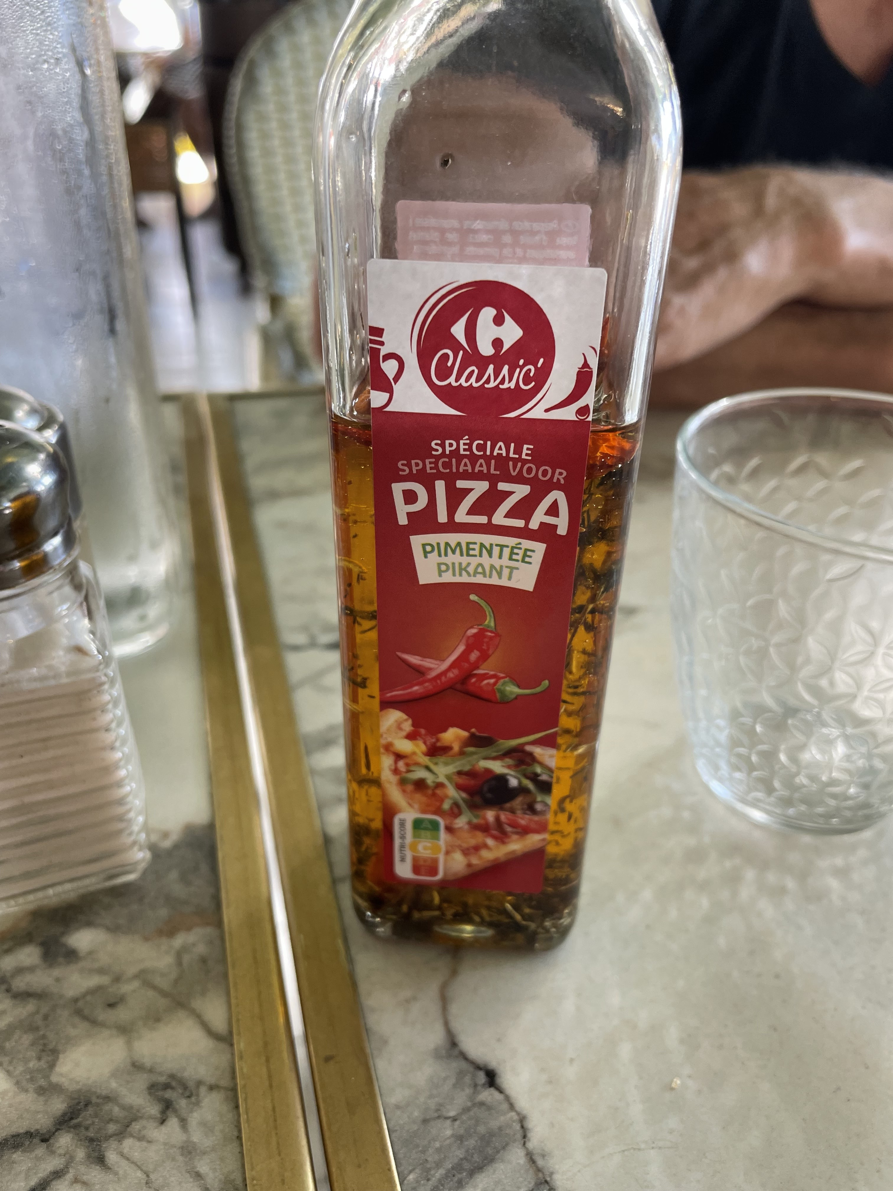 Apparement un restaurant carrefour. Mais pas les mêmes prix bien sûr ….. Quand j’ai dis « c’est de l’huile carrefour », la serveuse me l’a arraché des mains en me disant vous n’en voulez pas ?!.. Cela dit, une pizza sans garniture pas besoin d’huile ! Voir photo :