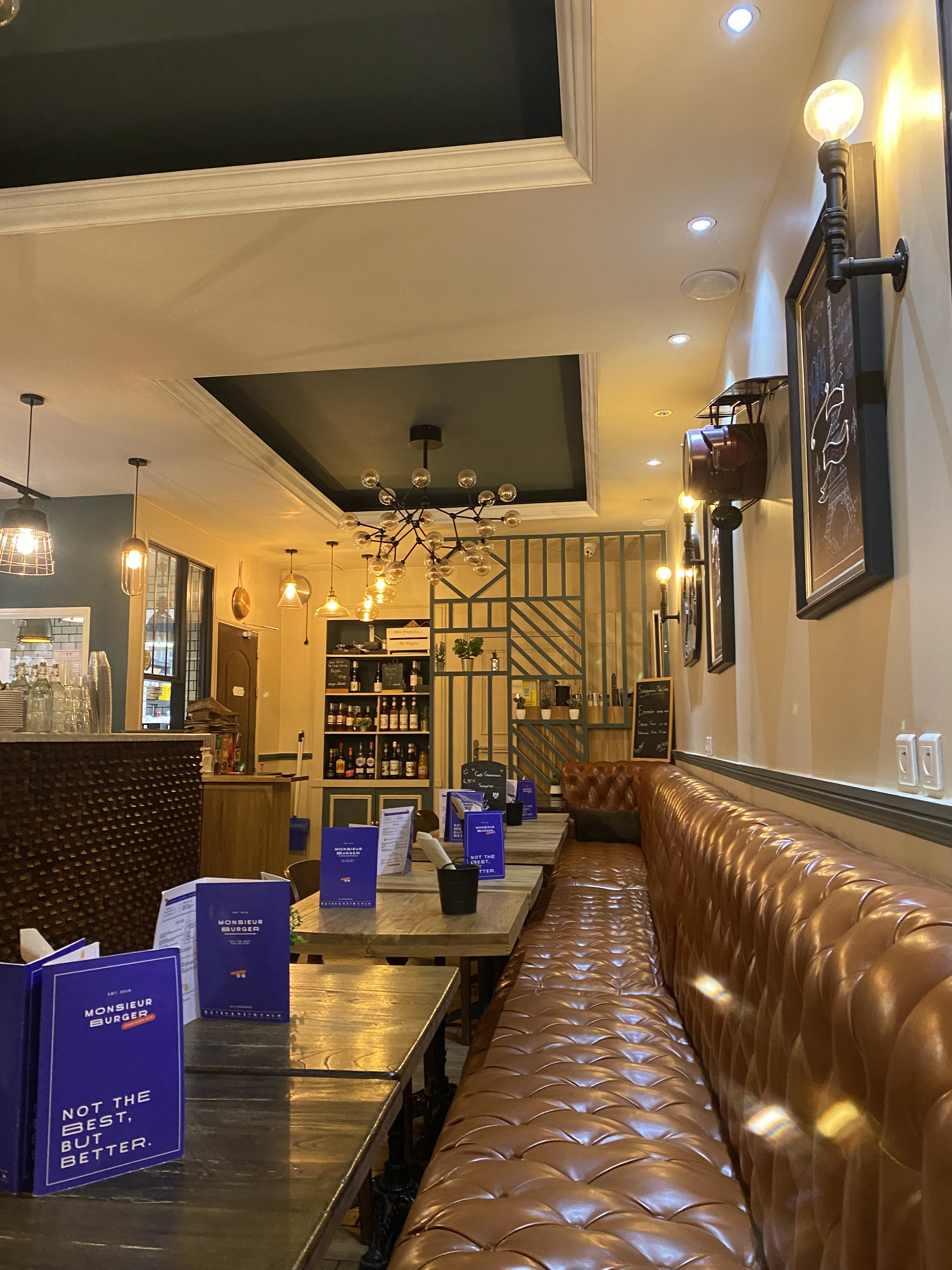 Monsieur Burger sert ses homeburgers avec classe et délicatesse dans un cadre sobre et chic. Vous y dégusterez vos plats dans une ambiance musicale topissime. Tous les chemins mènent à Monsieur Burger : burgers goûtus, service de qualité, et personnel souriant. Que demande le peuple ?! Ave Monsieur Burger ! On se lève tous pour... s'y rendre et découvrir le burger du mois : l'incroyable Hulk !