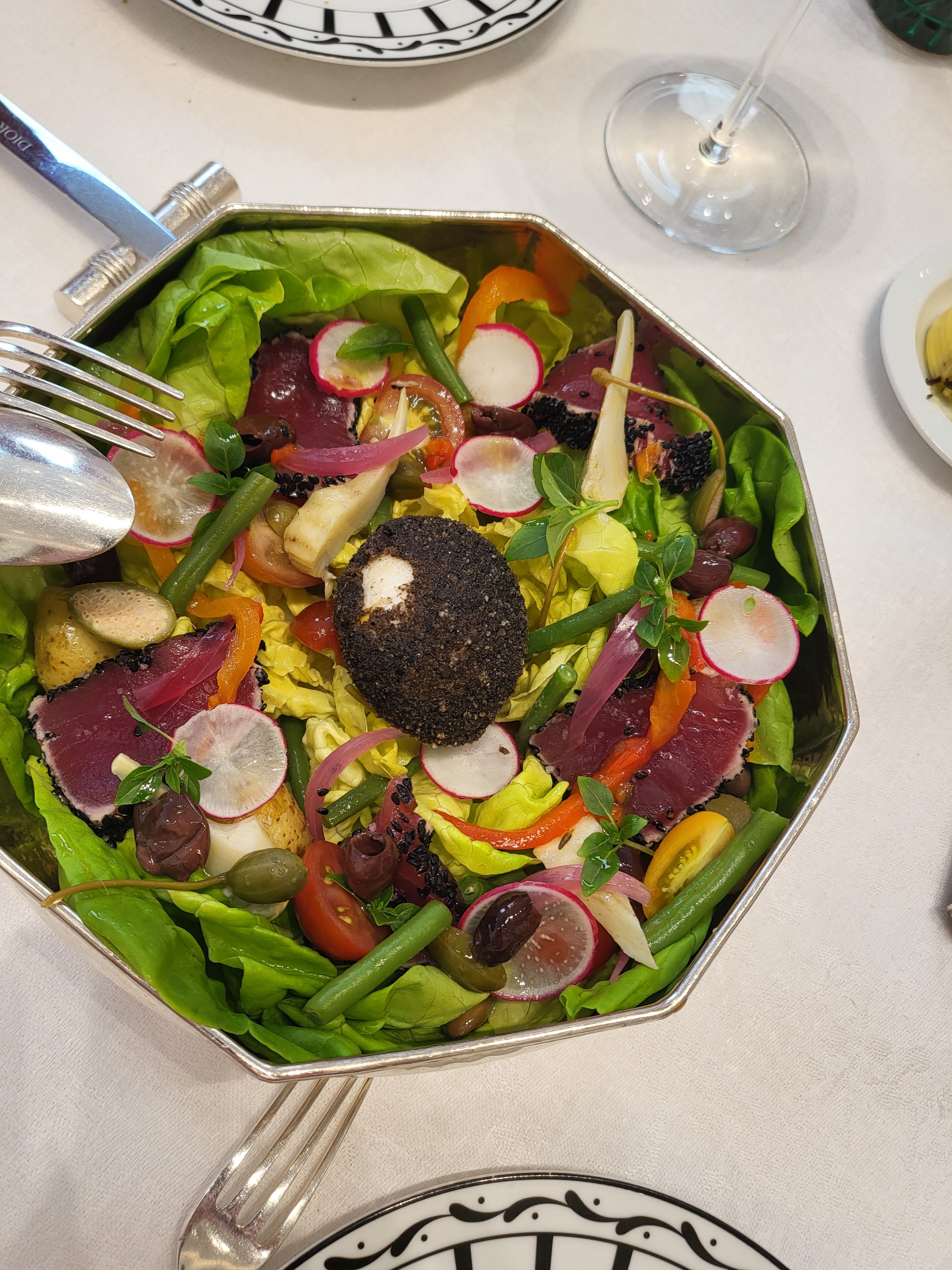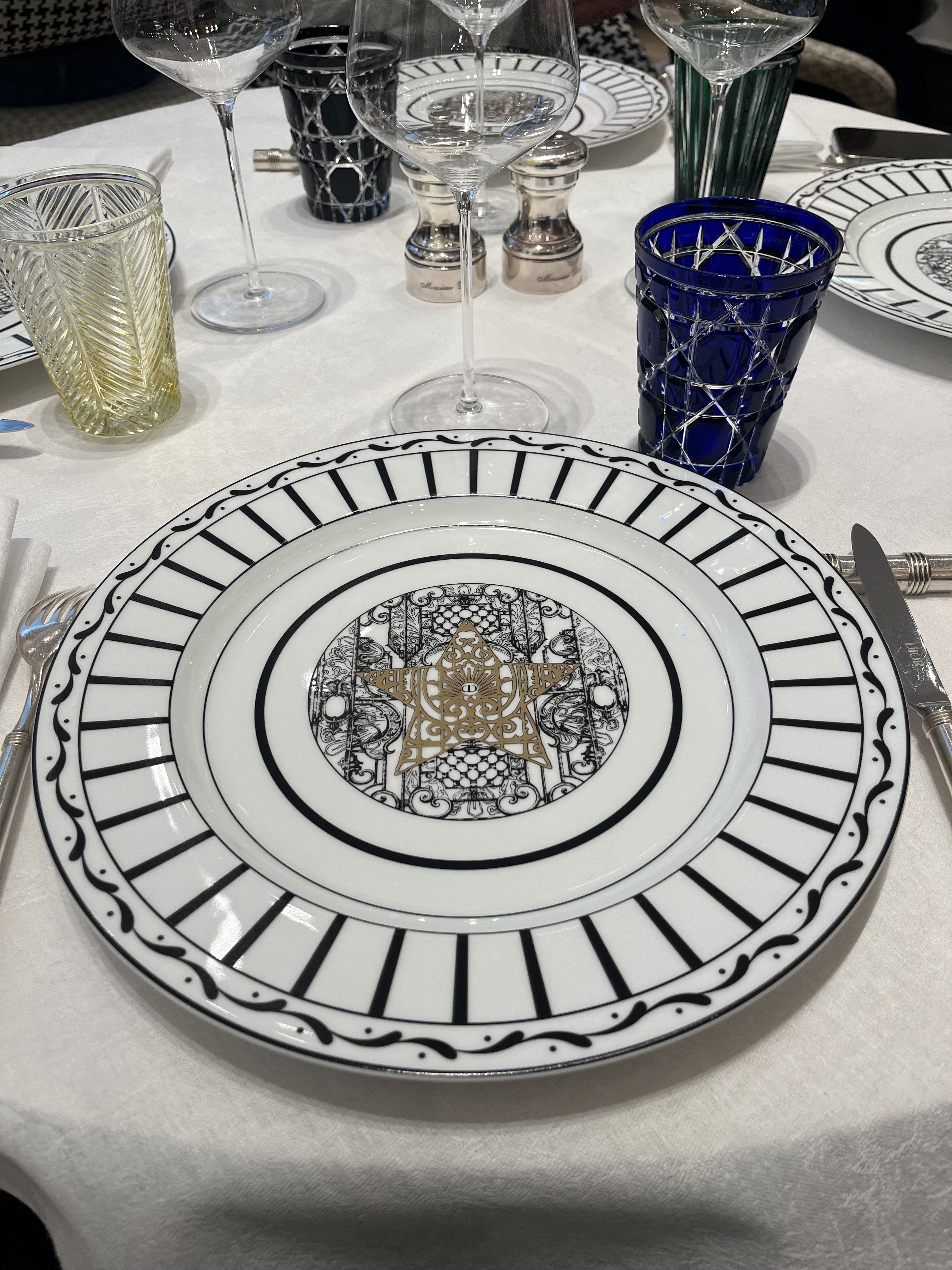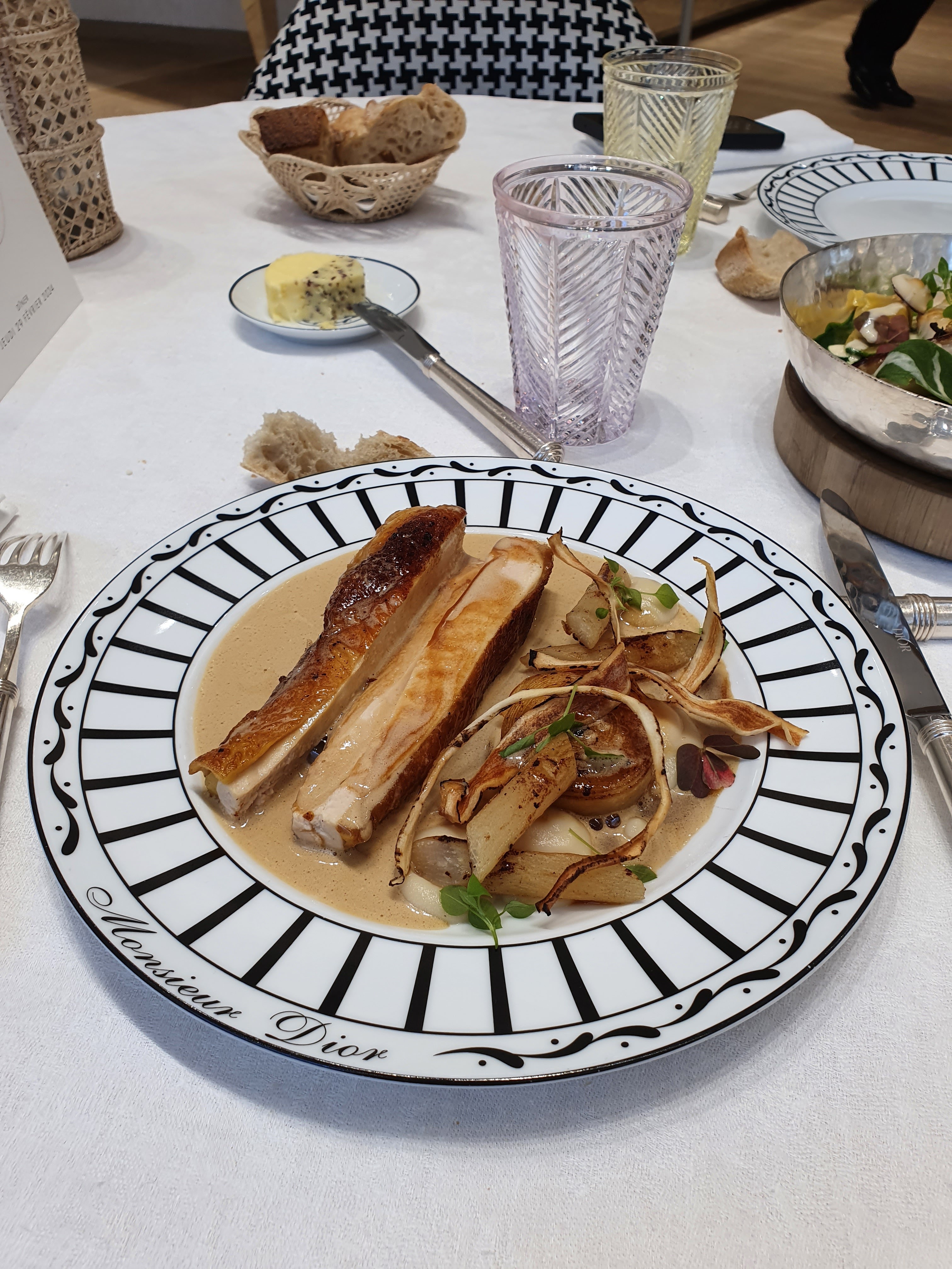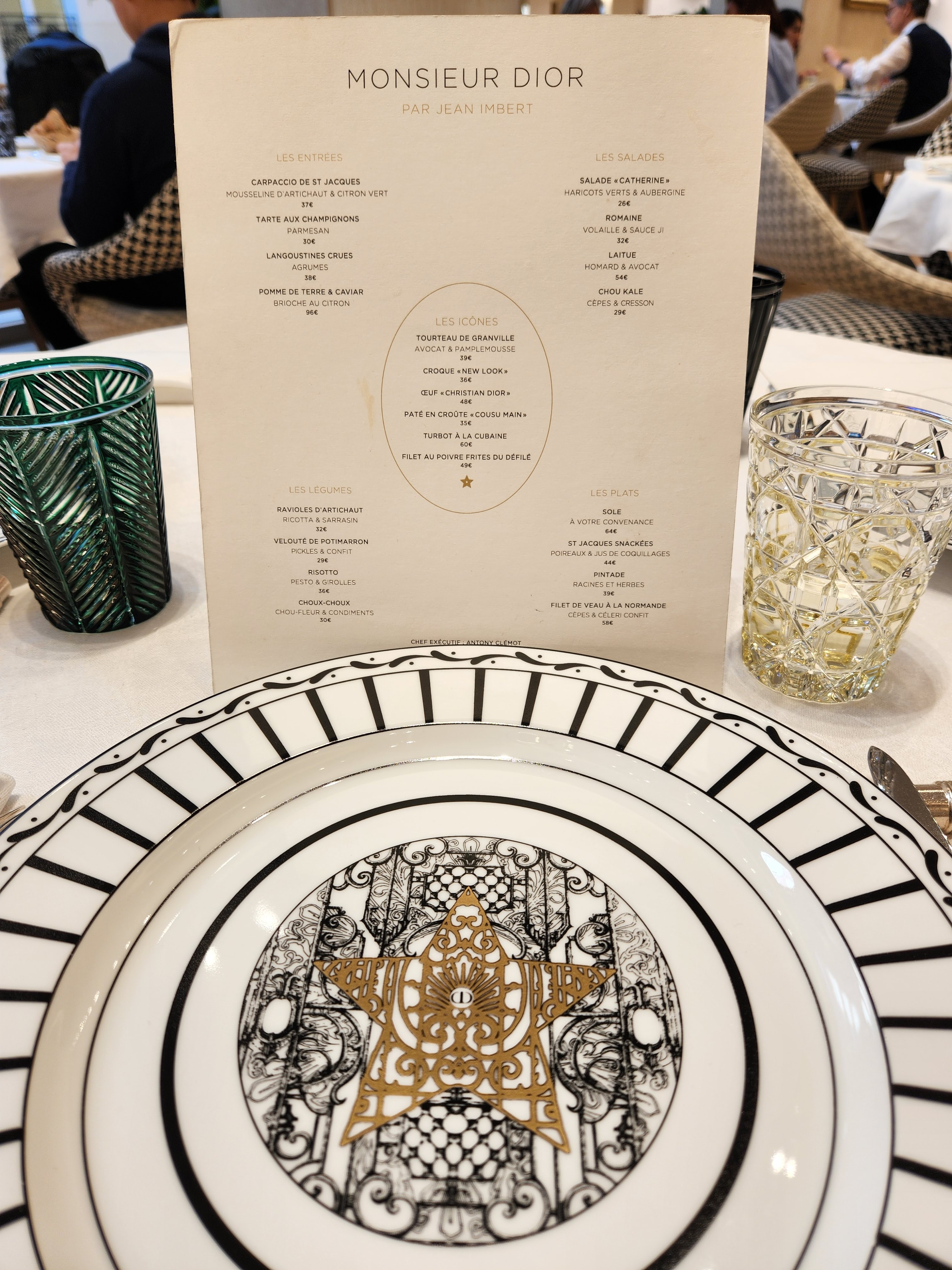 Personnellement, j'ai mangé une salade César revisitée, elle n'était pas du tout à mon goût, j'ai tout laissé. et à mon grant étonnement, le serveur est venu reprendre mon assiette sans me proposer un autre choix qui me faire plaisir. Je ne retournerai pas manger chez Monsieur Dior. Je ne recommanderai pas à mes amis d'y aller. Lieu magique. Vaisselle splendide.