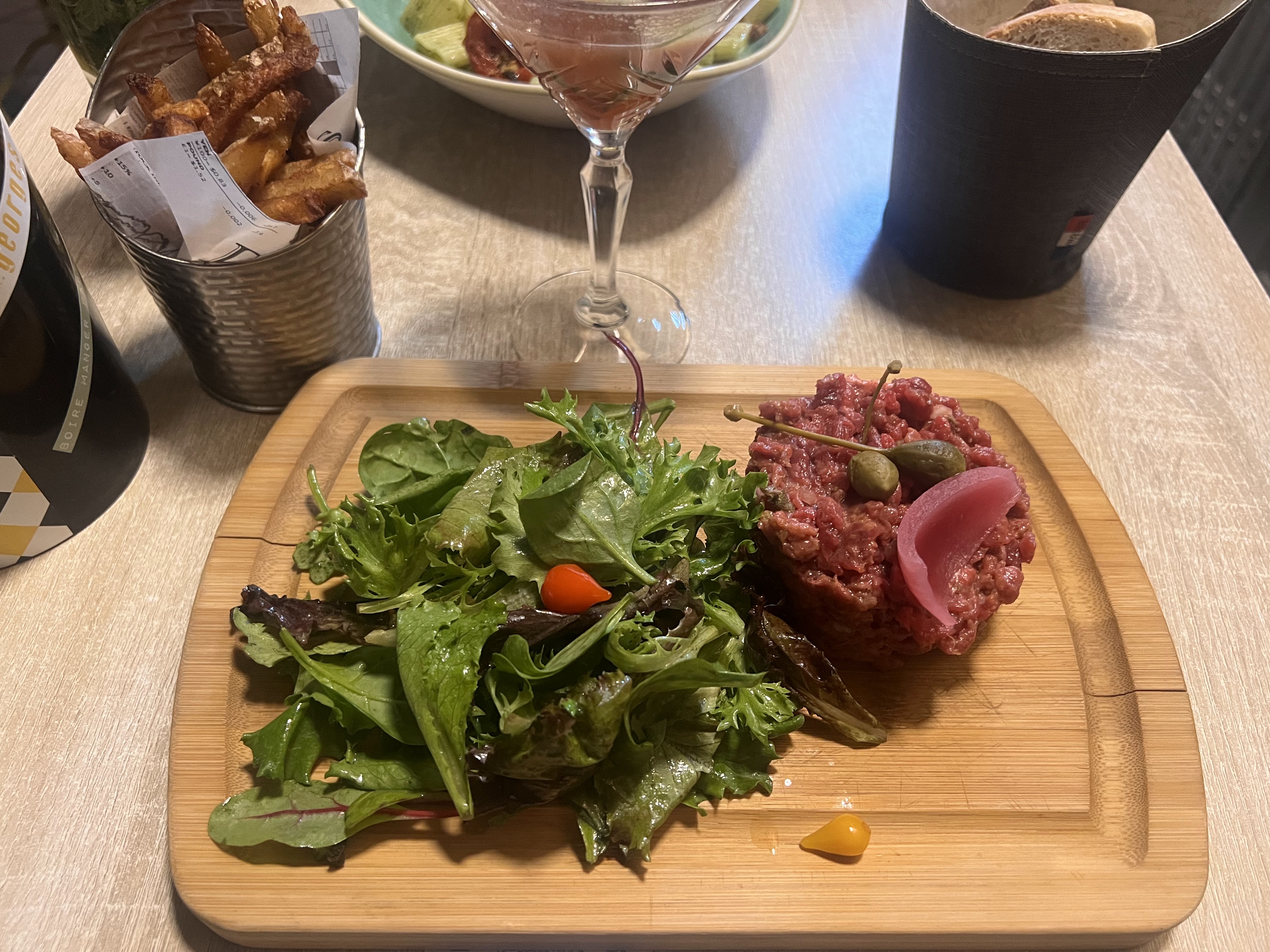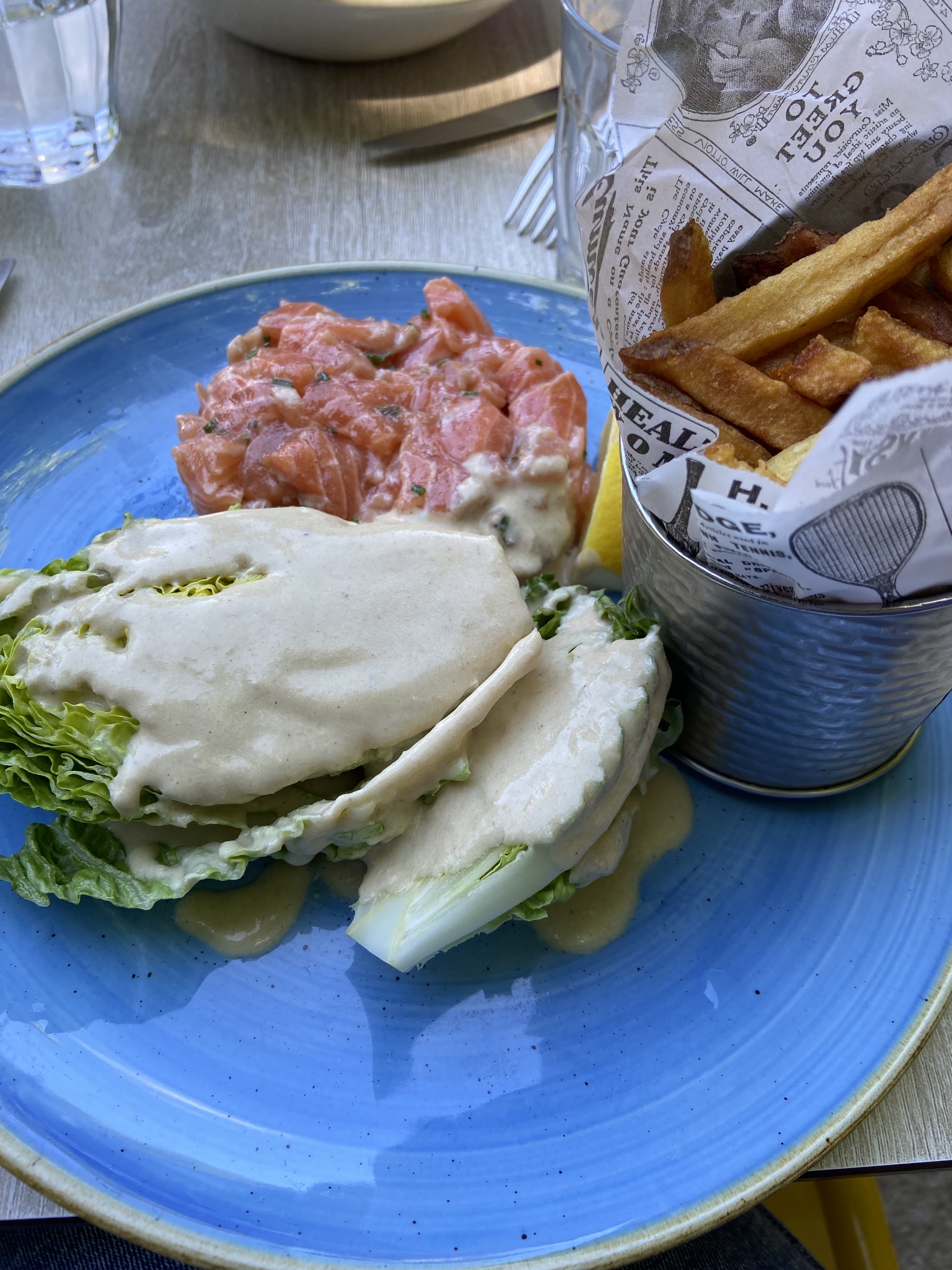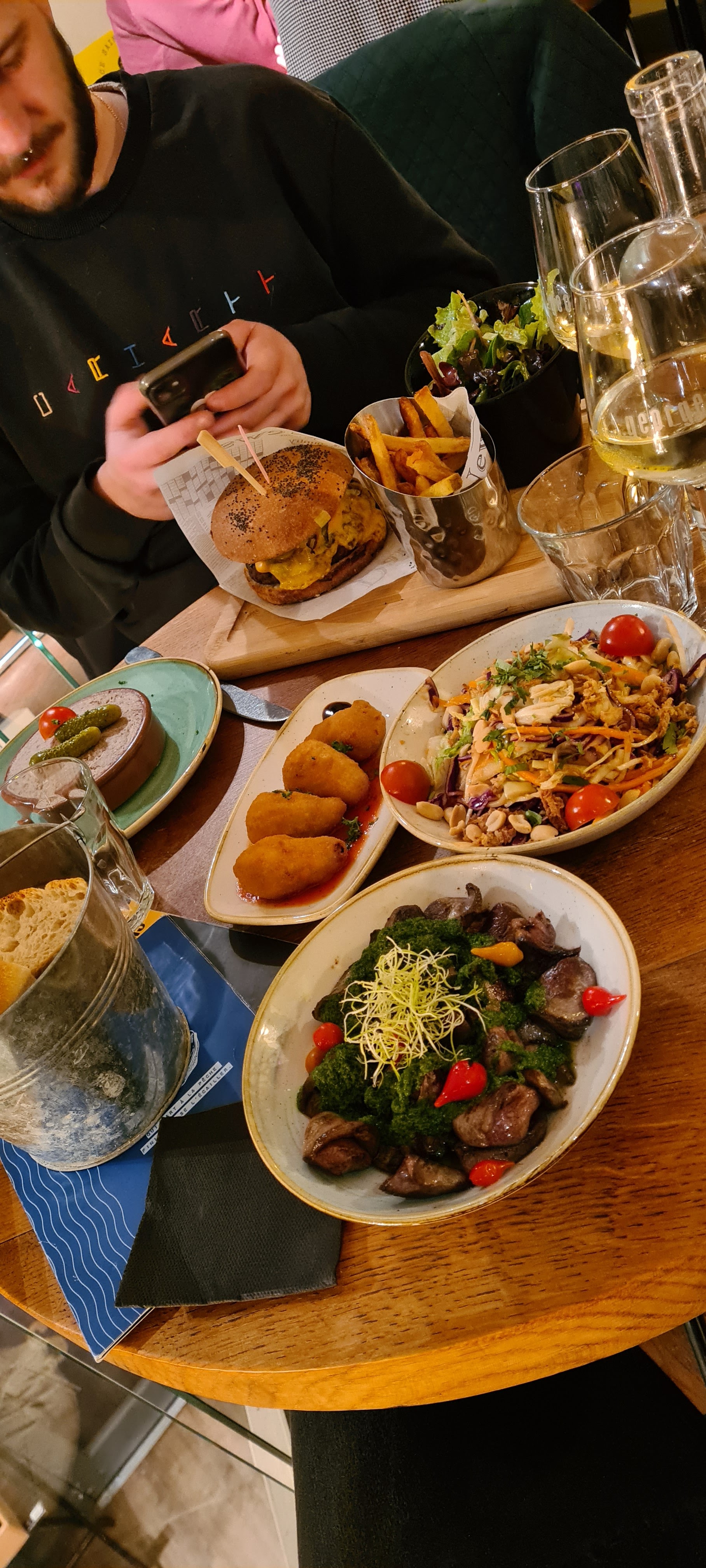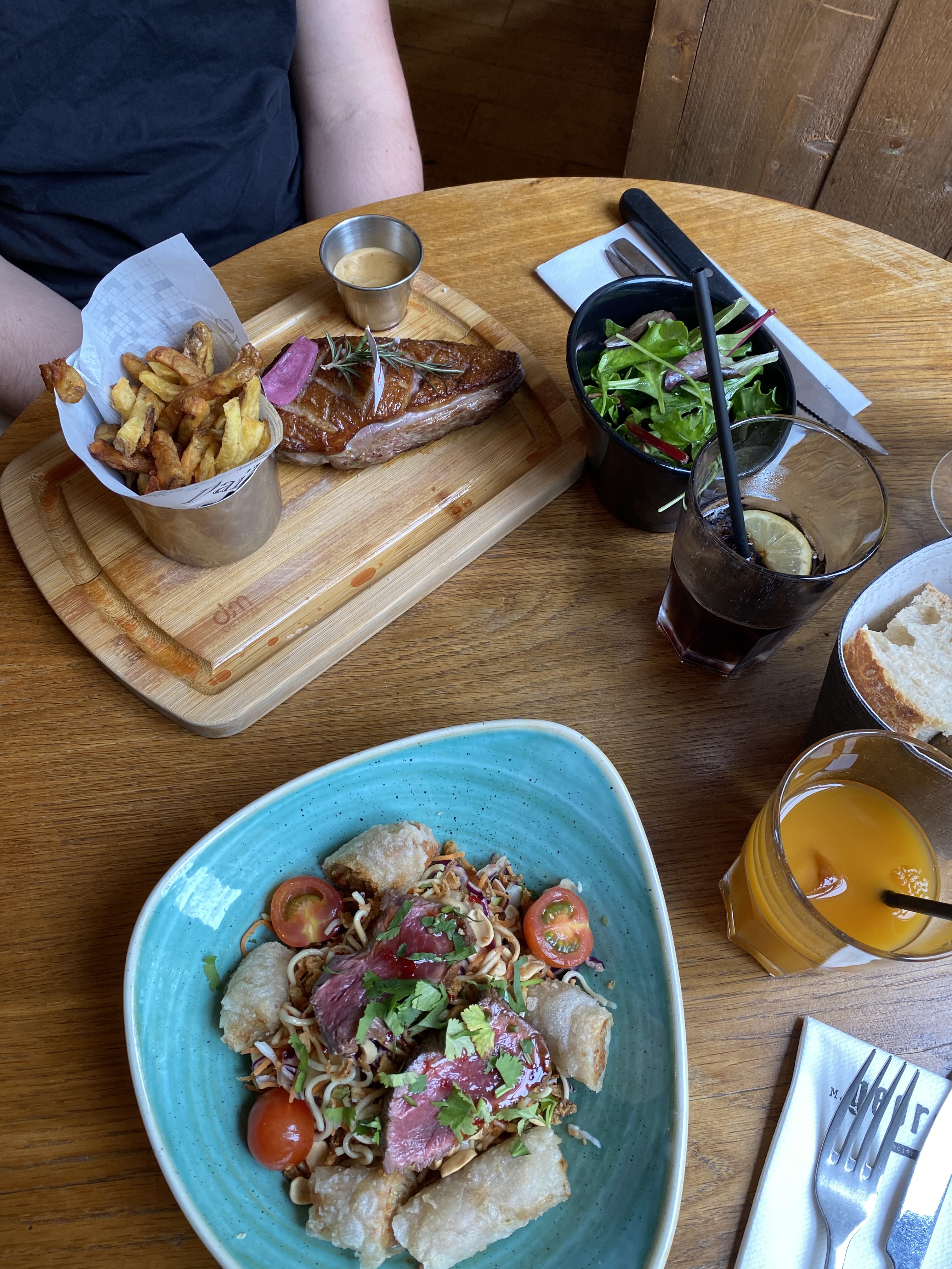 Les entrées ont été apportées avant les boissons. Le repas était simple et gourmand même si nous avons été déçus des frites qui donnaient envie à première vue. Le personnel reste très accueillant tout de même.