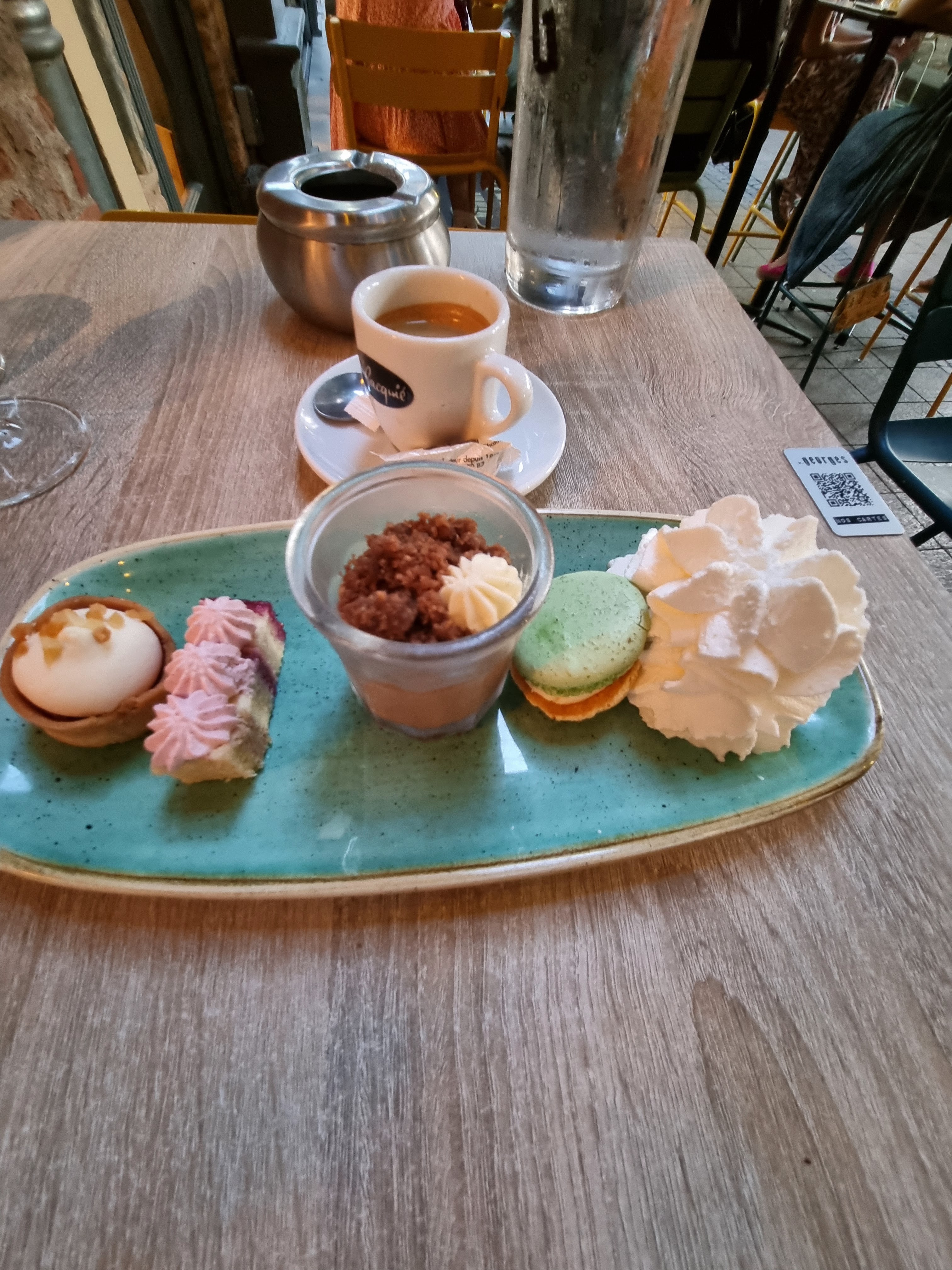 Excellente expérience , j'étais avec mes deux chiens , ils ont eu droit à la gamelle d'eau sans demander , merci . Repas servi assez rapidement malgré le monde , le jambon serrano et le burger une tuerie , parfait , je recommande