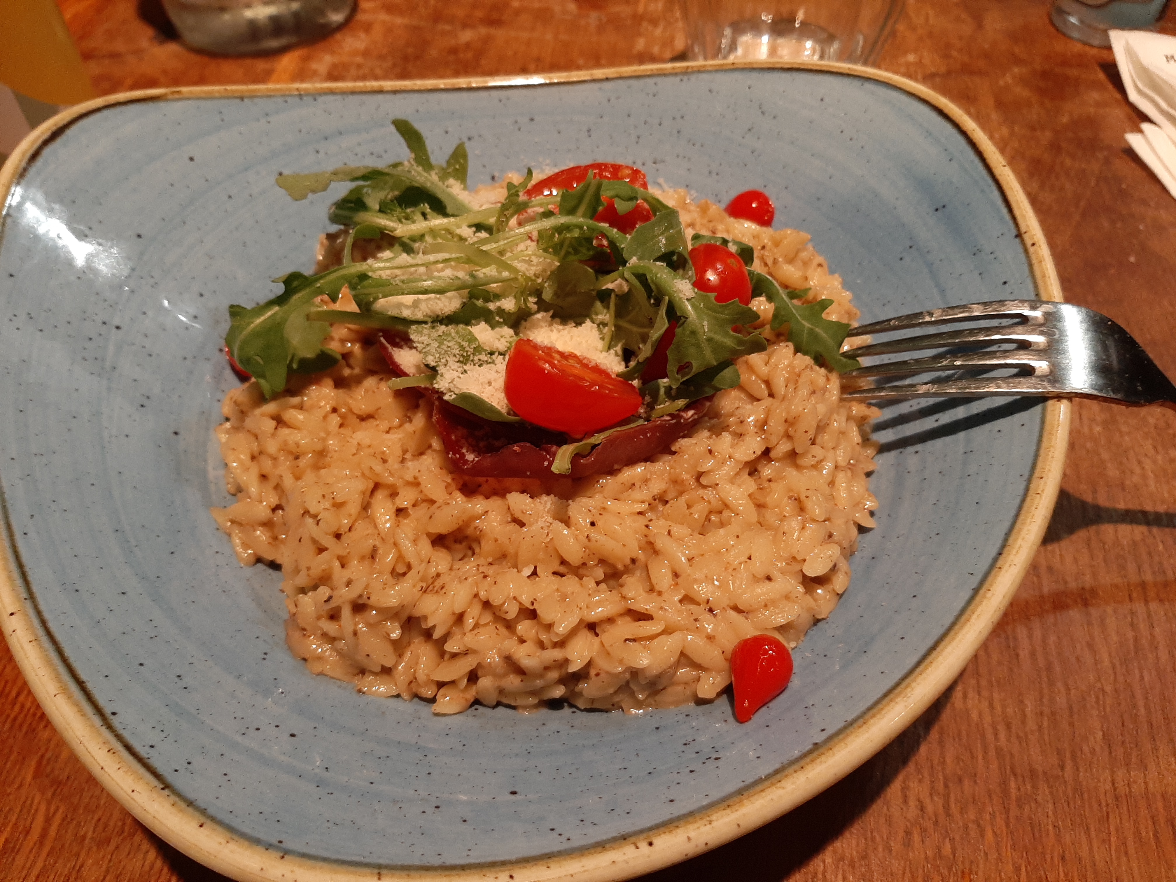 D'abord monter deux étages pour accéder sa table,puis descendre un étage et en remonter un autre pour accéder aux toilettes, un service nul qui porte un plat non commandé et qui allait oublier le plat principal, un œuf froid,un risotto très moyen et en plus assez cher.Au total très très moyen et je suis gentil.