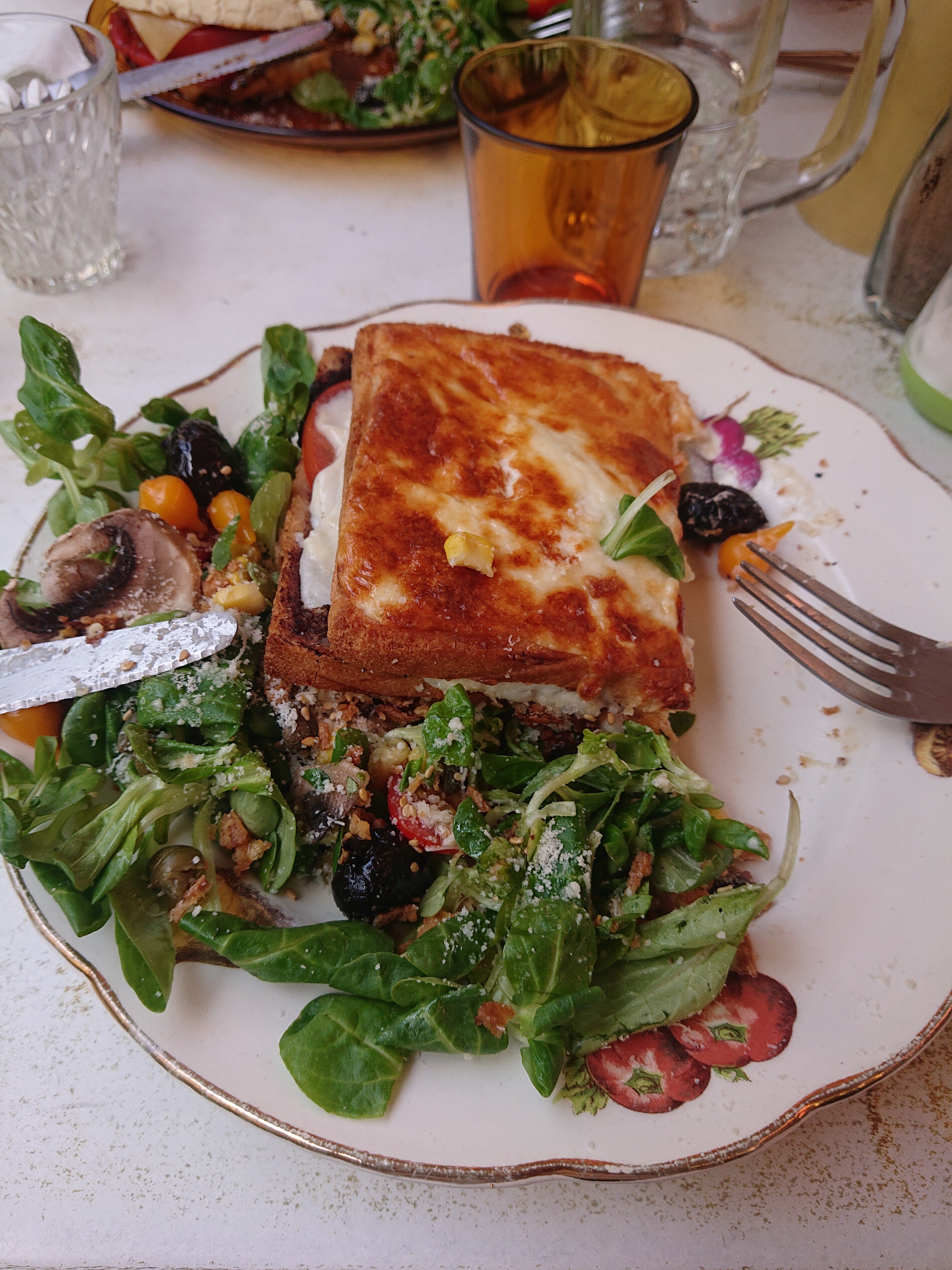 Les croques madame/monsieur étaient délicieux !! Mais le plat du jour (que j'ai oublié de photographier) était superlatif : Brochettes de bœuf avec tartare de concombre, tomate grillée et pâté d'olives. Environnement très beau et unique! Recommandation à toute personne de passage à Marseille