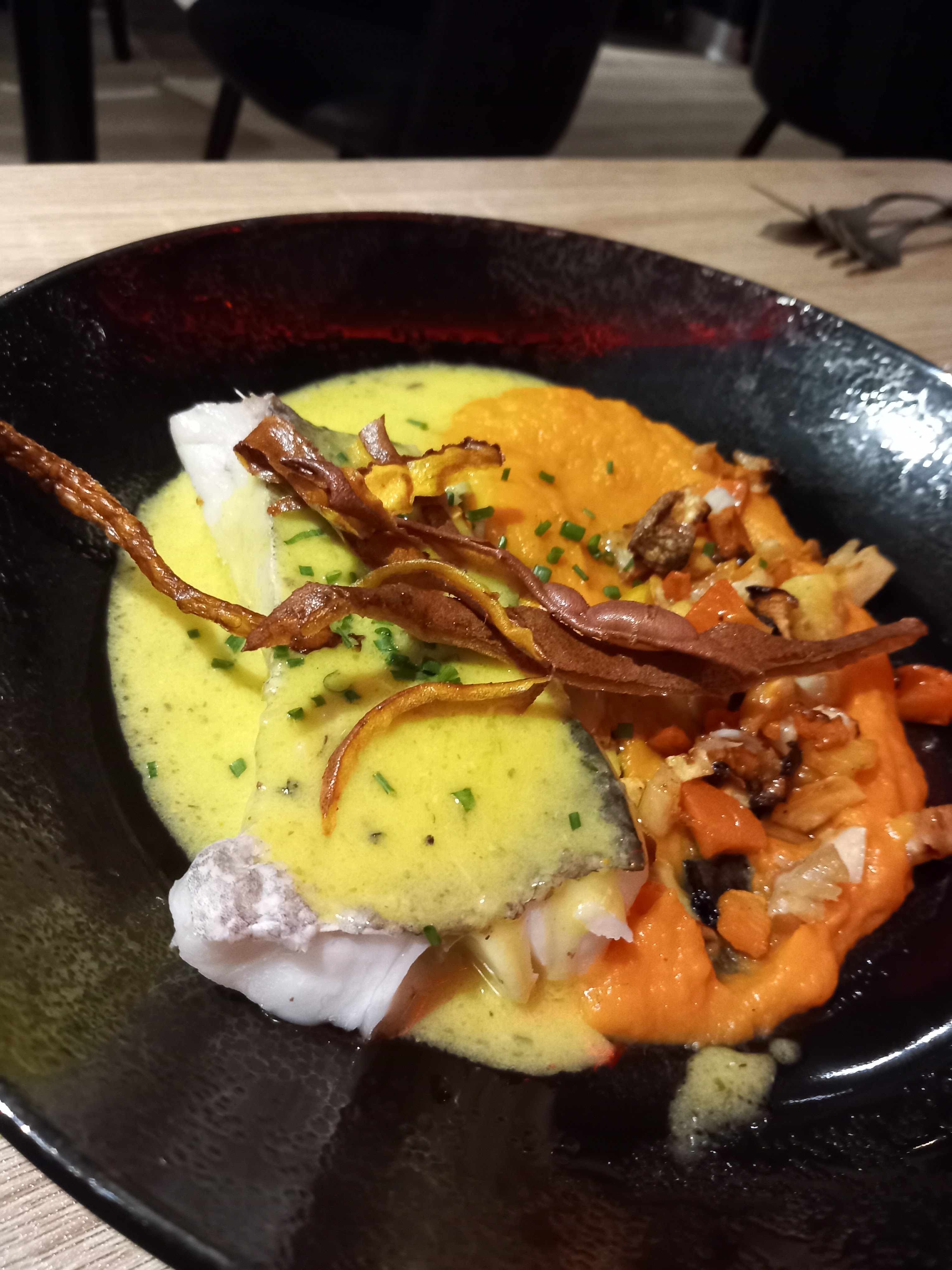 Accueil au top, dîner délicieux, service impeccable. Seul bémol pour moi le fauteuil sans dossier haut, mon dos a un peu souffert durant la soirée. Sinon parfait je recommande vivement.