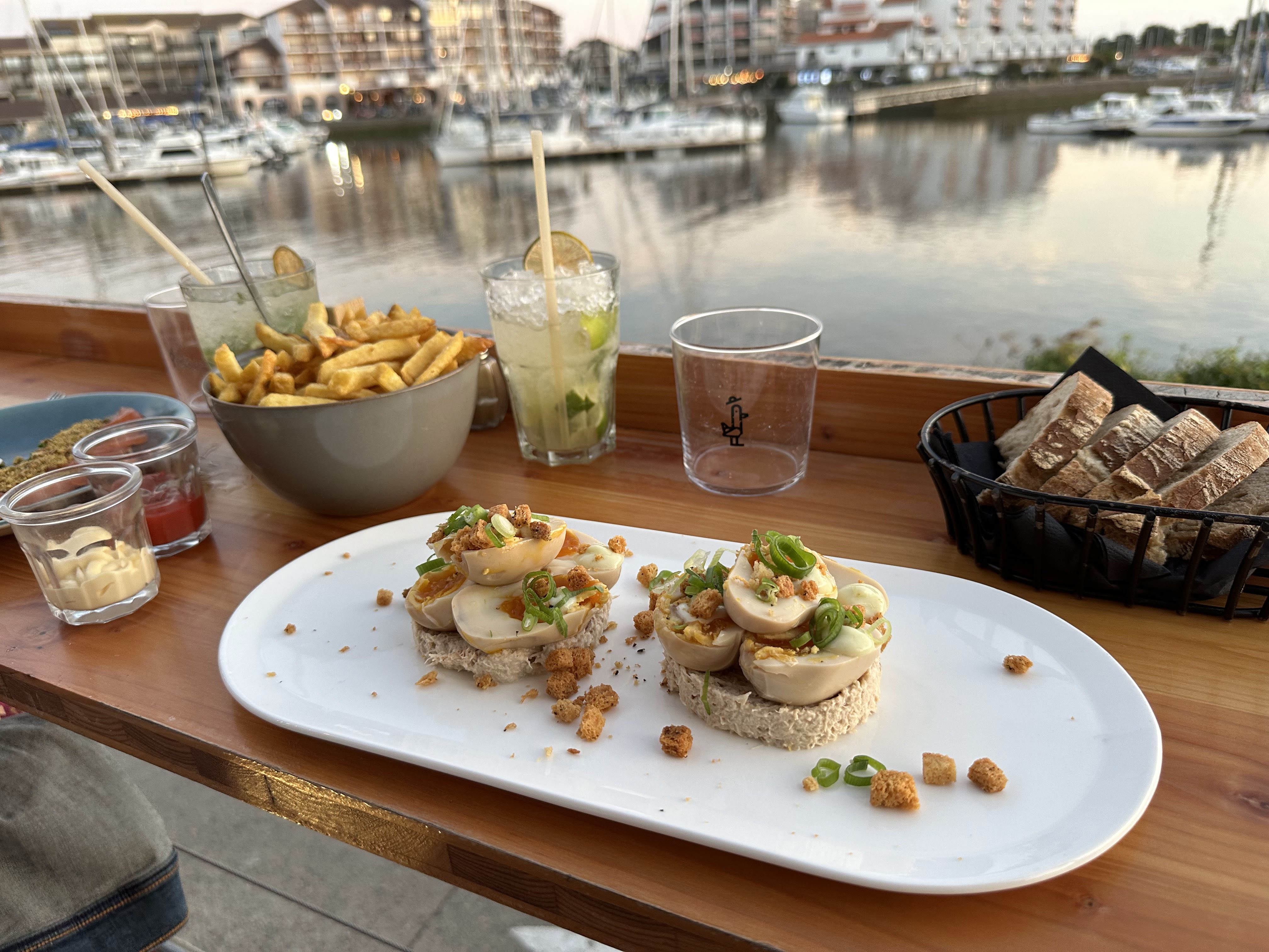 topppp , terrasse magnifique sur le port de Capbreton , DJ du mercredi au vendredi , accueil au top , serveuses au top , cocktails et nourriture vraiment délicieuses , thon , hamburger , et les desserts , miam , 2 fois que nous y allons et nous y retournerons