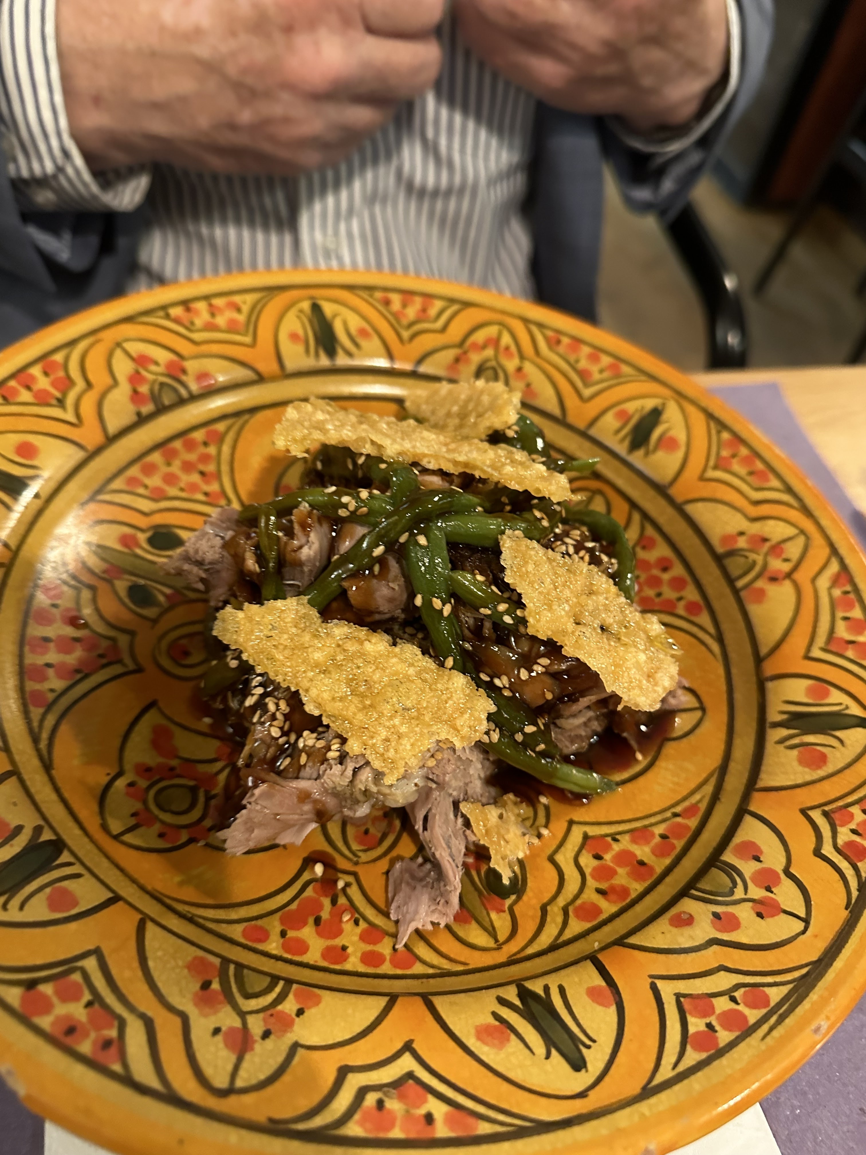 Nous étions un groupe de 4 et sans réservation nous n'aurions pas pu trouver une table. L'emplacement du restaurant se trouve dans une rue étroite et confortable à proximité du cœur du centre-ville. Nous avons commandé deux tapas pour commencer, 4 entrées (œuf parfait et mules) et pour dîner « bœuf tigre qui pleure », 1 bouteille de vin rouge et 4 coups de vin blanc. La nourriture était bonne et bien cuisinée, la ratatouille était bien faite. Pourquoi pas un 4 ou 5 étoiles ? Le service était un peu trop long (et ils se sont trompés dans une commande) mais très sympa, le prix était agressif (50 euros par personne), la qualité de la nourriture pourrait être portée au niveau supérieur sur les plats principaux (moins de pommes de terre et moins de ratatouille). Je conseille de l'essayer, mais il y a des marges d'amélioration pour les restaurateurs.