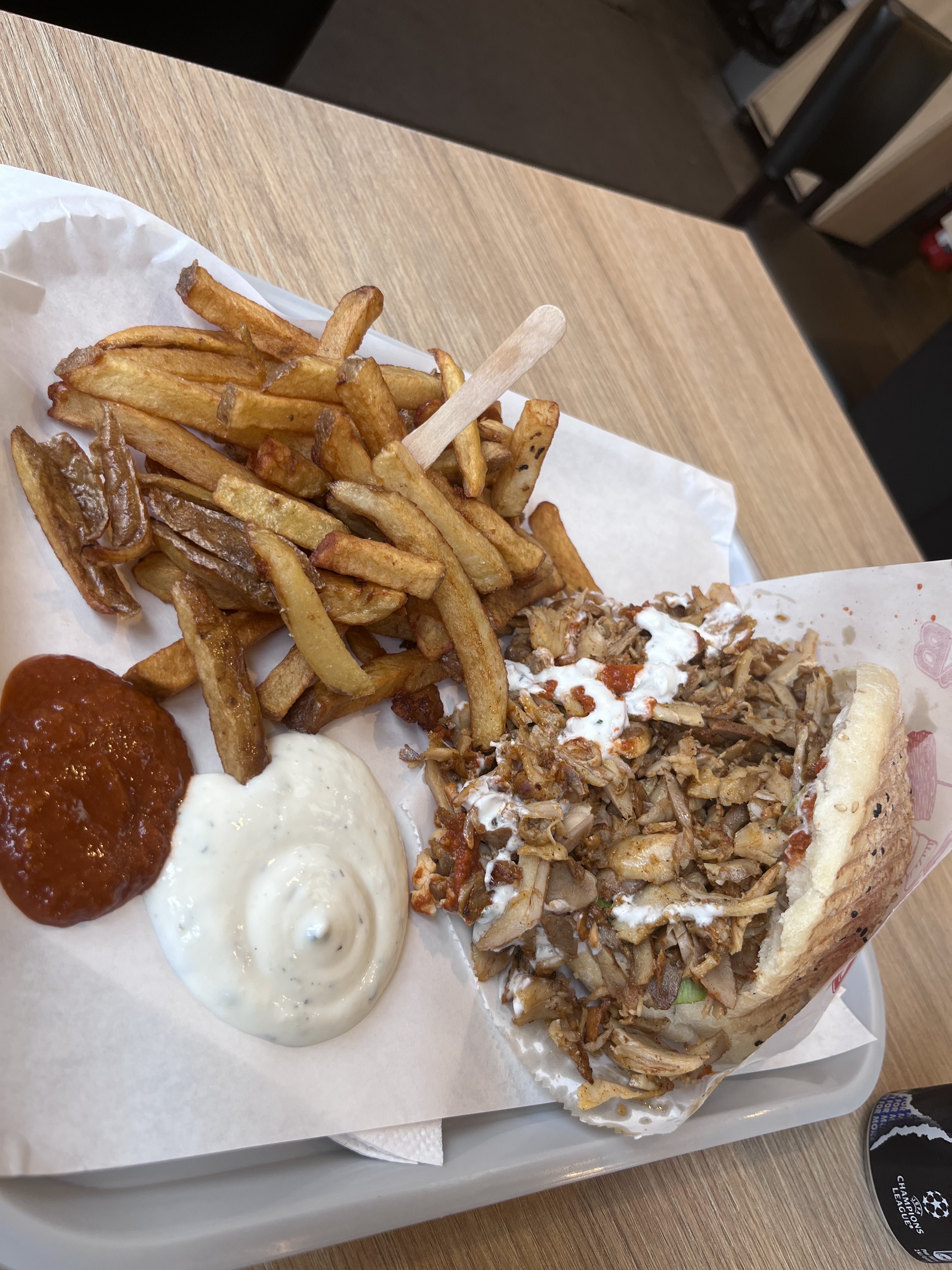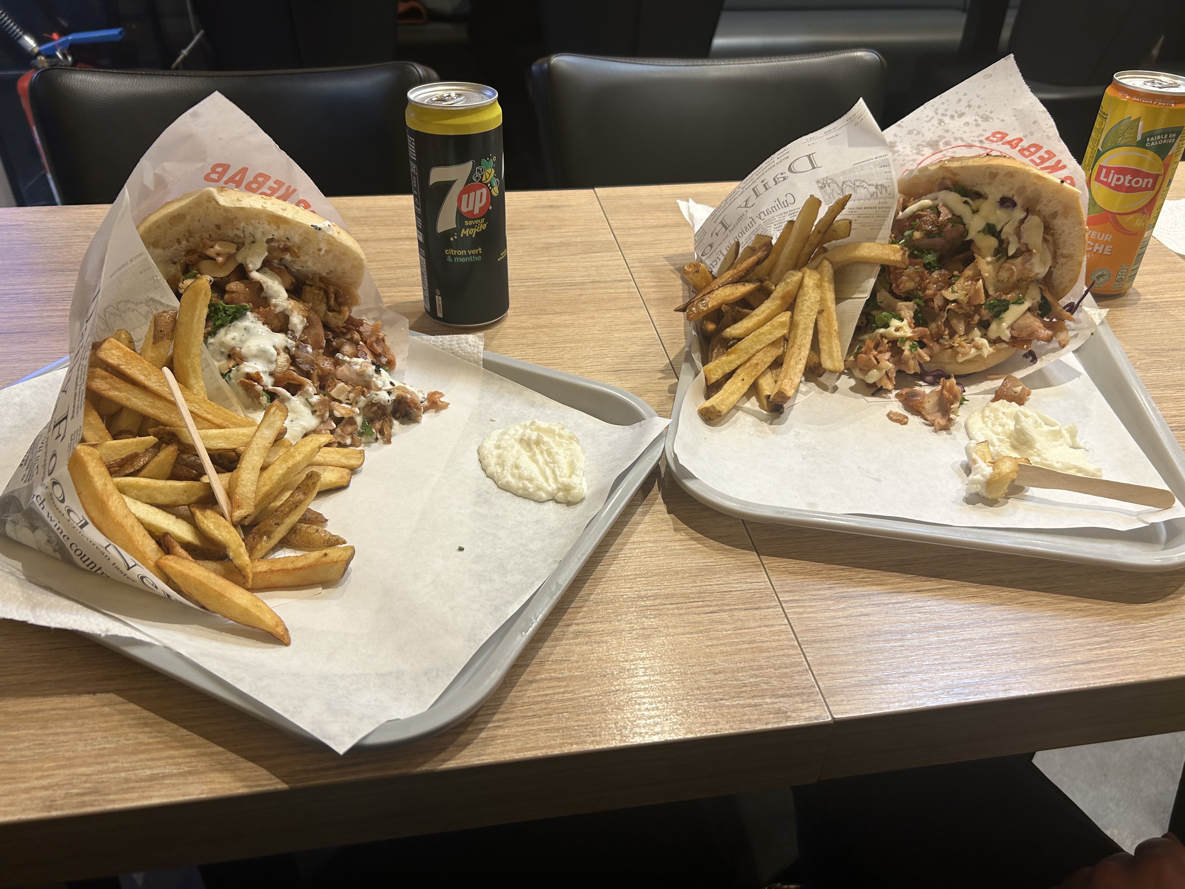 Nous avons pris 2 menus determann, frite malheureusement froide …et très peux de frite par rapport au prix ( 25 euro deux menus avec boisson frite ) , le kebab était garnis mais pas assez de sauce à l’intérieur je le trouvais trop sec , mise à part le « gras » du kebab : le point positif c’est les sauces qui sont excellentes ainsi que le pain du kebab qui et moelleux 😊