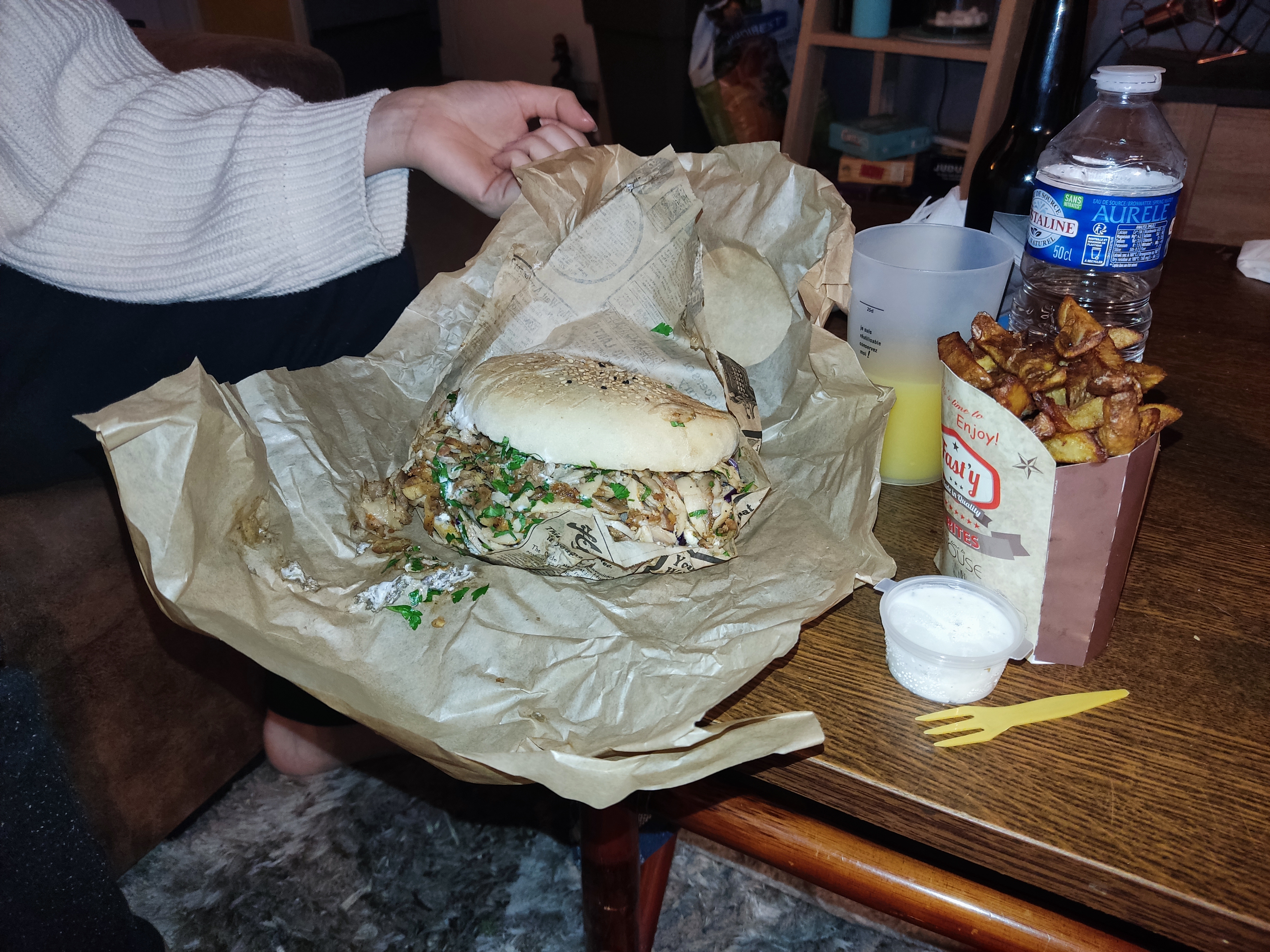 La mayonnaise à l'ail et les frites sont pas mal, mais le kebab est beaucoup beaucoup trop gras, il suinte littéralement je n'ai jamais vu cela.