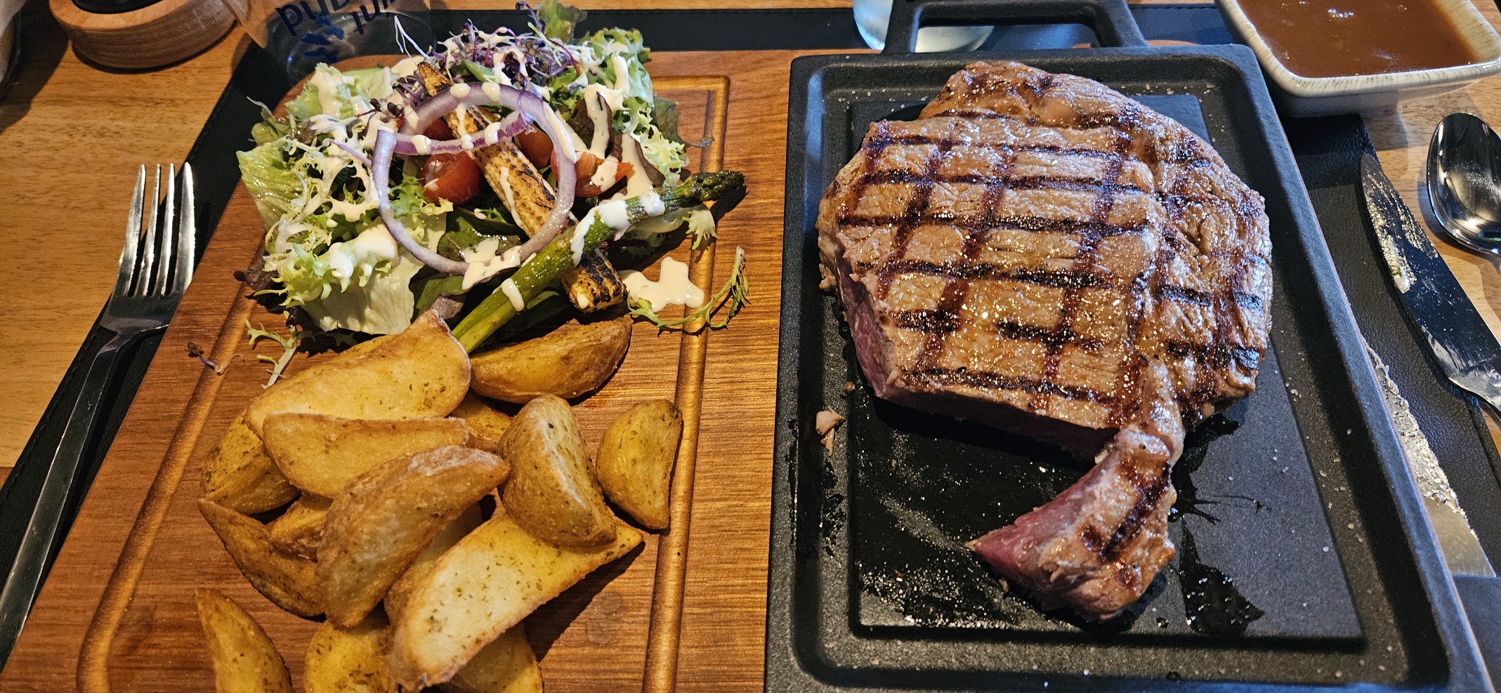 Cocktail Cuba libre =glaçons, frites =potatoes, côté à l'os=pleine de gras, tout est dit, nous avons patienté 2h pour avoir les plats, je demande la bière du mois puisque la tireuse l'indique sur la bar. Il n'y en a pas. Oui c'était le premier jour, cela n'excuse pas tout, la prochaine fois ce sera sans moi ... puisque j'habite à proximité je n'hésiterais pas à faire marcher le bouche à oreille. Vu le prix, fuyez ! La seule étoile est pour le rumsteck qui etait excellent et le vin également. C'est sévère mais à l'image de ma première expérience ça ne vaut pas plus