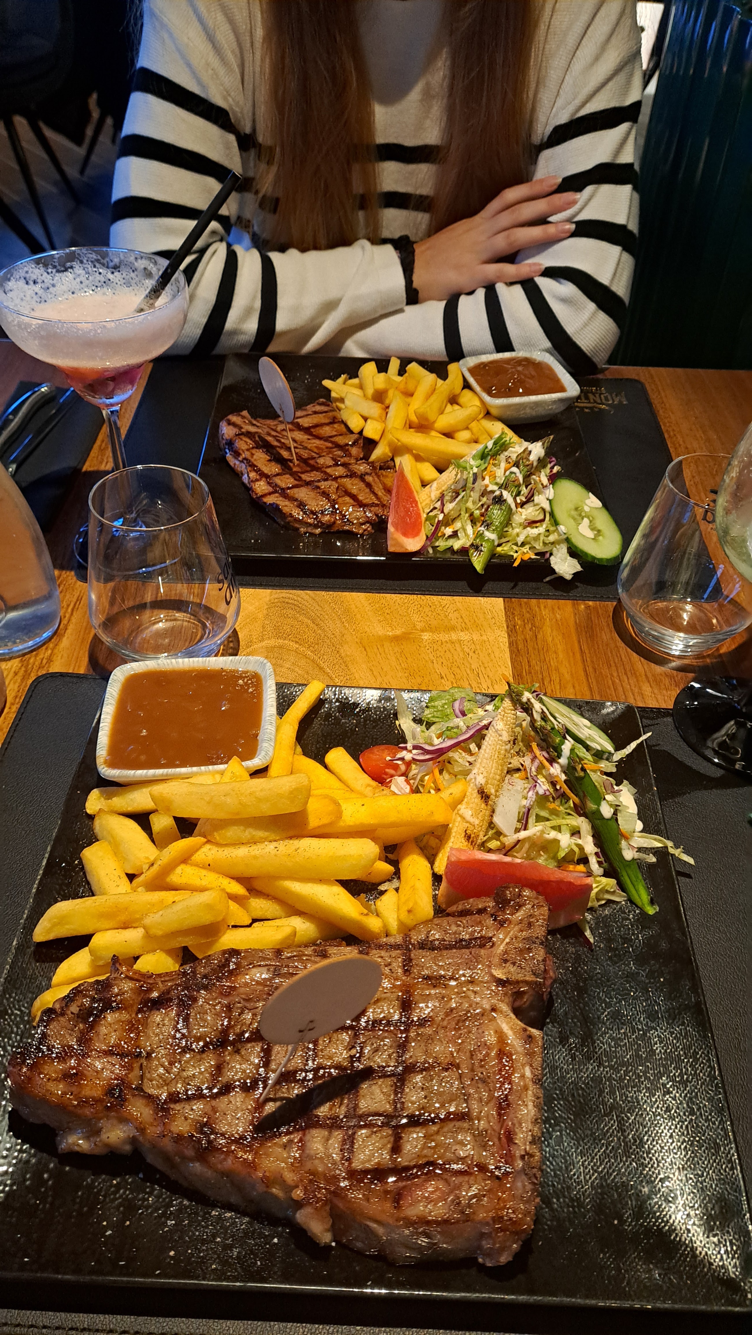Un bel endroit. On nous installe sous l’enceinte mais nous demande de suite si l’on souhaite moins de son. Chaise enfant disponible pour un moment agréable en famille. Cocktail, soft et bière apportés rapidement. Coktail frais et bien dosé. Assiettes bien servies et cuissons respectées. Viande délicieuse (Bavette/T-Bone/Steak haché). Une boule de glace vanille, une crème brûlée ou juste un café pour terminer sur une bonne note sucrée. Notre serveuse, Emilie, est très professionnelle et sait mettre à l’aise les clients. Un prix très correct au vu de la qualité servie. Nous reviendrons avec plaisir.