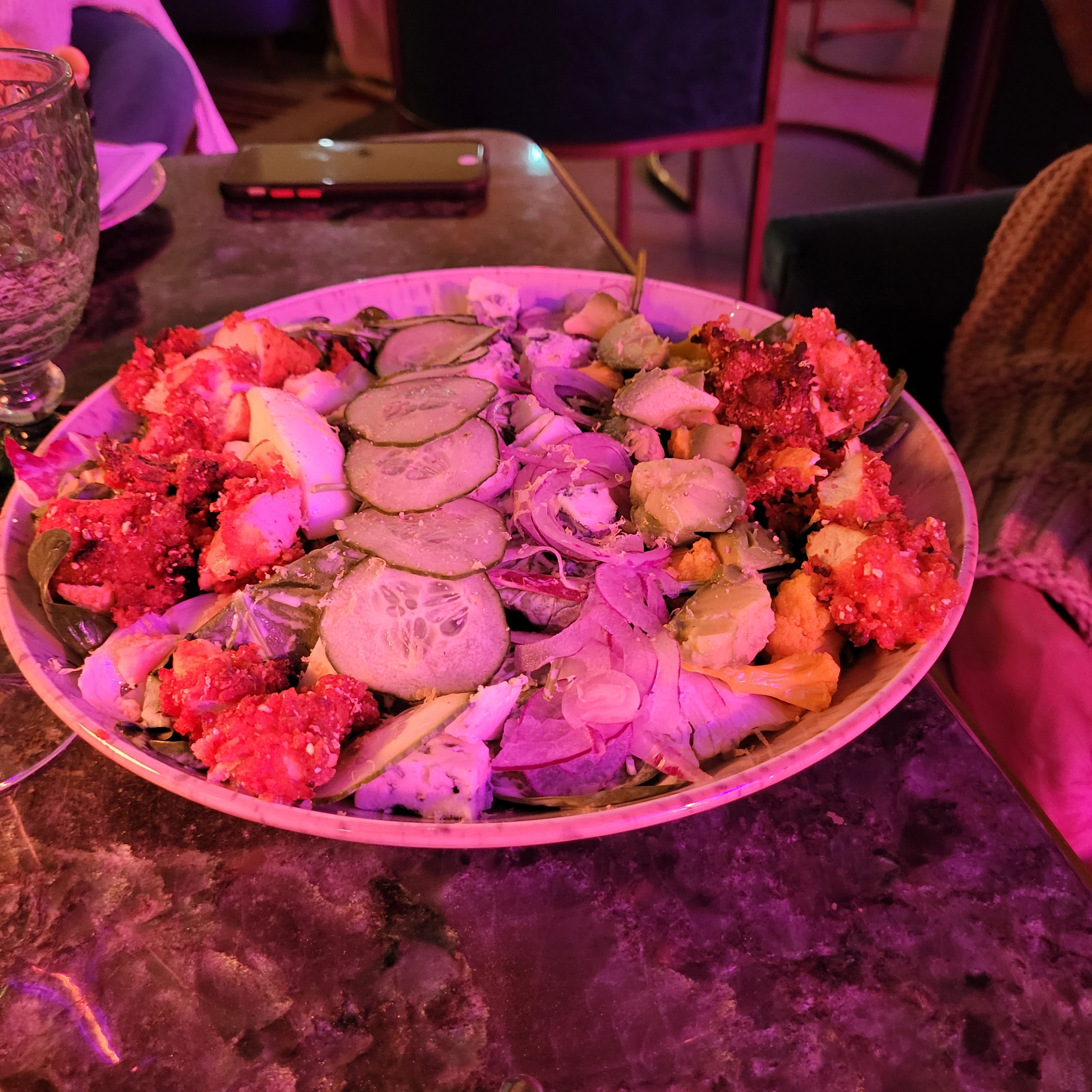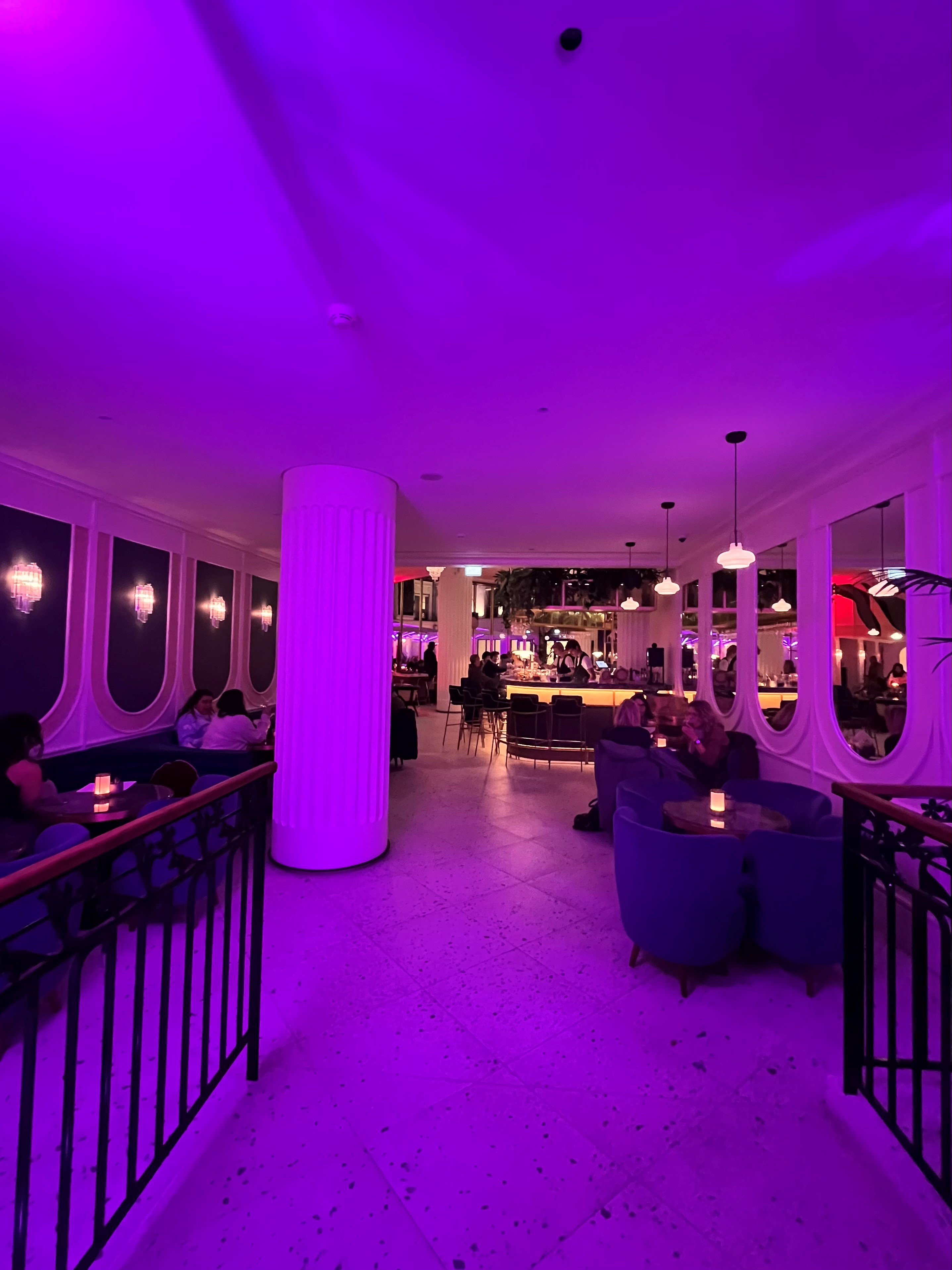 Pas fan de cette lumière violette le soir alors que le lieu a l’air très beau mais cette lumière rend le tout un peu cheap . C’était relativement vide quand on y était pourtant un samedi soir et alors que la nourriture est très bonne. Il y a quelque chose à revoir côté atmosphère pour rendre le tout plus chaleureux