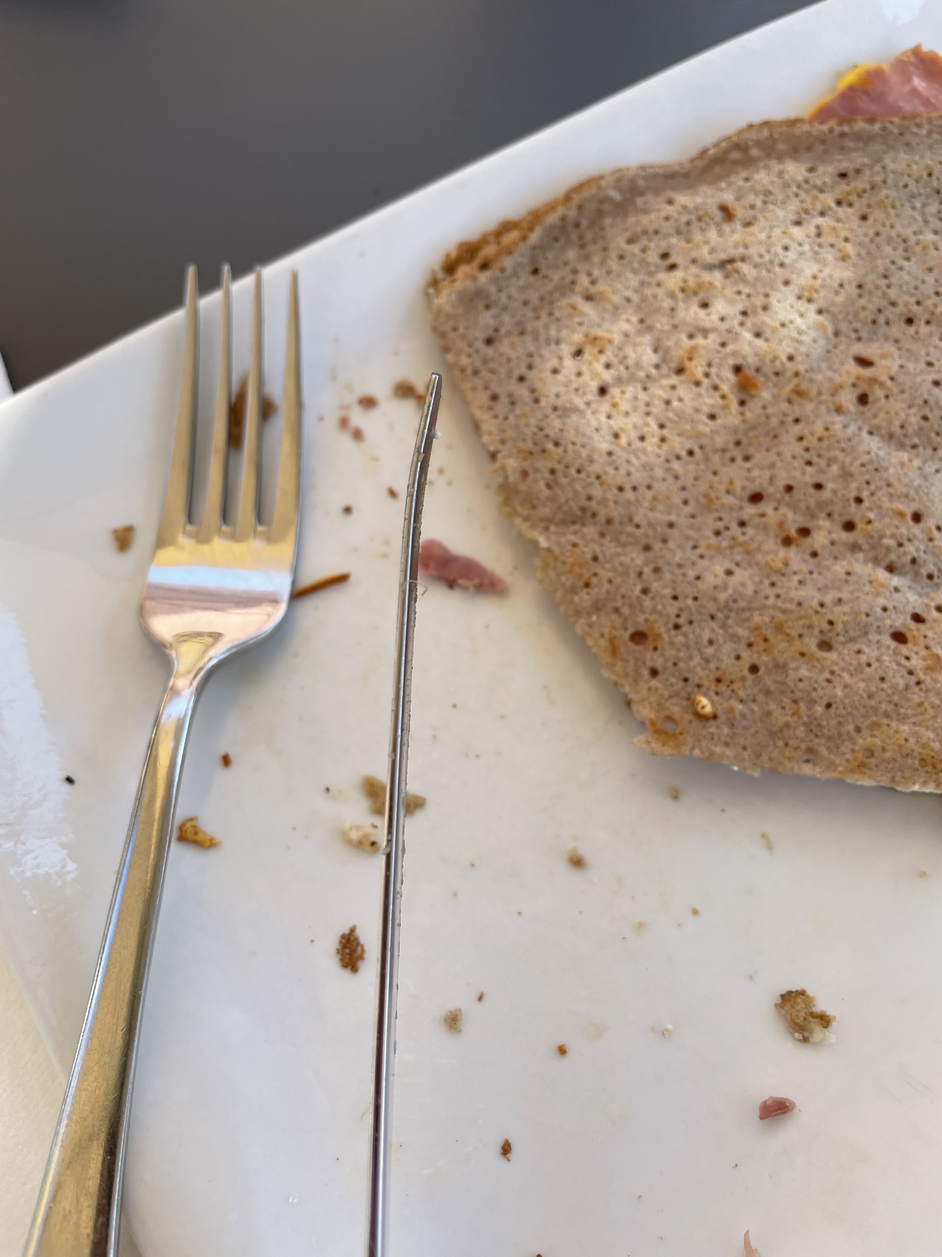 Sans doute aurions dû nous lire les avis avant d’entrer dans cette crêperie. Nous étions 5, personne n’a pu finir son assiette. Que dis-je, nous y avons tout juste goûté tant les produits sont de mauvaises qualité. Des galettes de sarrasin sorties tout droit d’un emballage plastique, idem pour les morceaux de poulet et le chorizo. Ouvrir un restaurant ne consiste pas seulement à faire des courses bas de gamme au supermarché pour les refiler au client sans aucune opération culinaire, le tout pour la modique somme de 60 euros, en ce qui nous concerne (sans dessert). Fuir ou alerter Philippe Etchebest!