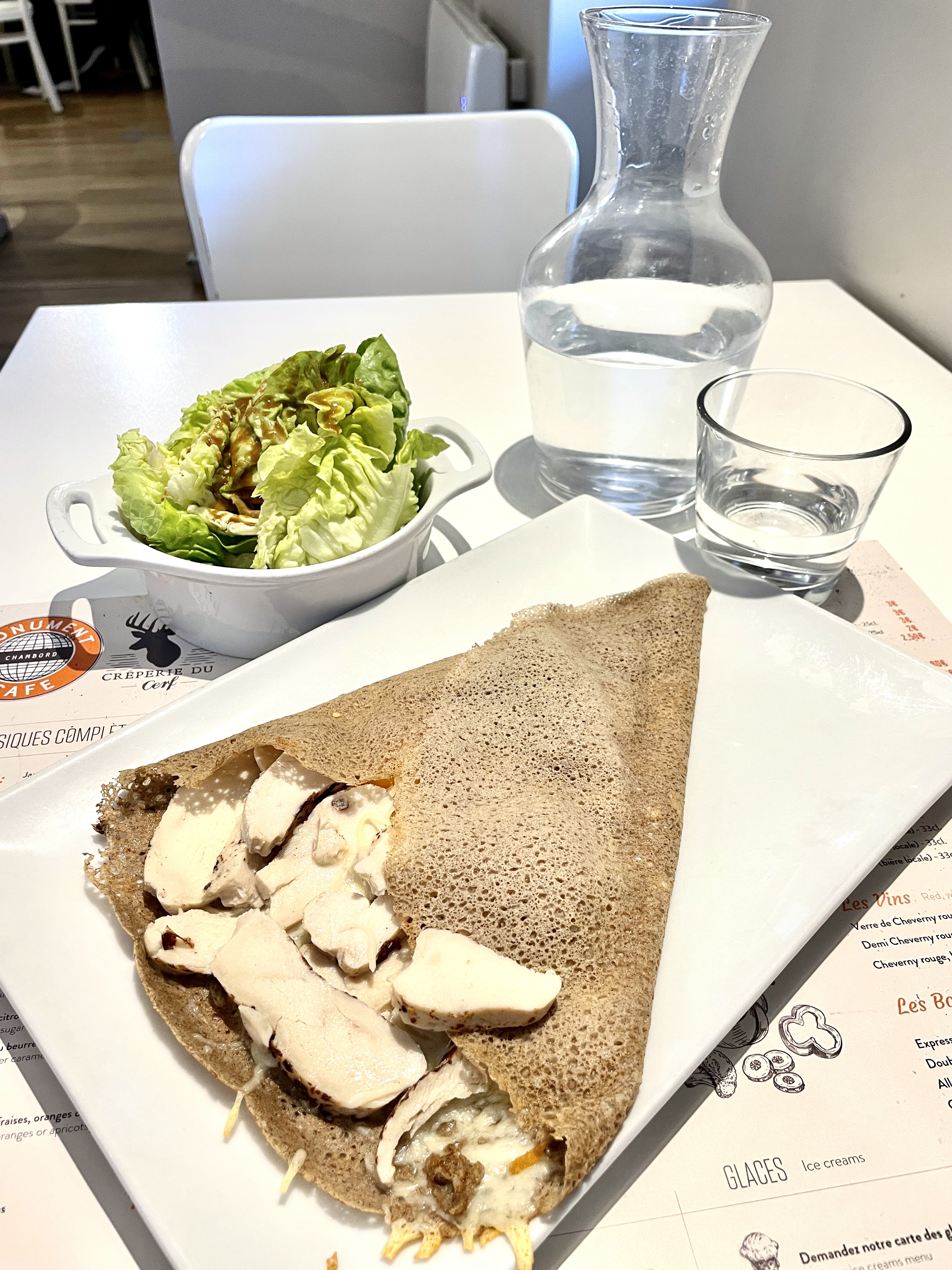 C'était un repas décontracté après avoir visité Chambord. Cet endroit est juste à côté de Chambord. Il y avait aussi des gens qui attendaient dehors. J'ai une galette de poulet. C'était la première fois que je mangeais une crêpe avec un œuf. Grâce aux gens qui y travaillent, j'ai compris mon français.