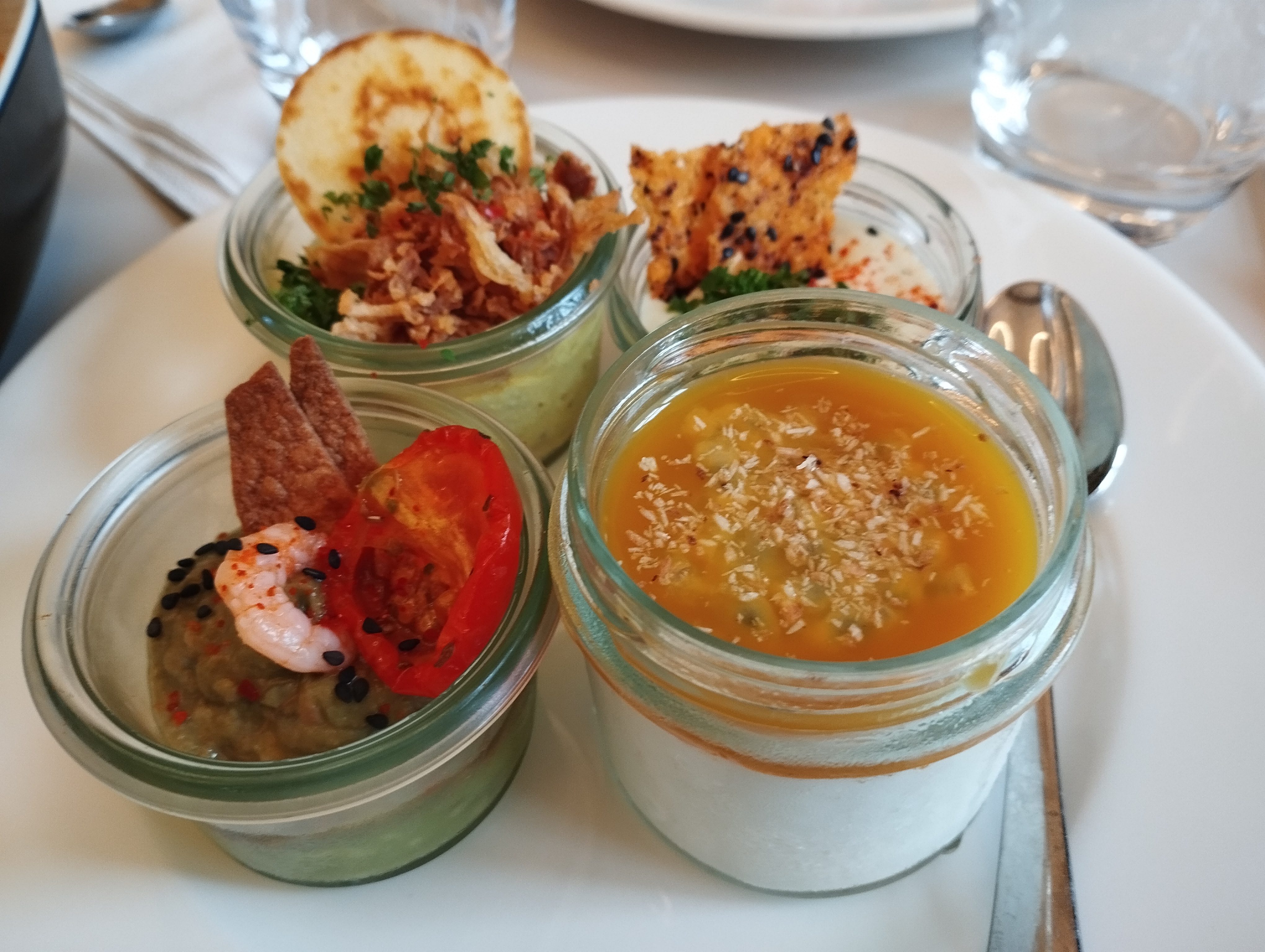 Très bonne surprise pour un lieu touristique. Menu découverte avec un plat et 4 verrines pour 17 euros et tout était vraiment très bon avec du goût (verrines : en entrée, crème de petit pois ; salade de pâtes au pesto, en dessert mousse au chocolat ; crème de mangue ; le plat : risotto champignons parmesan).