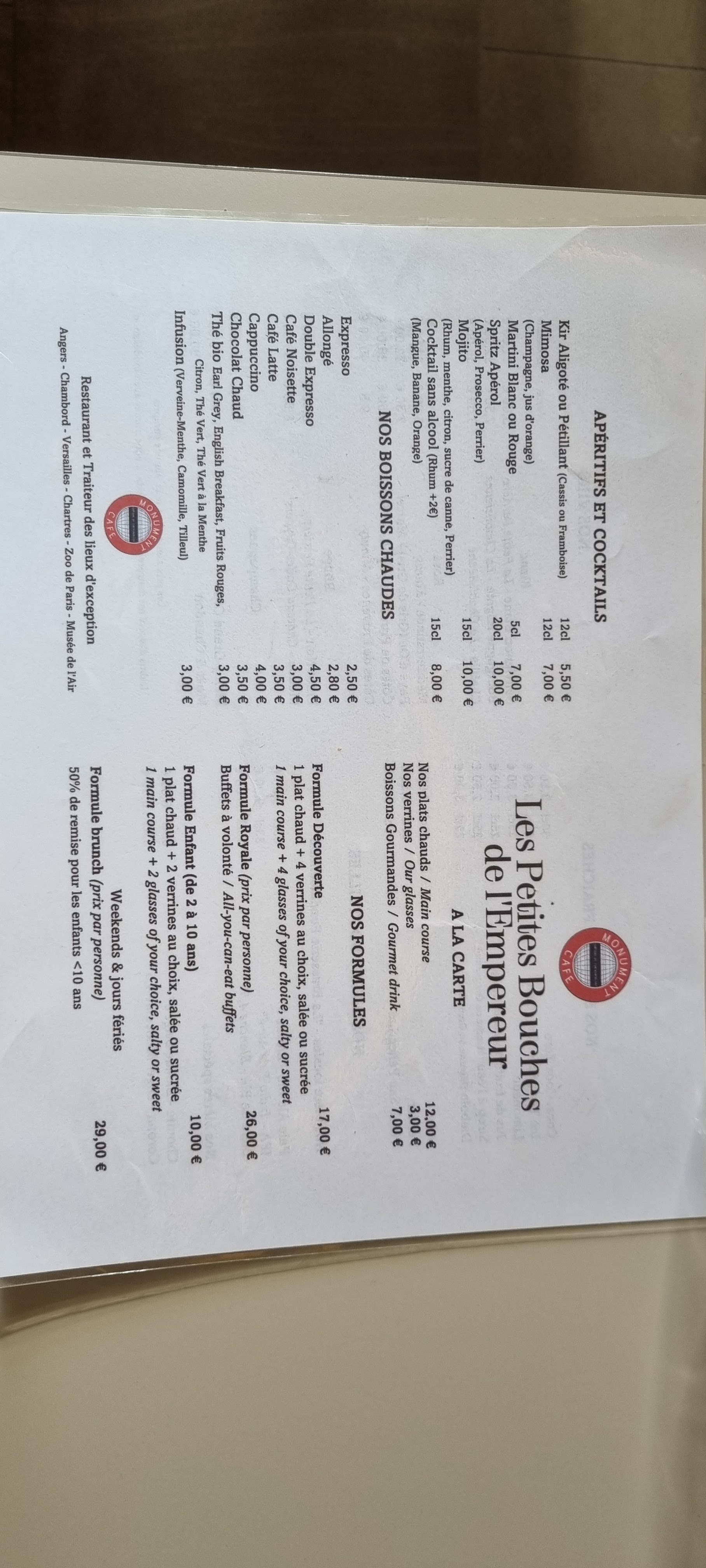 Le brunch propose un choix limité d'une cuisine en réalité très médiocre niveau d'une cantine bon marché pour un prix excessif 32 € par personne. De plus les boissons en self service dans le frigo ne sont pas comprises dans la formule bruch et facturées au prix d'un bar en terrasse dans le centre de Paris sans que cela soit signalé ou affiché. Service peu aimable où tout est fait pour limiter de se reservir, mais c'est tellement mauvais que ce n'est pas la peine de se donner tant de mal pour ça. Une arnaque à touristes. On paie cher pour manger un morceau au Château de Fontainebleau, ce qui n'est pas indispensable.